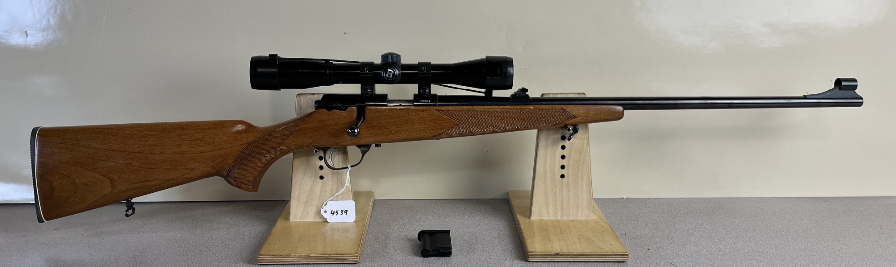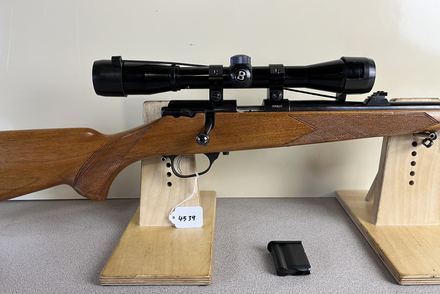 CONDITION: G - VG OVERALL. BORE F - G. SPECS: 22IN BBL W/ IRON SIGHTS. EXTRAS: BUSHNELL SHARP SHOOTER 4X32 SCOPE. DUPLEX CROSSHAIR RETICLE. 1X MAG. CLEAR LENS. S/N: 005631.