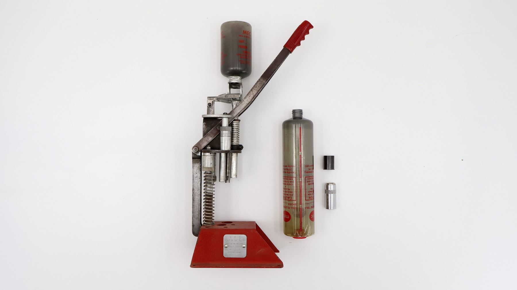 LOT INCLUDES (1) MODEL 400 12 GA. SHOT SHELL PRESS WITH (1) COPY OF INSTRUCTION MANUAL, (2) POWDER / SHOT BOTTLES, ONE IS CRACKED & TAPED ALONG TOP, ETC., NO POWDER BAR OR POWDER BUSHING, MAY REQUIRE ADJUSTMENTS AND/OR MAY NOT BE COMPLETE. SEE PHOTOS.
