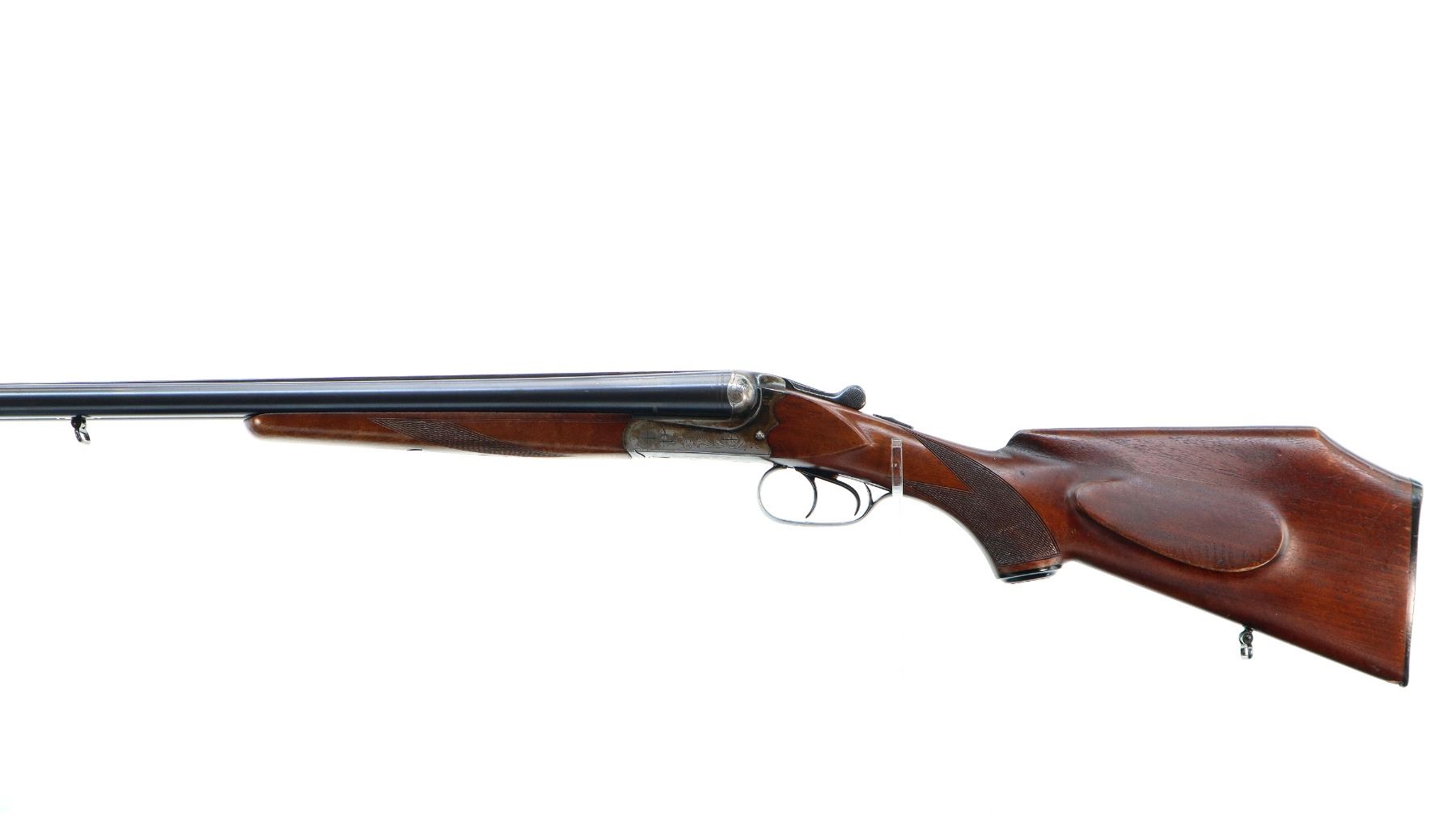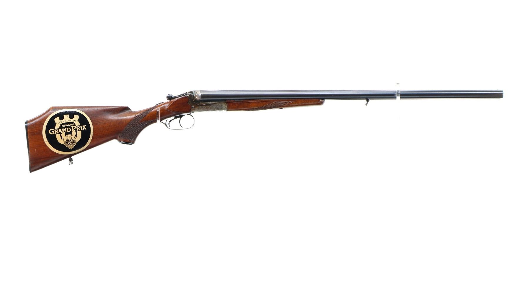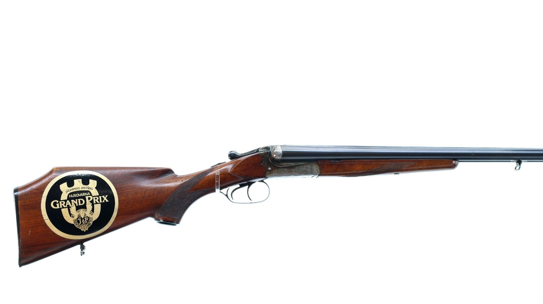 Main Description: Brass bead, blued barrels with raised rib, engraved colour case hardened receiver, automatic safety, extractor, cocking indicators, double triggers. Two piece wood stocks, checkered forearm and pistol grip, European cheek rest, modified raised comb, checkered black polymer butt plate, stock chipped at toe, grip cap, Husqvarna sticker on right side of stock, sling swivels
