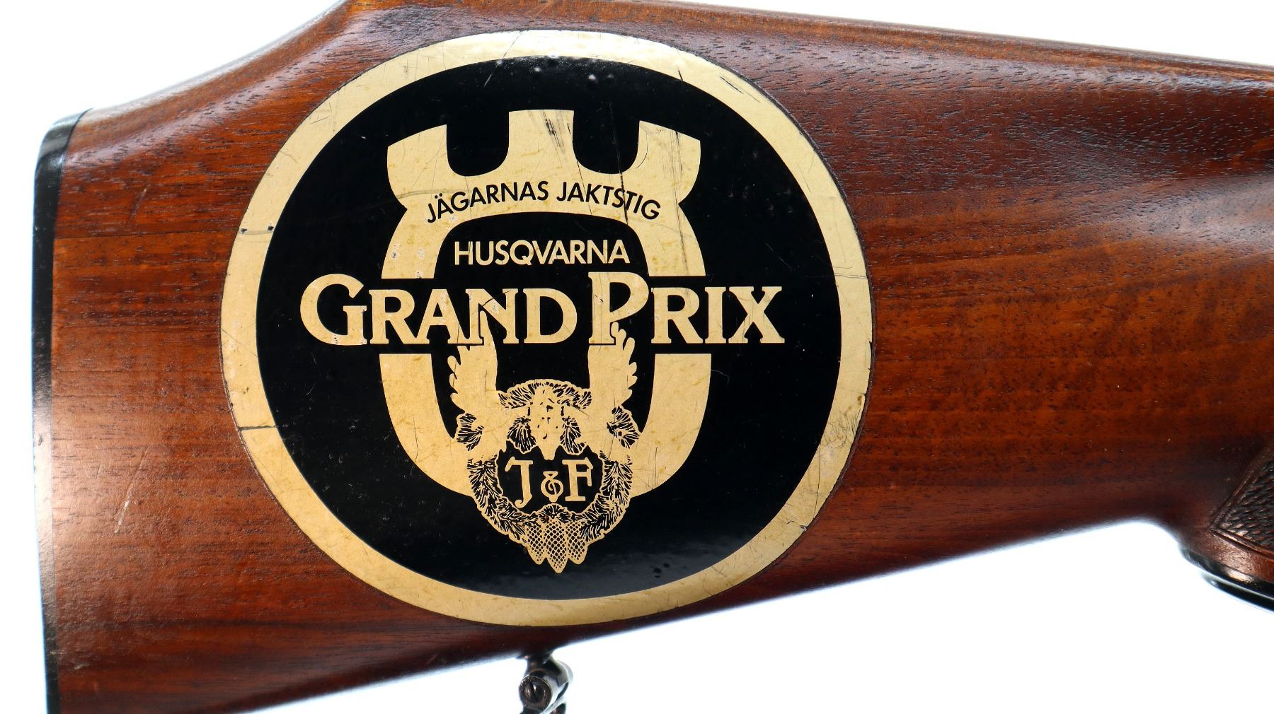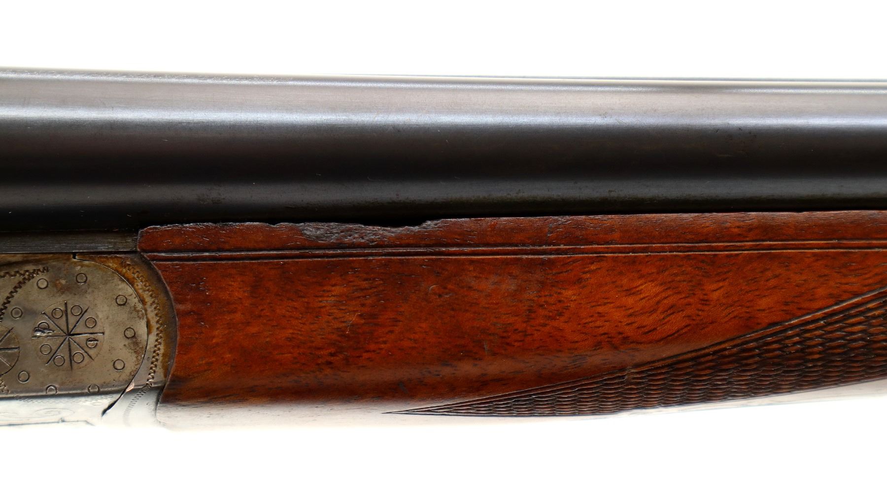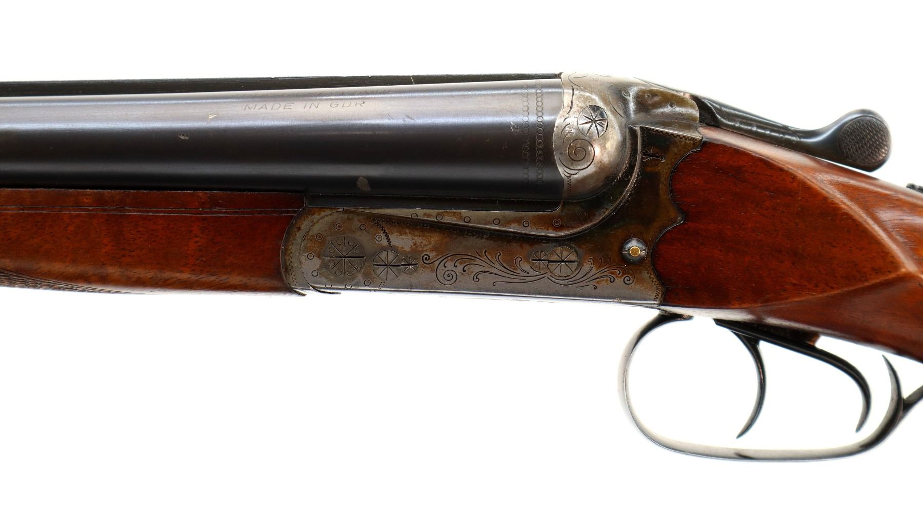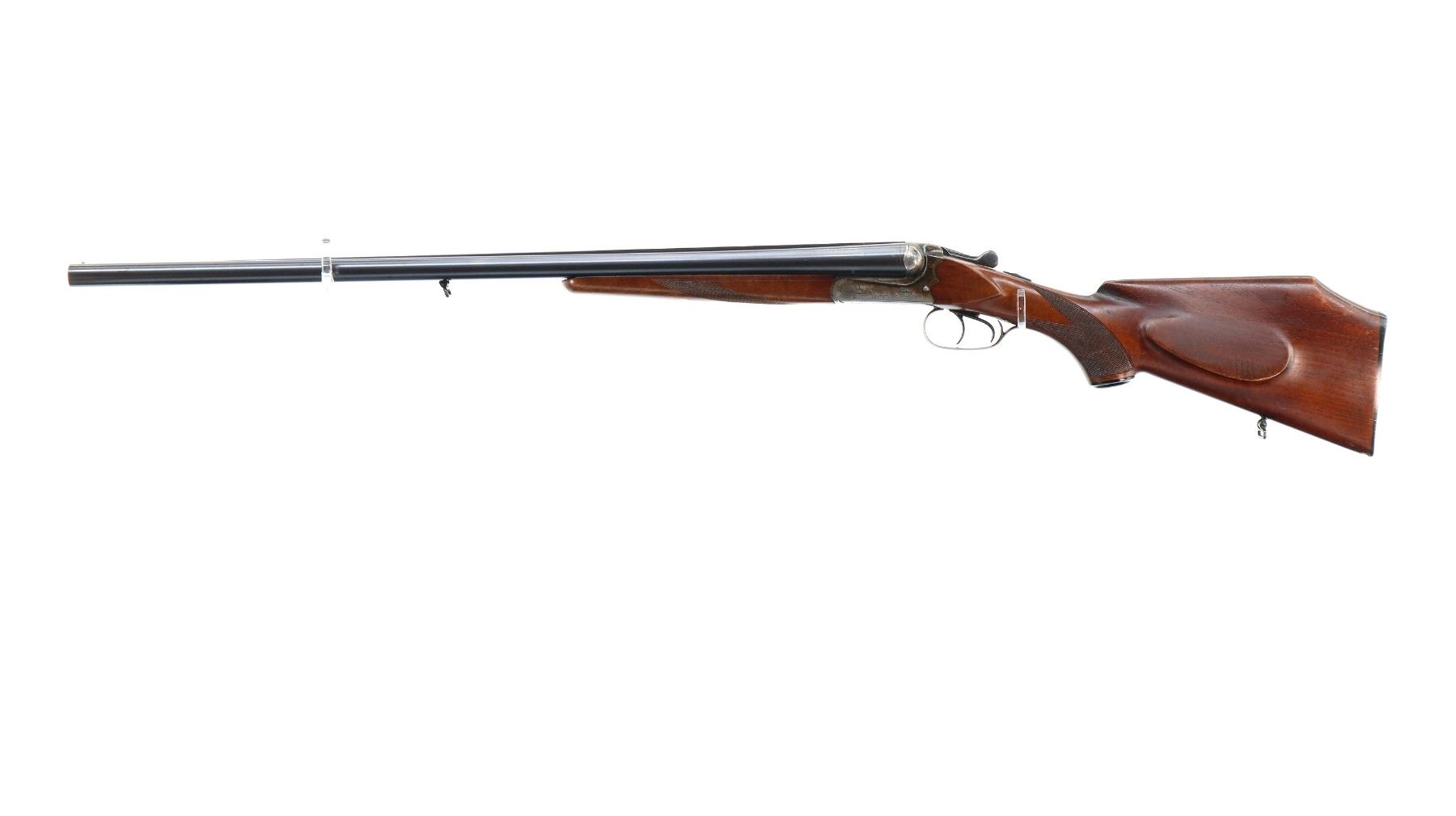 Main Description: Brass bead, blued barrels with raised rib, engraved colour case hardened receiver, automatic safety, extractor, cocking indicators, double triggers. Two piece wood stocks, checkered forearm and pistol grip, European cheek rest, modified raised comb, checkered black polymer butt plate, stock chipped at toe, grip cap, Husqvarna sticker on right side of stock, sling swivels