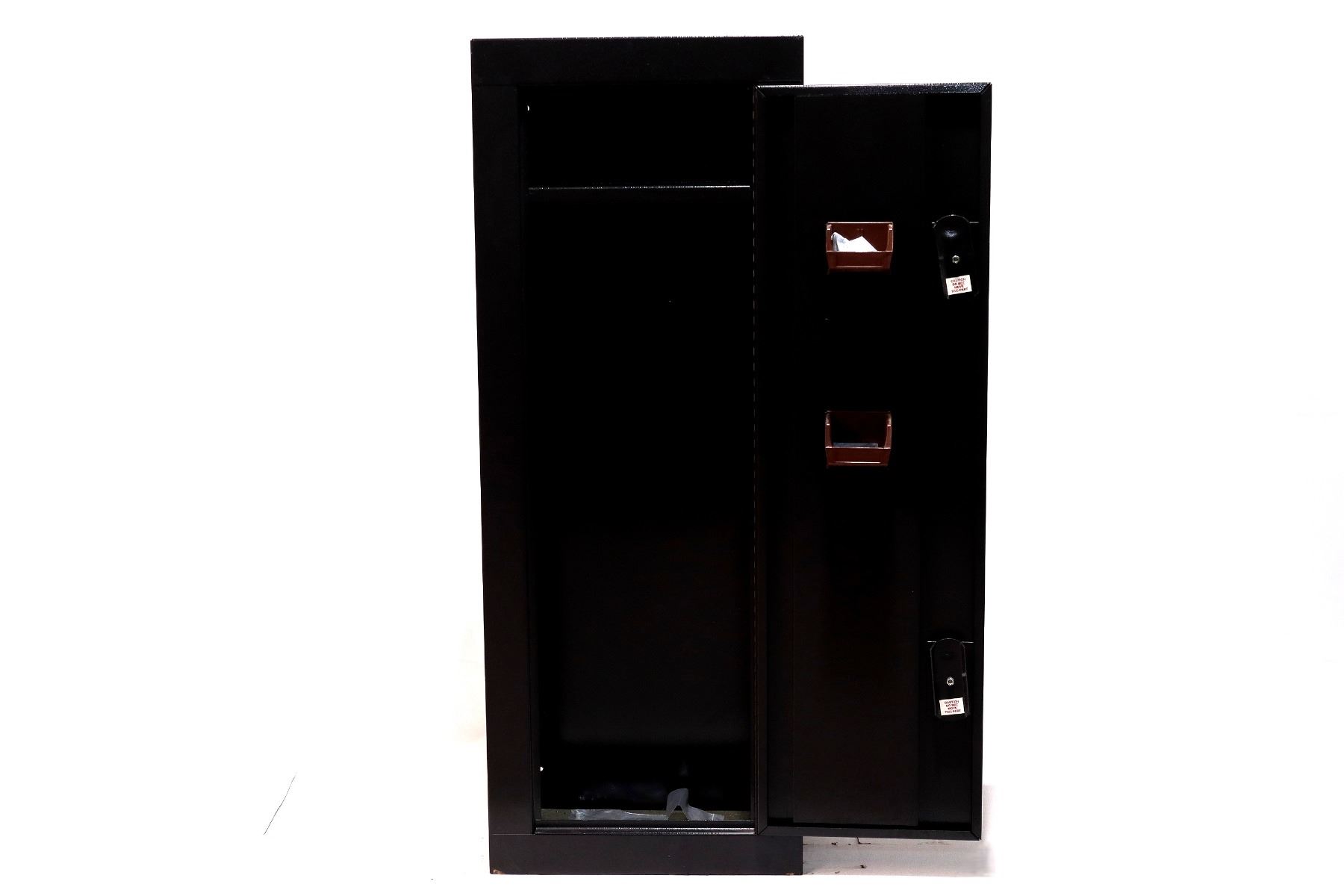 LOT INCLUDES; (1) BLACK METAL GUN CABINET, DOUBLE LOCK, WITH 2 KEYS, FOAM BARREL RESTS, (1) FOAM BOTTOM PAD, (1) SHELF, MOUNTING HARDWARE, (2) PLASTIC BINS, APPROX. 21"X10"X55 1/4", LIGHT WEAR & TEAR, SEE PHOTOS,*PICK UP ONLY, NO SHIPPING*.
