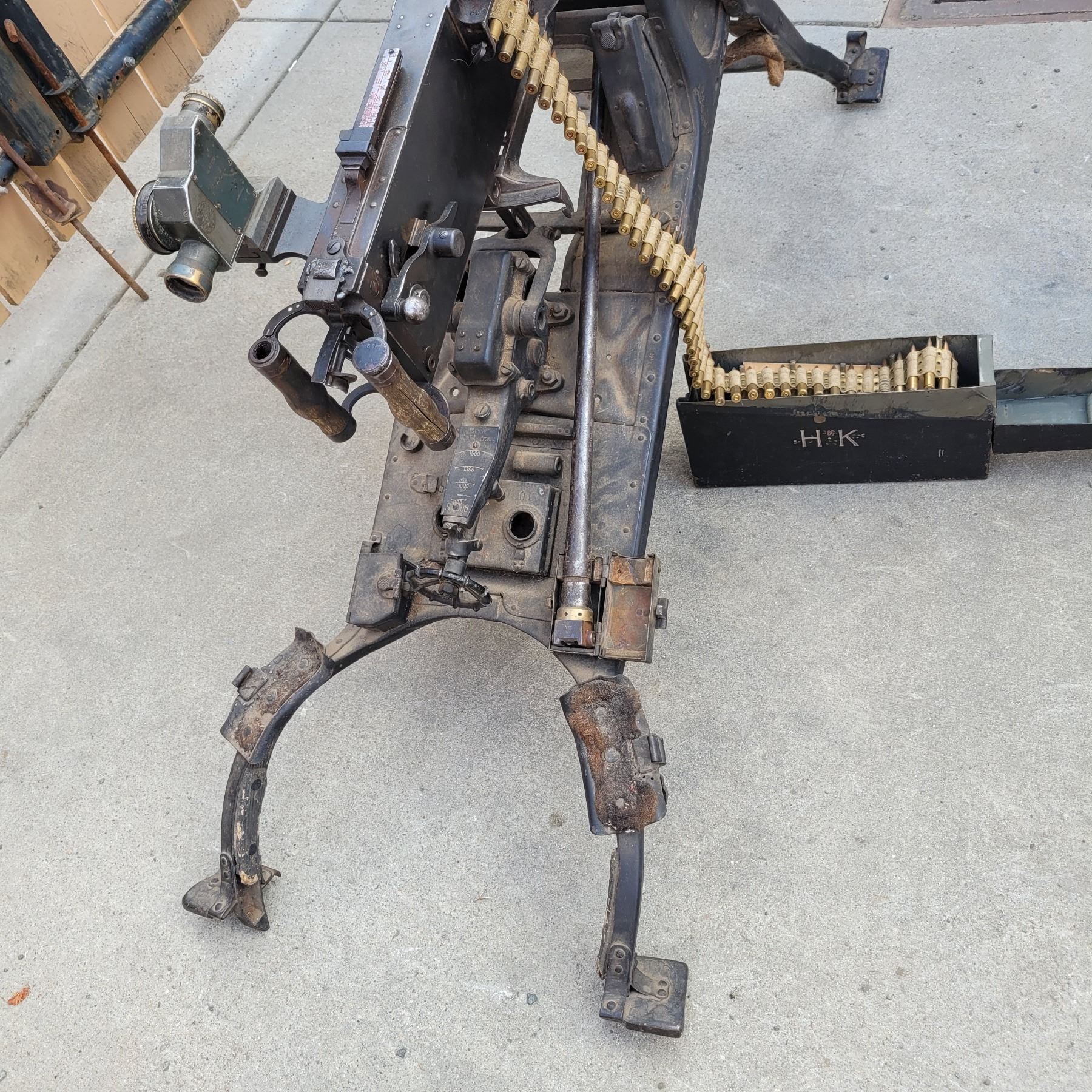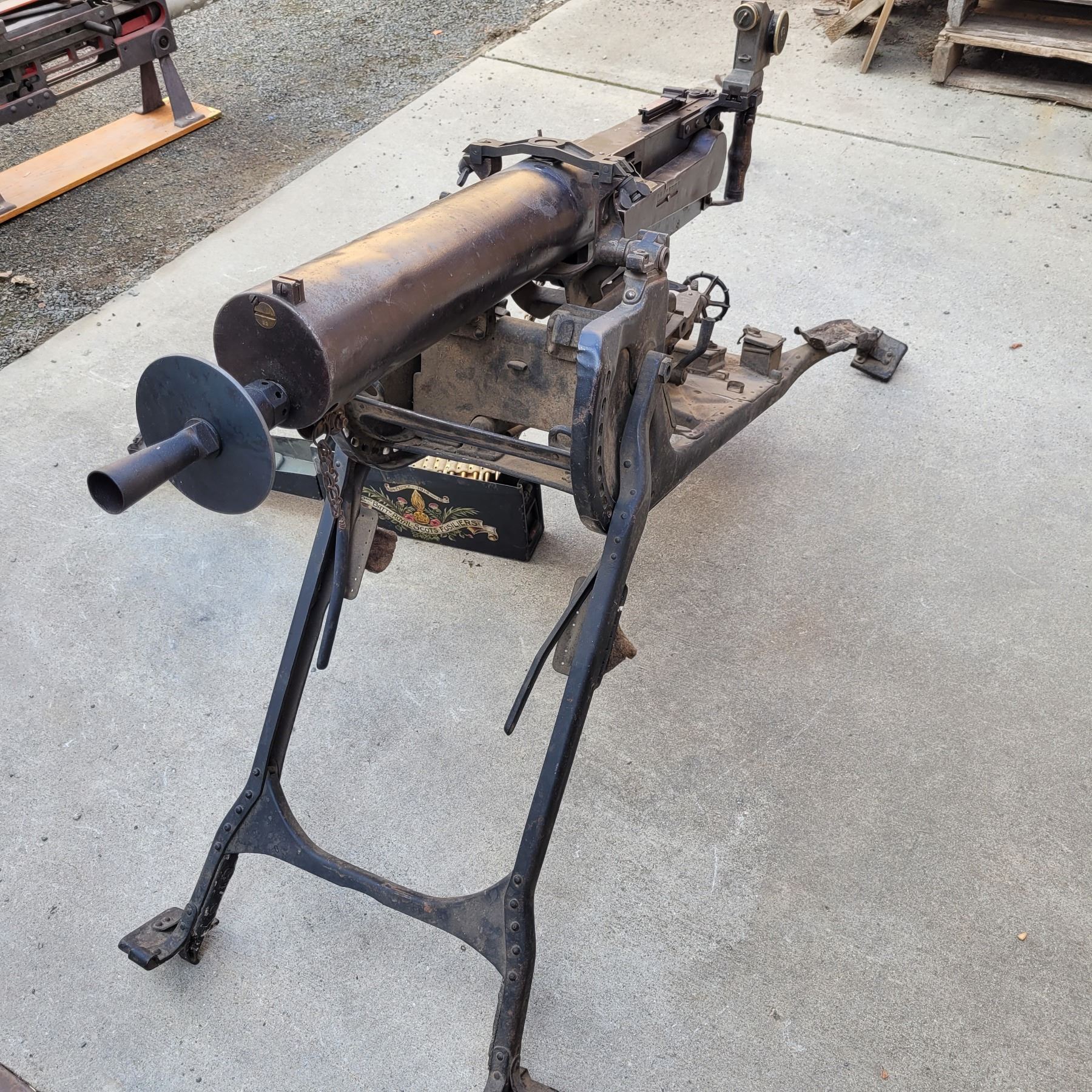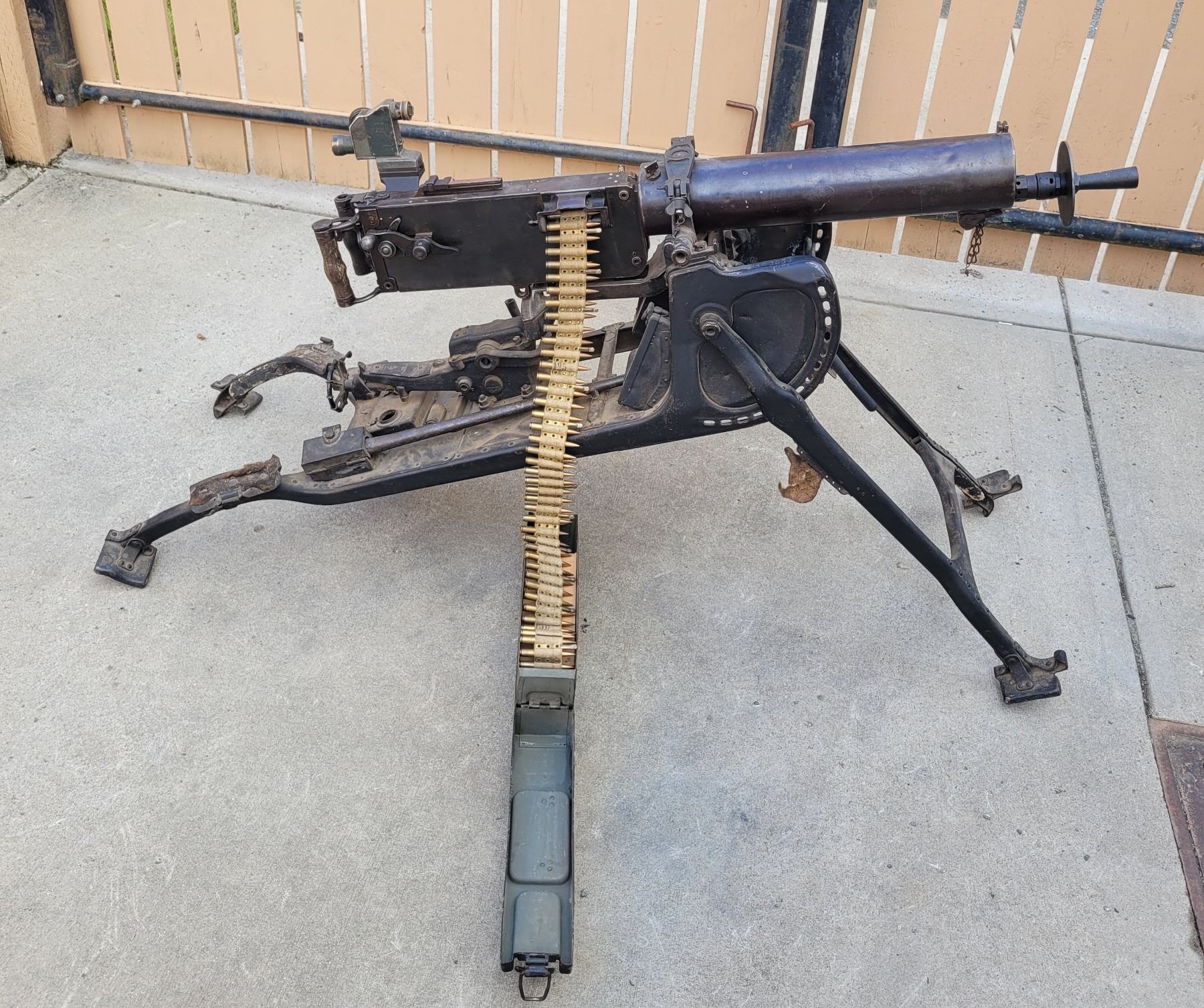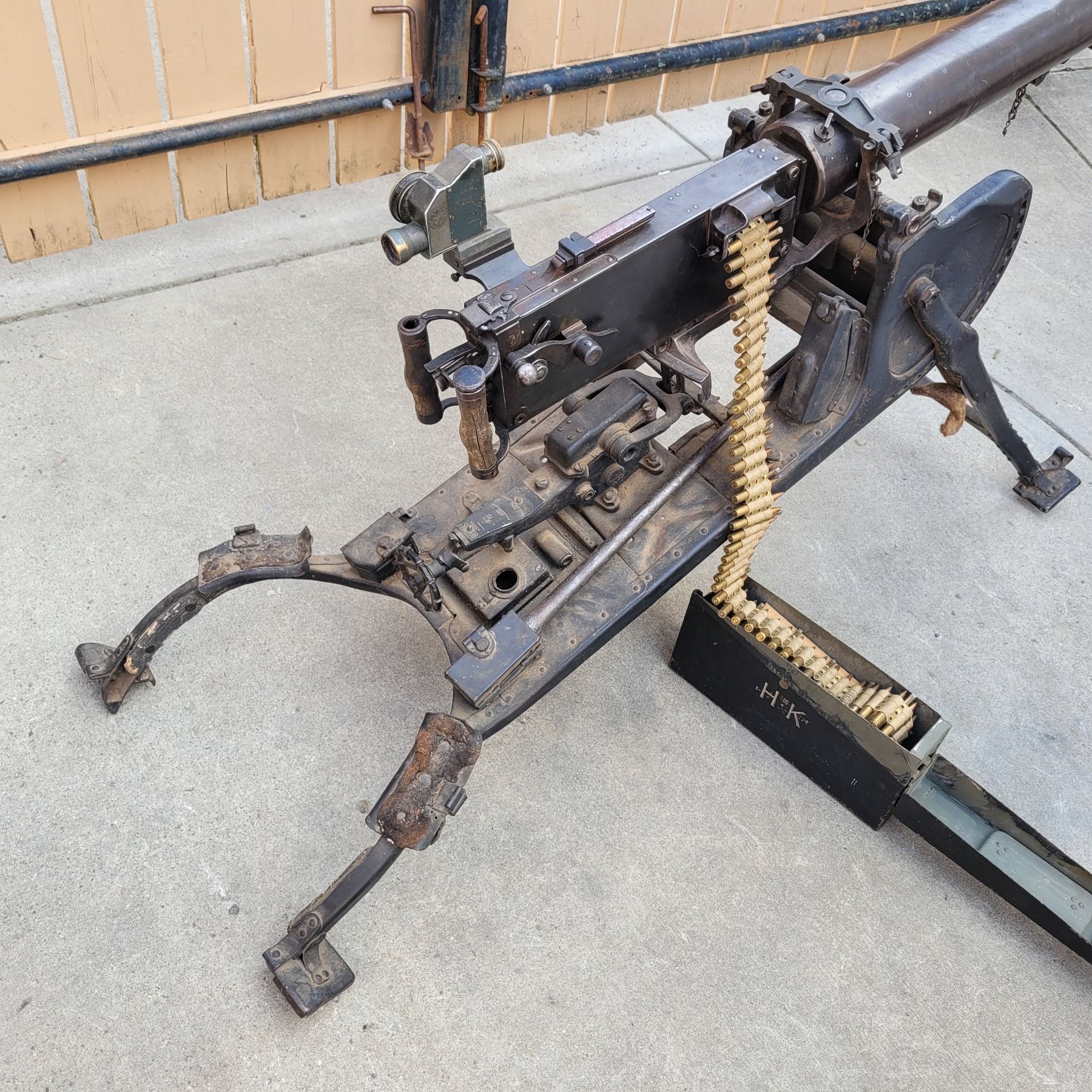 This is an original deactivated gun complete with the original sled and ammo can.