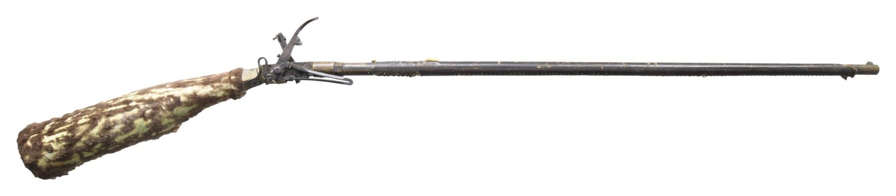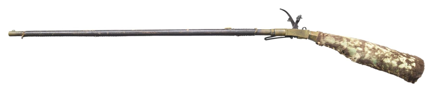 Cal. about 38. NSN. Bbl. 32 1/2" smoothbore. Blade front sight. Notch rear sight. Brass flintlock that appears to be of Middle Eastern origin possibly recently made for tourists. Brass bbl., frame & stock. Stock has fur wrapping. Bbl. has old leather wrapping. CONDITION: metal is a dull yellow patina with scattered oxidation & dings. Bbl. & stock are loose. Lock does not appear to be functional. Good bright smoothbore with some light oxidation. (02-24426/MJC). ANTIQUE. $800-1500.