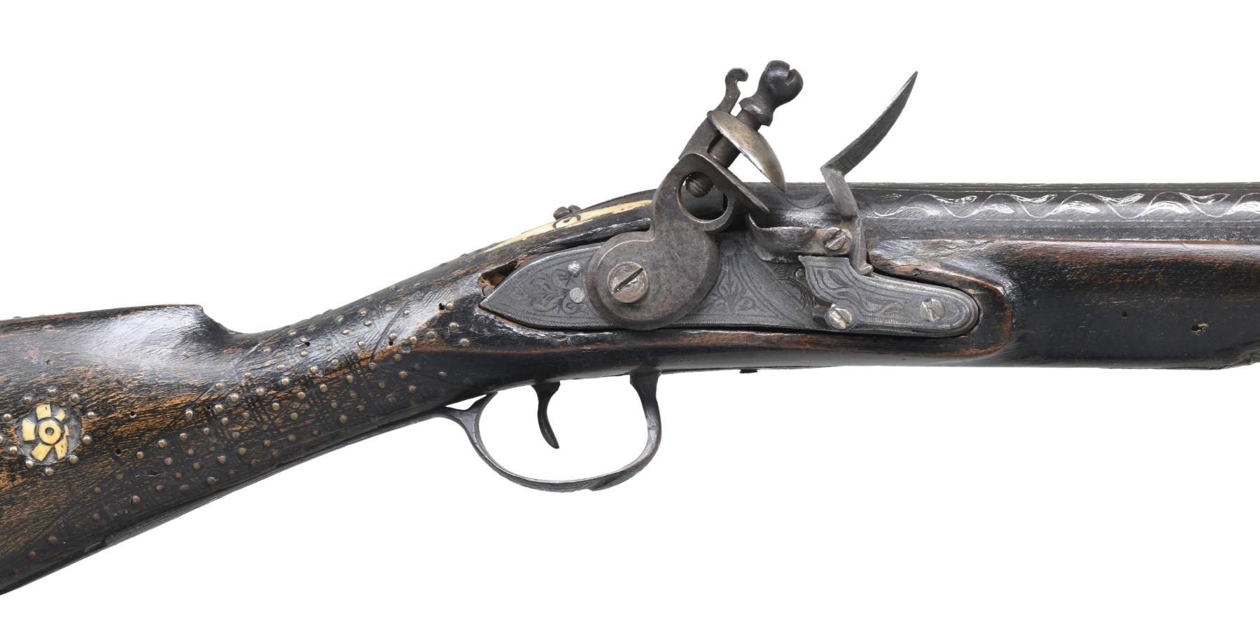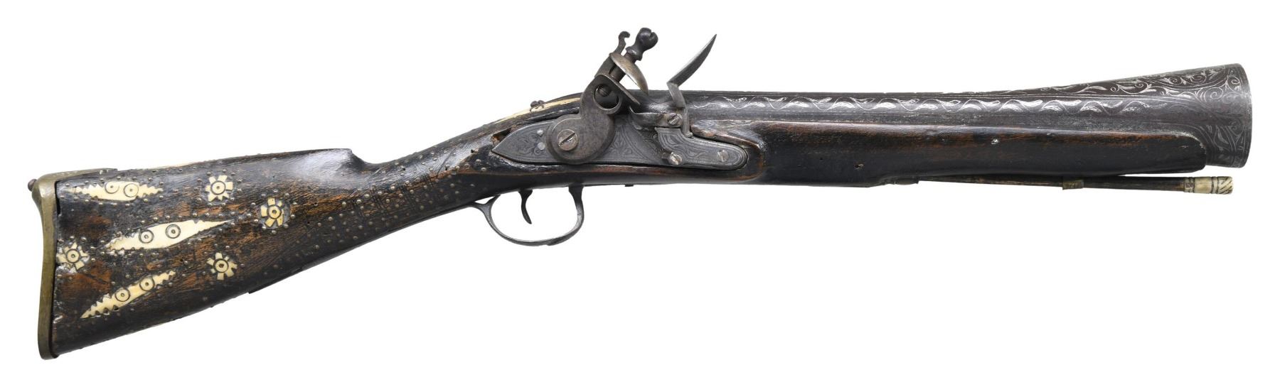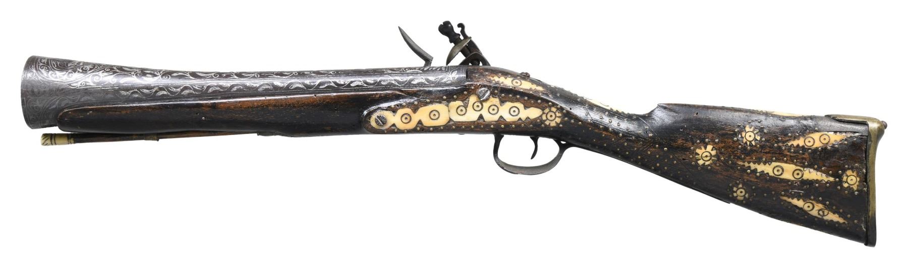 Cal. 2 3/8". S# NSN. Bbl, 14" silver inlaid iron with a 2 3/8" bell at the muzzle. The barrel shows numerous and artistically rendered foliate inlaid decorations. The lock has similar decoration as does the trigger guard. Heavy brass buttplate and brass ramrod thimble. The entry thimble is silver with engraved decoration. The stock has several elongated bone inlays with innumerable tiny brass tacks. Bone tipped wooden ramrod. CONDITION: iron has a dark ancient patina and many silver inlays are worn. Lock holds both full and half cock but the spring is almost non-functional. Stock shows significant wear and minor losses but no major faults. PROVENANCE: from the renowned collection of quality sporting arms from Lewis Drake together with inventory of Lewis Drake Associates. (01-26144/BF). ANTIQUE. $300-500.