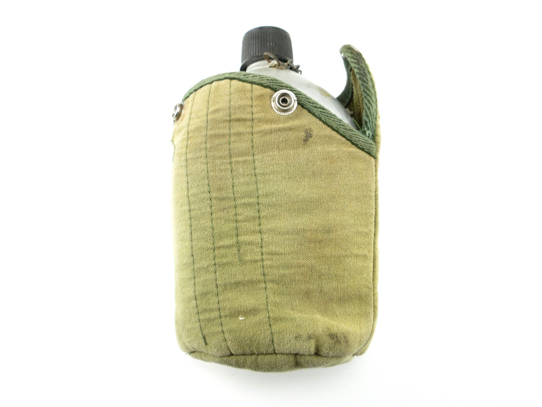 (1) ALUMINUM CANTEEN WITH CANVAS COVER, CANTEEN MARKED: "TAIWAN" ON BOTTOM, WITH CAP, NO VISIBLE MARKINGS ON COVER, SHOWS AGE / WEAR. SEE PHOTOS.