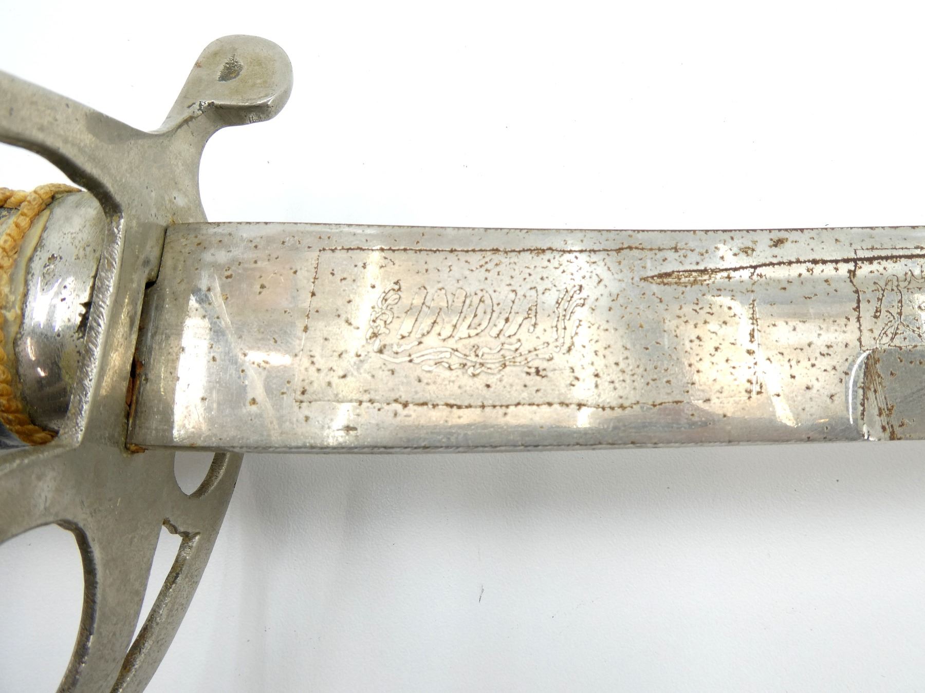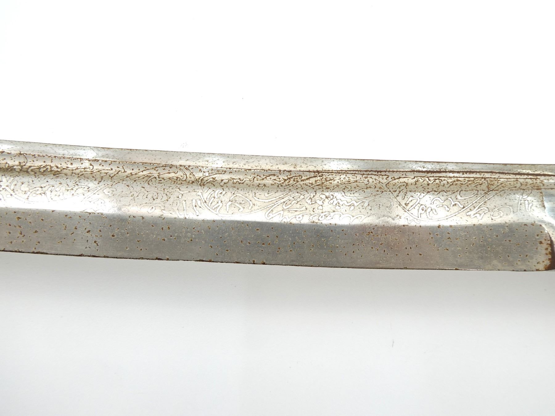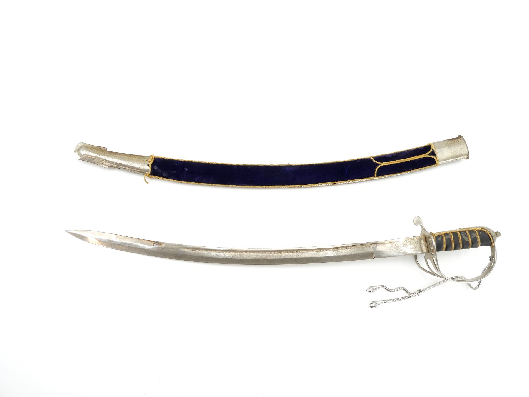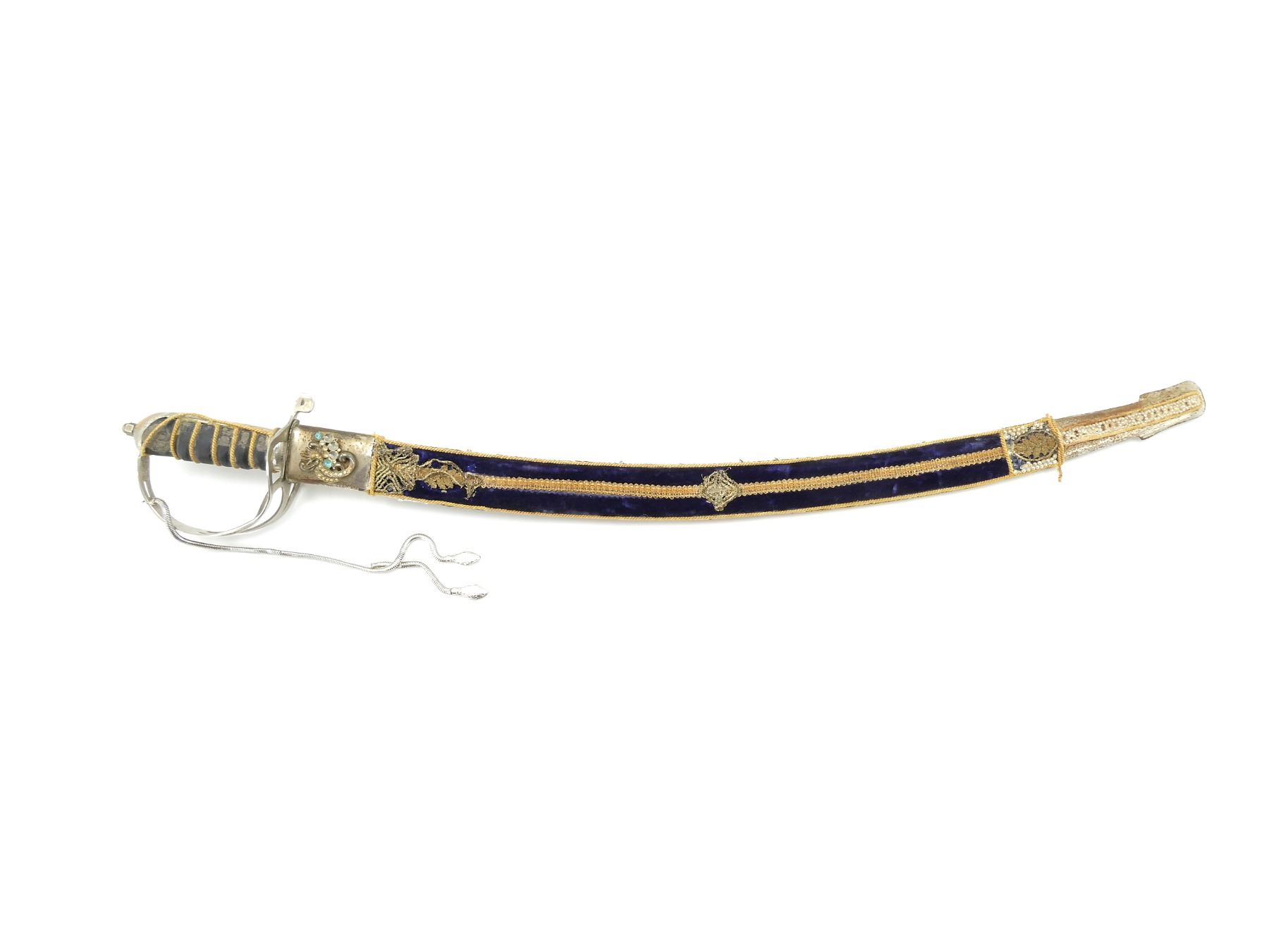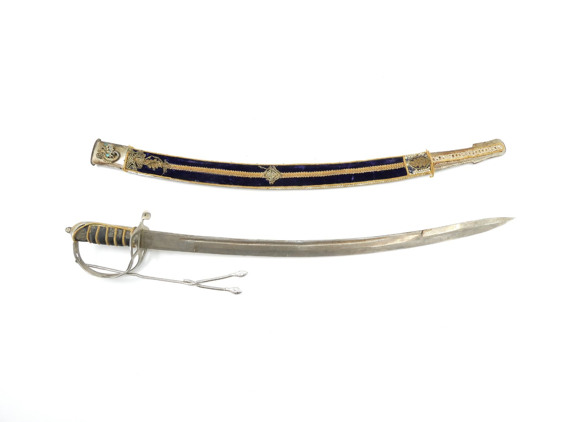 (1) CURVED SINGLE-FULLERED BLADE WITH DOUBLE-EDGED TIP, MADE IN INDIA, RICASSO MARKED: "INDIA", BLADE MARKED WITH VARIOUS ACID ETCHINGS / SCRIPT ON EITHER SIDE, DECORATIVE METAL CROSS-GUARD / HILT, NO VISIBLE MARKINGS, LEATHER / ROPE WRAPPED GRIP, METAL GRIP BACKING, METAL POMMEL, NO VISIBLE MARKINGS, METAL CHAIN-LIKE TASSEL WITH SNAKE HEAD DESIGN, METAL / WOOD SCABBARD WITH DECORATIVE BLUE VELVET WRAPPING, VARIOUS DECORATIVE SEQUINS / BEADS, NO VISIBLE MARKINGS, BLADE APPROX. 24.75" & OVERALL LENGTH APPROX. 30". SEE PHOTOS.
