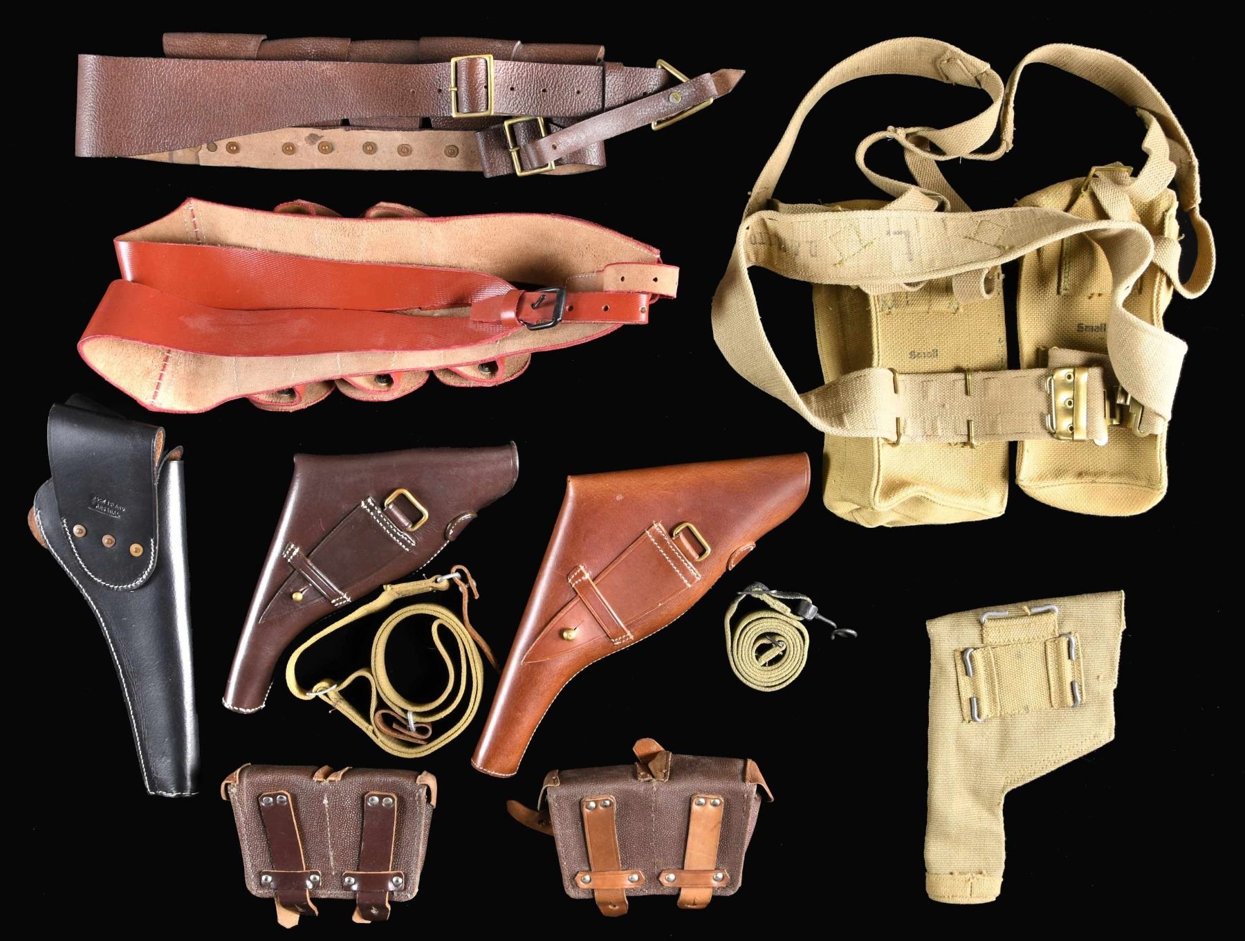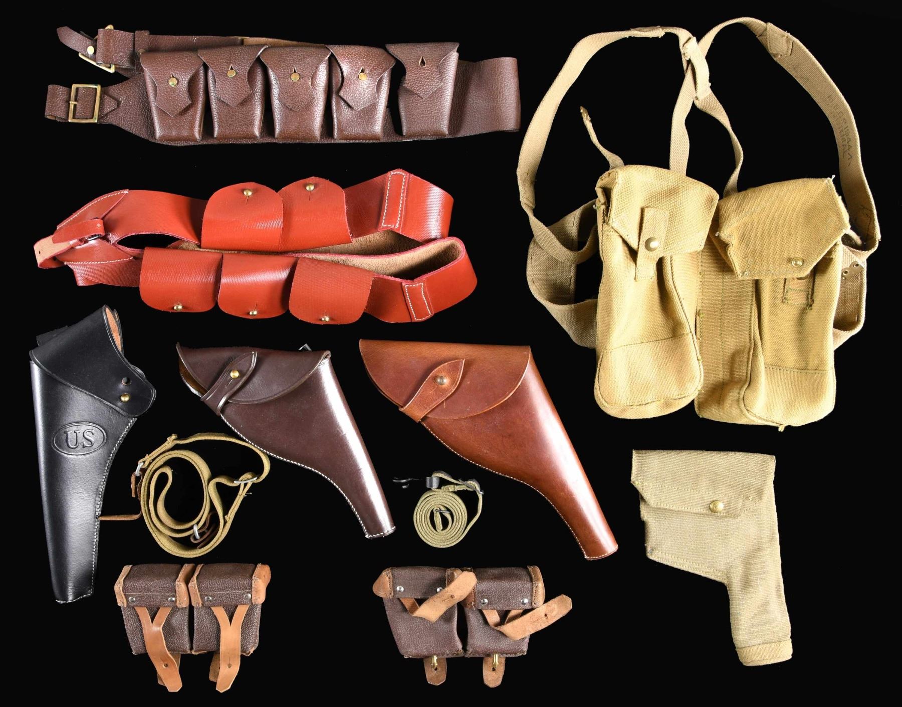 This varied lot includes 1 / Reproduction holster for a military Schofield or Colt. 1 / WWII era web holster for a Webley. 1 / Dark brown leather holster for a medium frame revolver. 1 / Russet brown leather holster for a large frame revolver. 2 / Two pocket cartridge pouches for an SKS. 1 / Leather 5 pocket bandolier belt possibly for a WWII Berthier rifle. 2 / SKS web slings. 1 / French Foreign Legion 5 pocket red leather bandolier. 1 British web belt with shoulder straps supporting 2 pouches possibly for Sten gun magazines. CONDITION: all items generally show light wear. (02-24435/BF). $300-500.