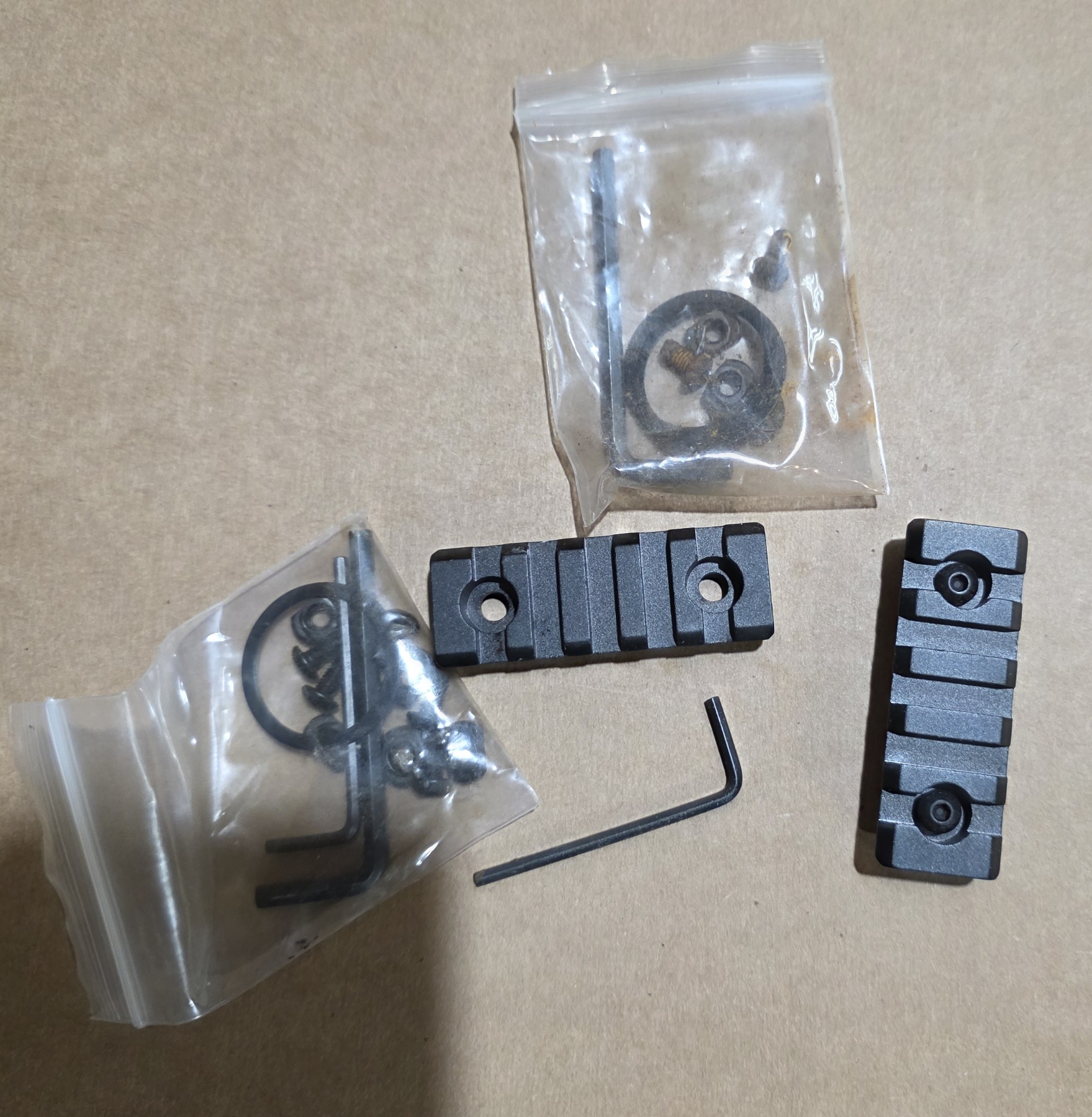 TWO MLOK RAIL SEGMENTS (5 SLOTS), MLOK SCREWS AND NUTS, BARREL NUT SHIMS.
