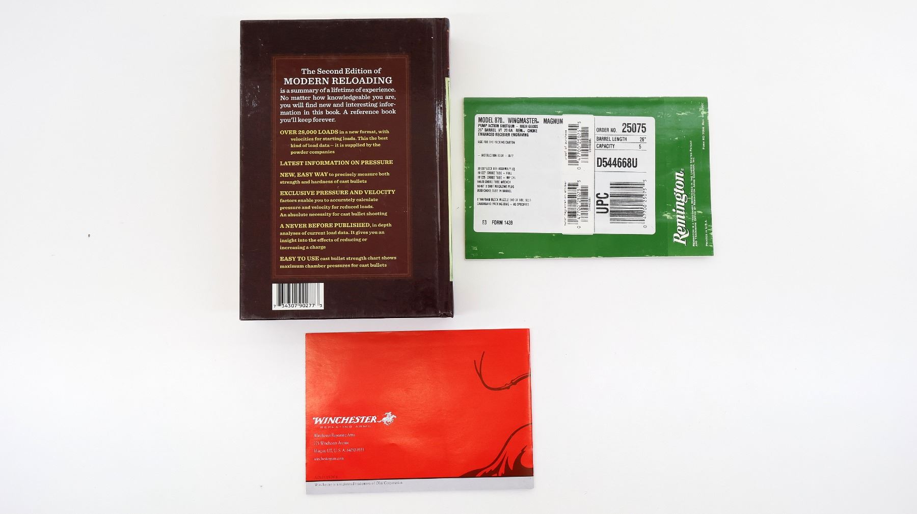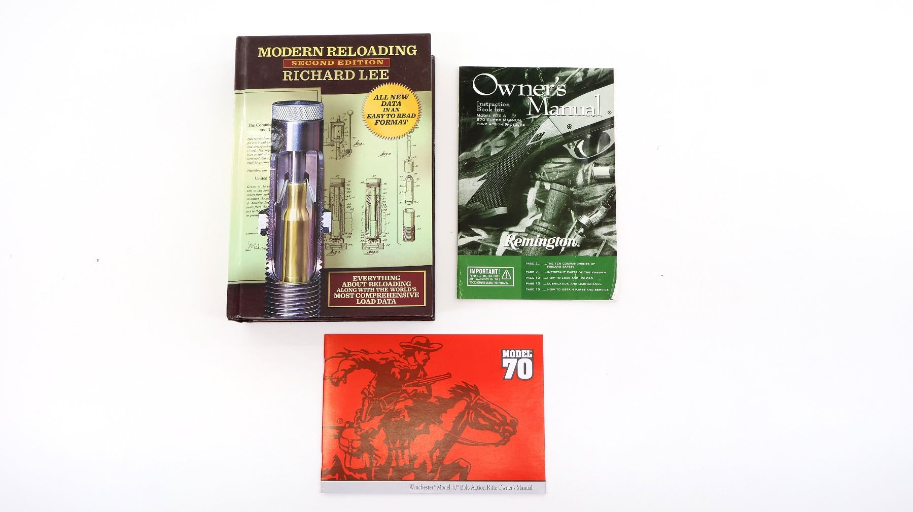 LOT INCLUDES; (1) "MODERN RELOADING" 2ND EDITION, BY RICHARD LEE, HARD COVER, COPYRIGHT 2003, (1) "INSTRUCTION BOOK FOR: MODEL 870 & 870 SUPER MAGNUM PUMP ACTION SHOTGUNS", BY REMINGTON, SOFT COVER & (1) "MODEL 70 BOLT-ACTION RIFLE OWNER'S MANUAL", BY WINCHESTER, SOFT COVER. SEE PHOTOS.