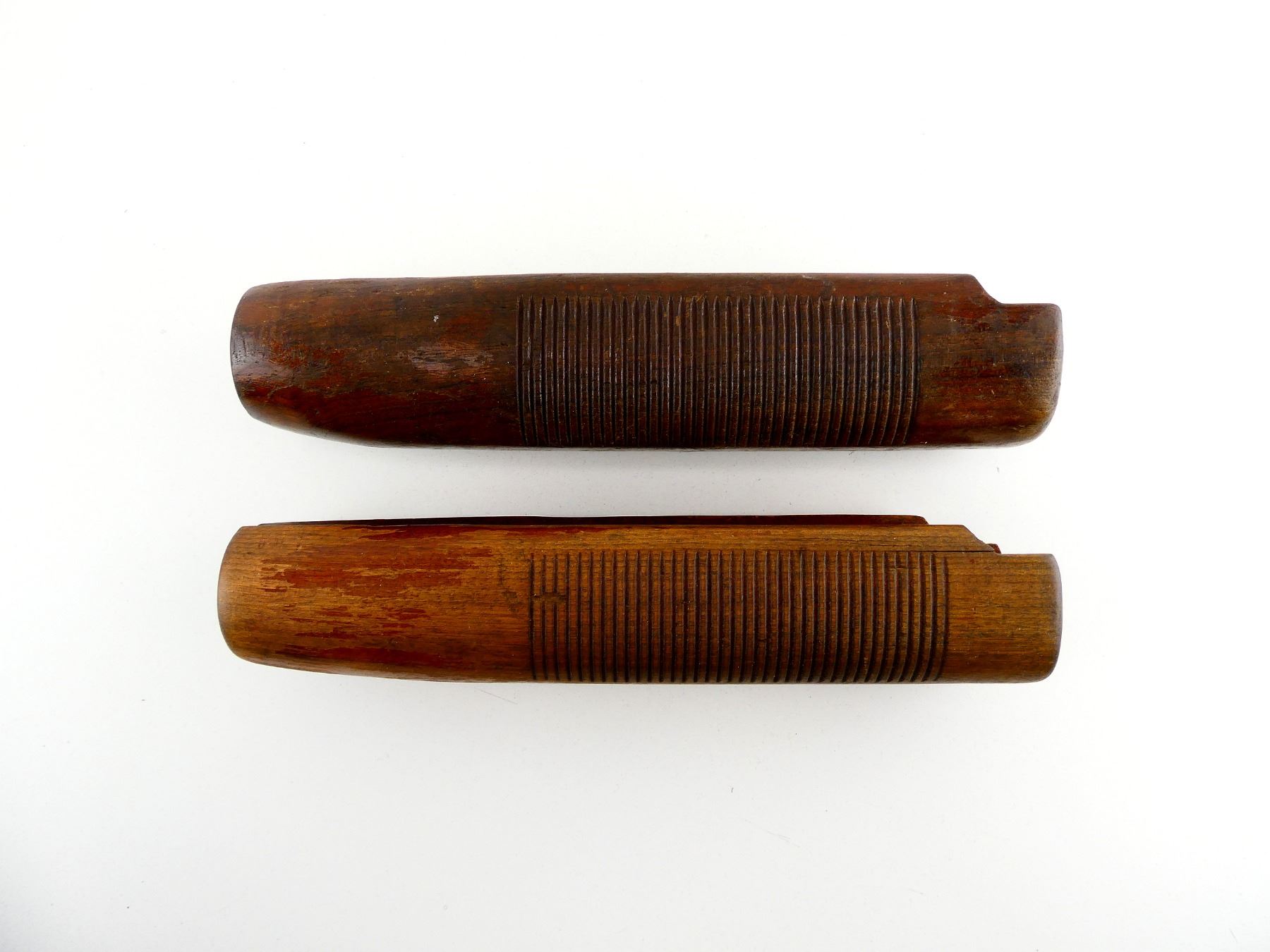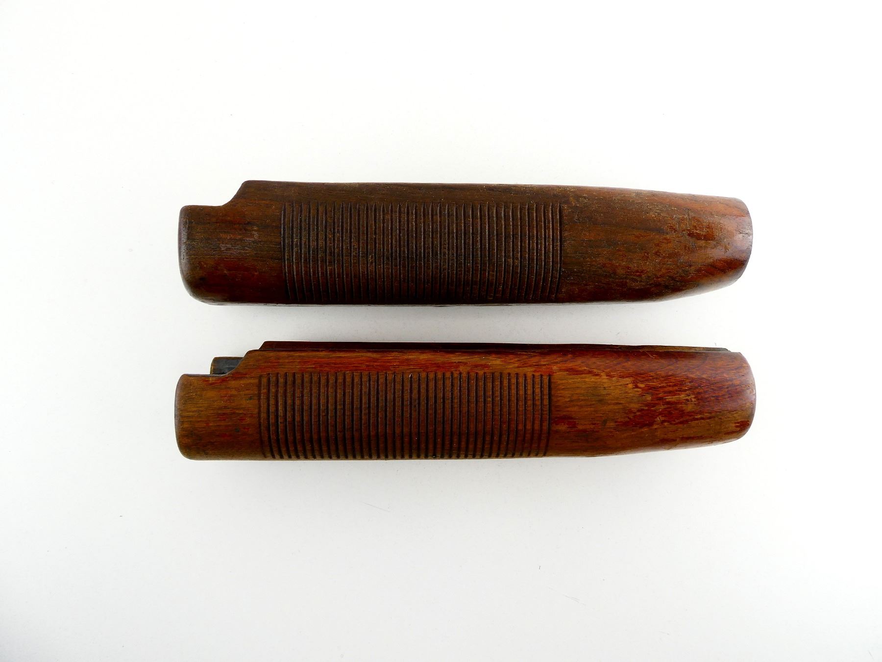 LOT INCLUDES; (2) WOODEN FORENDS, SINGLE ACTION BAR STYLE, GROOVED, UNMARKED, MAY HAVE SMALL CRACKS & CHIPS, OVERALL LENGTH APPROX. 9", SHOWS WEAR / TEAR FROM USE. MAY REQUIRE FITTING. SEE PHOTOS.