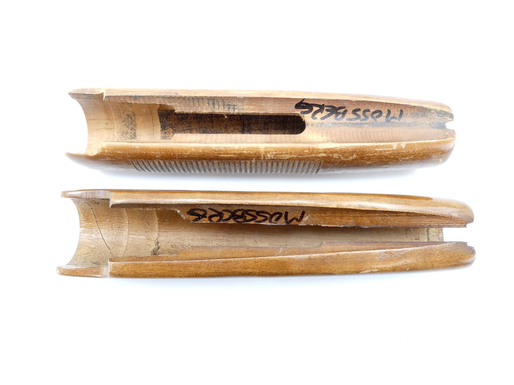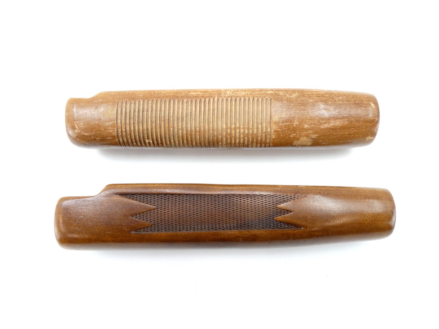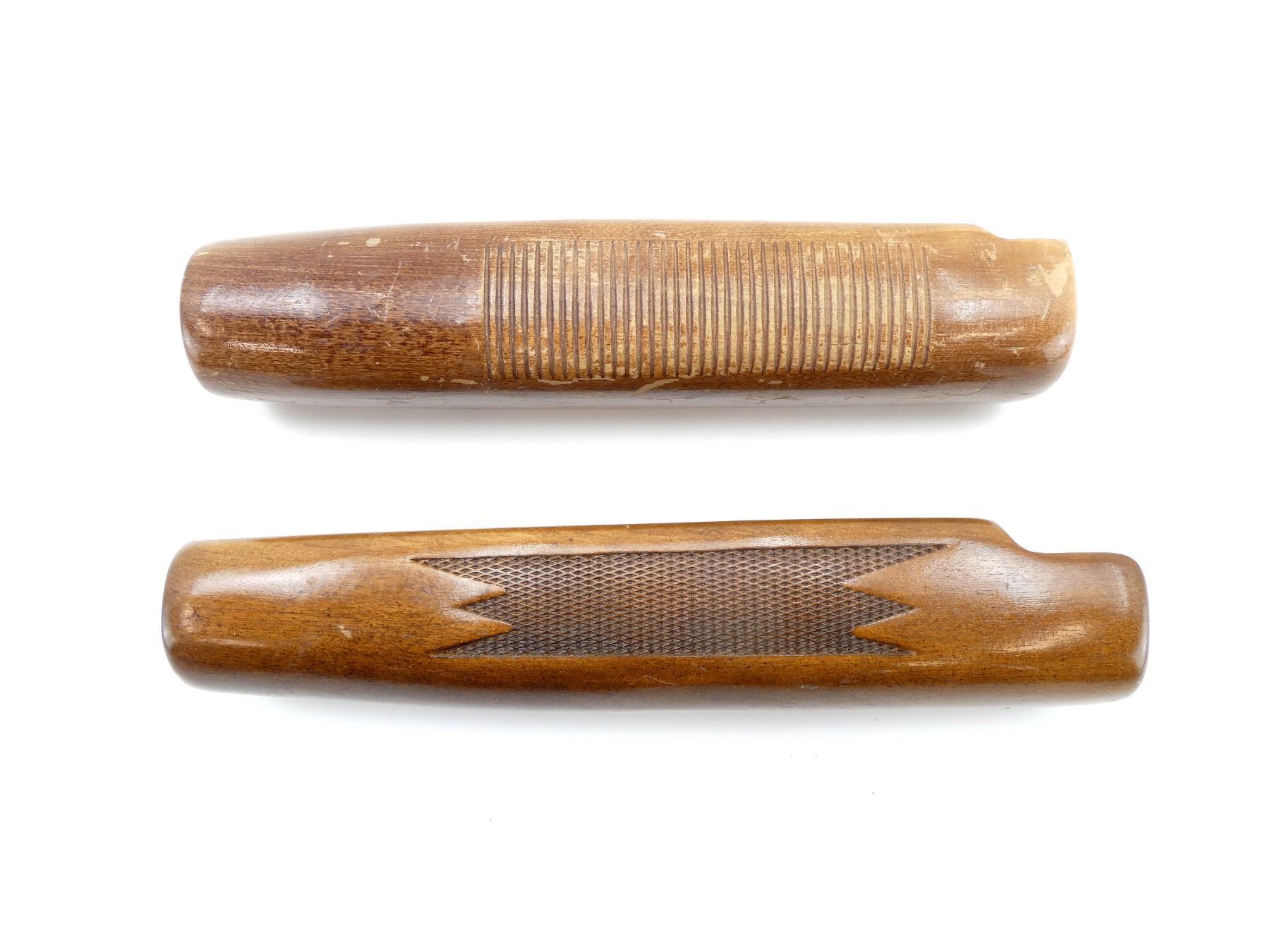LOT INCLUDES; (2) WOODEN FORENDS, ONE CHECKERED / ONE GROOVED, UNMARKED, MAY HAVE SMALL CRACKS & CHIPS, OVERALL LENGTH APPROX. 9". MAY REQUIRE FITTING. SEE PHOTOS.