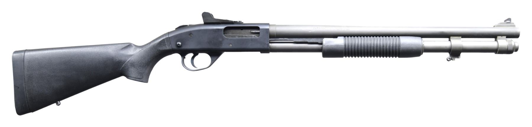 Cal. 12 Ga. 3". S# DA002022. Bbl. 20 1/2" choked mod. Ramped blade front sight with orange insert. Mossberg ghost ring rear sight. 590DA1 shotgun with factory double action trigger. Matte black action. Parkerized bbl. & mag tube. Left side of receiver has TacStar six rd. side saddle. Black synthetic stock with unmarked recoil pad, bottom mounted sling studs & grooved forend. LOP: 14 3/8". CONDITION: stock set shows scattered handling & operational wear. Metal retains 92% matte black & parkerized finishes with a couple small spots of light oxidation, some handling marks, scuffs, high edge & operational wear. Action functions properly when hand cycled. Very good plus bright bore. (25-3398/MJC). MODERN. $300-400.