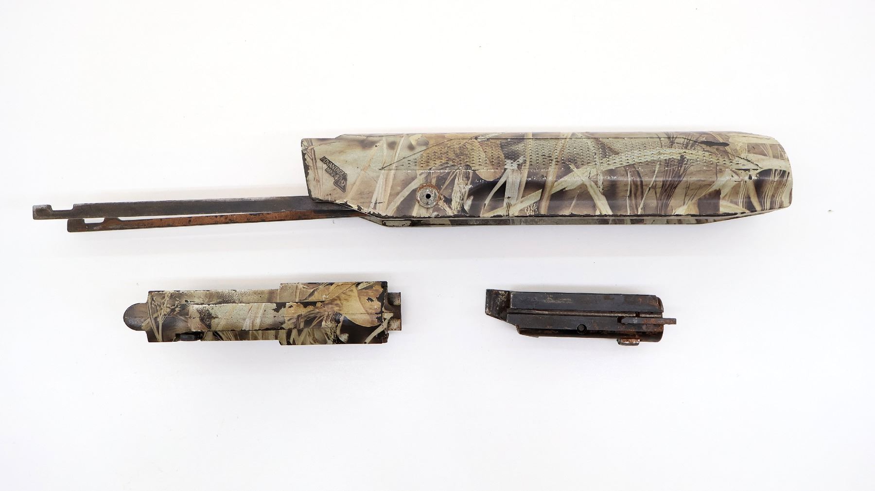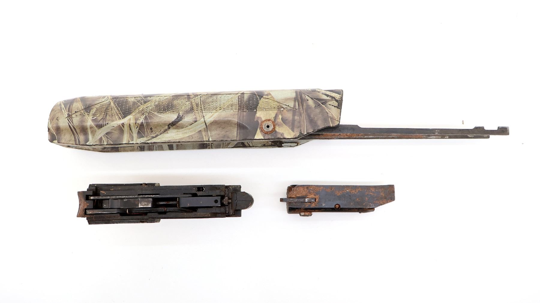 CAMOUFLAGE, LOT INCLUDES; (1) REPAIRED FOREARM, POLYMER CONSTRUCTION, OVERALL LENGTH APPROX. 14", (1) BUTT STOCK, CHECKERED, POLYMER CONSTRUCTION, OVERALL LENGTH APPROX. 12", (1) TRIGGER MECH., APPEARS COMPLETE, (1) BOLT, APPEARS COMPLETE, (1) MAG TUBE WITH CAP, ETC. MAY REQUIRE FITTING SEE PHOTOS.