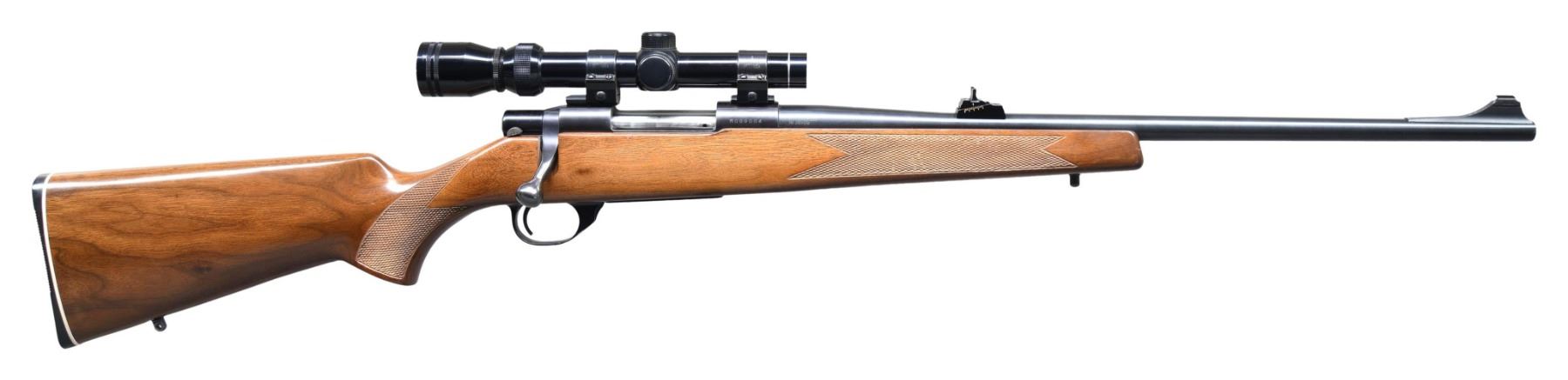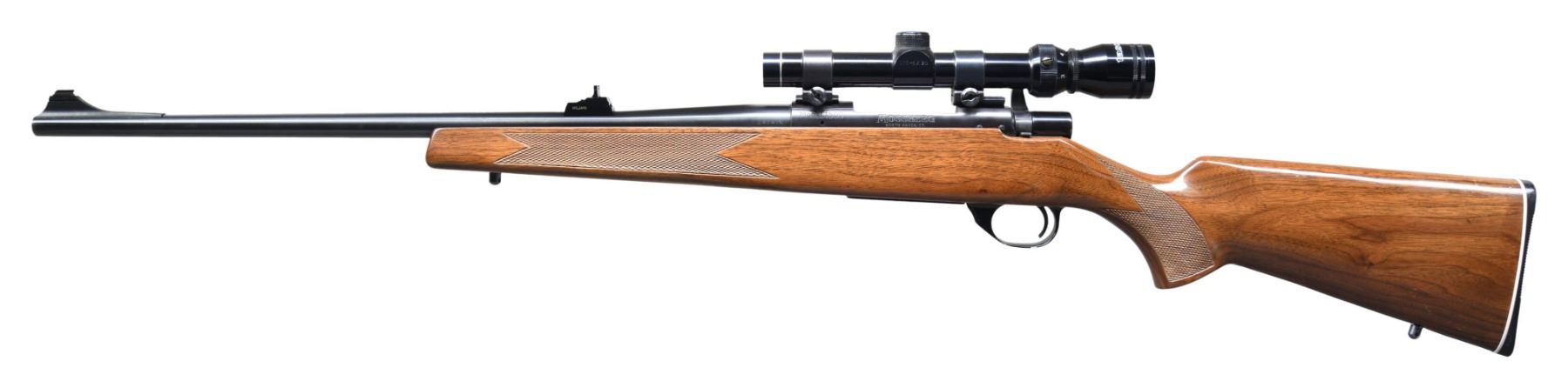 Cal. 243 Win. S# M009004. Mfg. in Japan by Howa & retailed by Mossberg. Bbl. 22”. Bead front sight & Williams rear sight. Tasco 1.75-5x20 duplex scope on Weaver 1” rings & bases. Checkered walnut stock w/ Mossberg buttplate. CONDITION: very good to near excellent overall appearance with light handling wear. Good bore with strong rifling & dark spots on lands. (25-4349/MD). MODERN. $350-550.