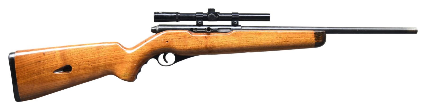 Cal. 22 LR. S# NSN. Bbl. 17 1/2" (shortened from 20"); missing sights (including receiver sight). Mfg. 1947-1958 having butt tube feed (15 rds.), signature finger grooved black plastic triggerguard and raised cheekpiece. Gloss finished Tasco 4X15 crosshair reticle scope and mounts for rifle's grooved receiver. CONDITION: good overall appearance with extra finish added to stock having faint black painted forend tip. Light marks on metal finish mixed with peppery oxidation and cold blue. Hobbiest quality barrel crown with near excellent bore. Optics slightly cloudy, but useable. (25-3721/NW). MODERN. $75-125.