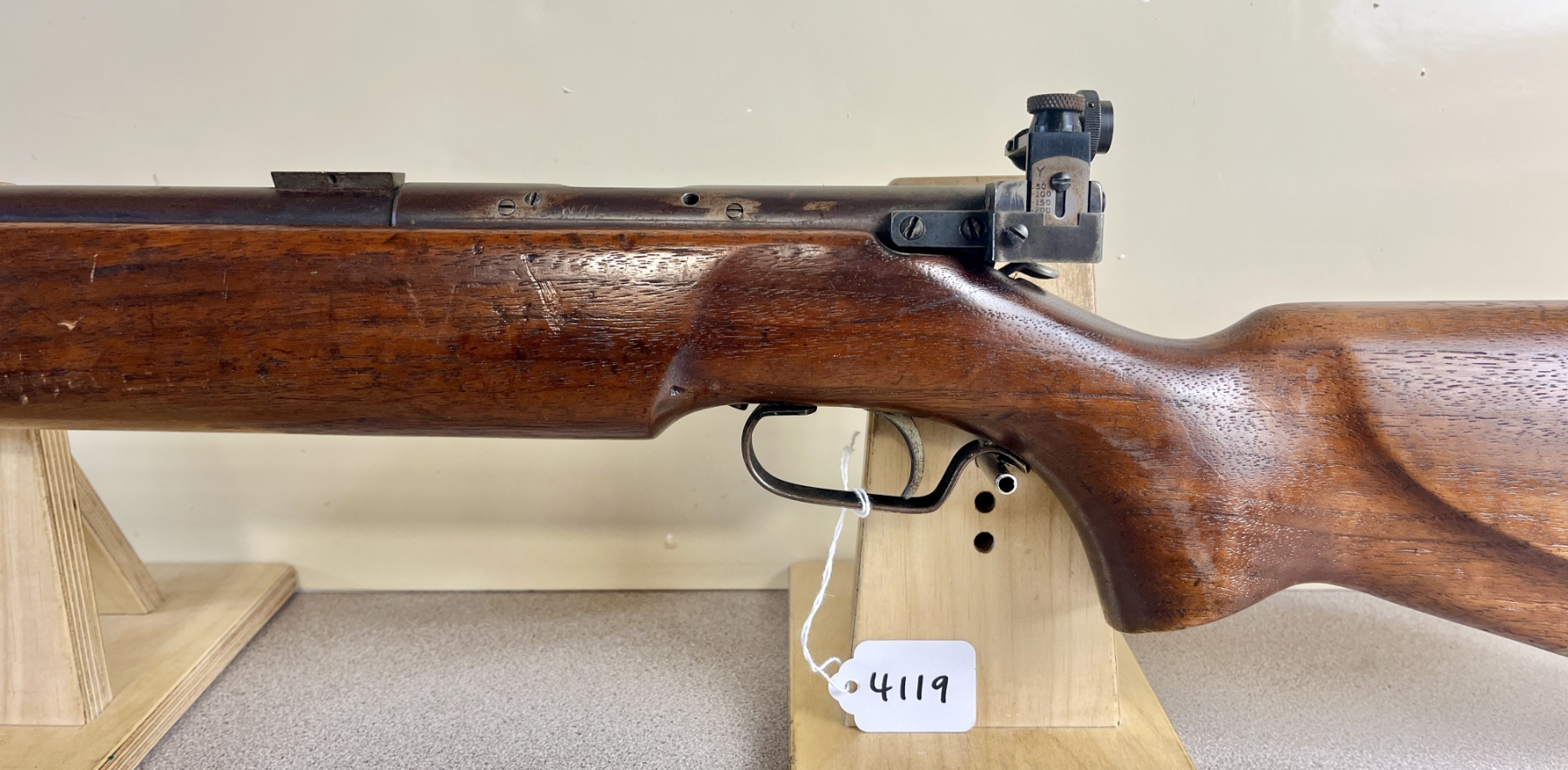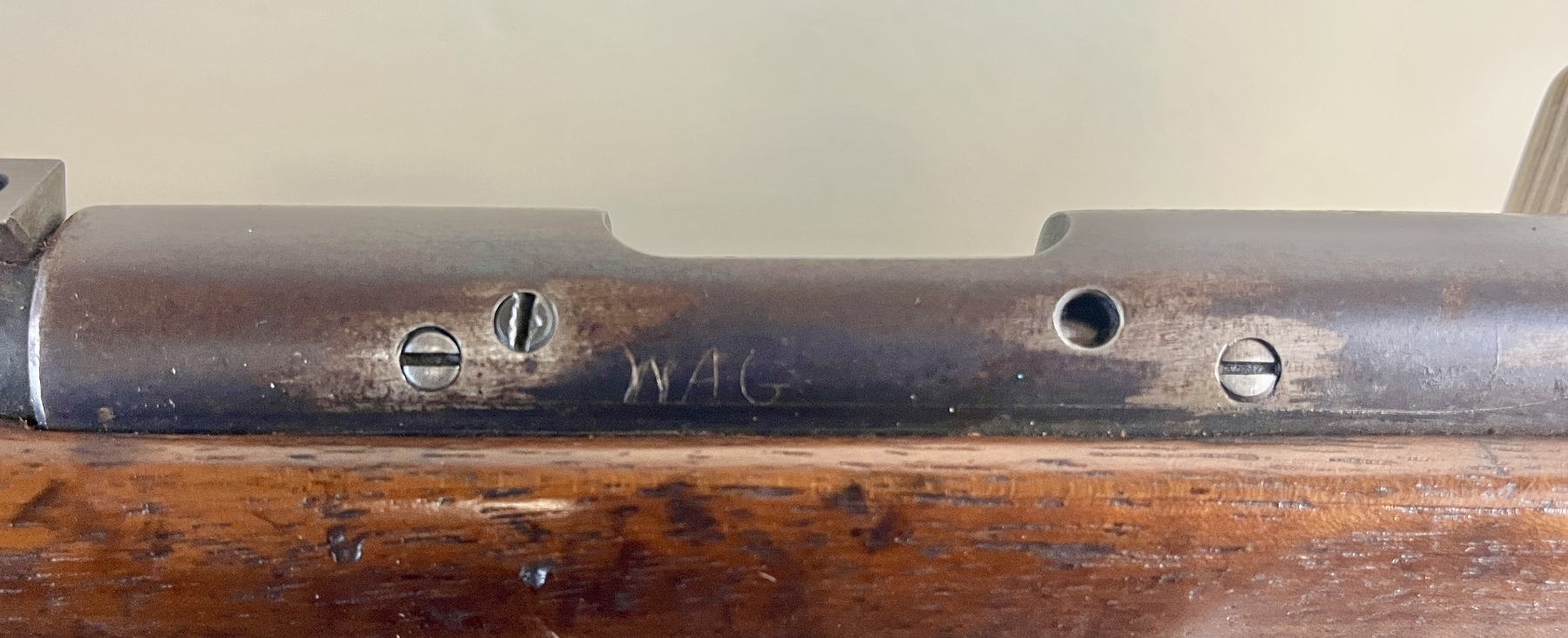 CONDITION: G OVERALL INCL BORE. NOTE: LEFT SIDE OF RECEIVER SHOWS 4X DRILLED AND TAPPED HOLES, INITIALS 'WAG' ENGRAVED ON LEFT SIDE OF RECEIVER. SPECS: 26IN BBL WITH HOODED FRONT SIGHT AND UNKNOWN PEEP SIGHT. EXTRAS: NONE. S/N: NONE