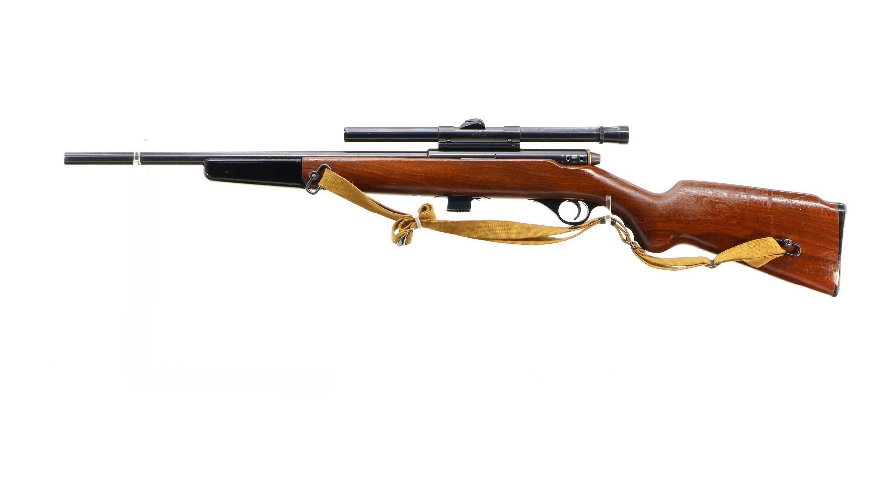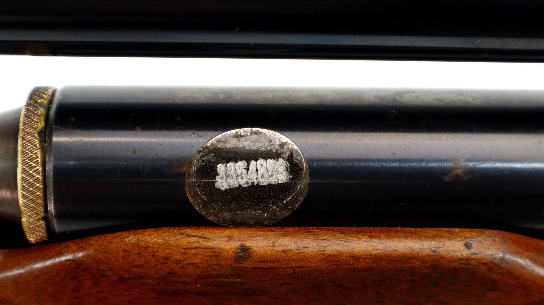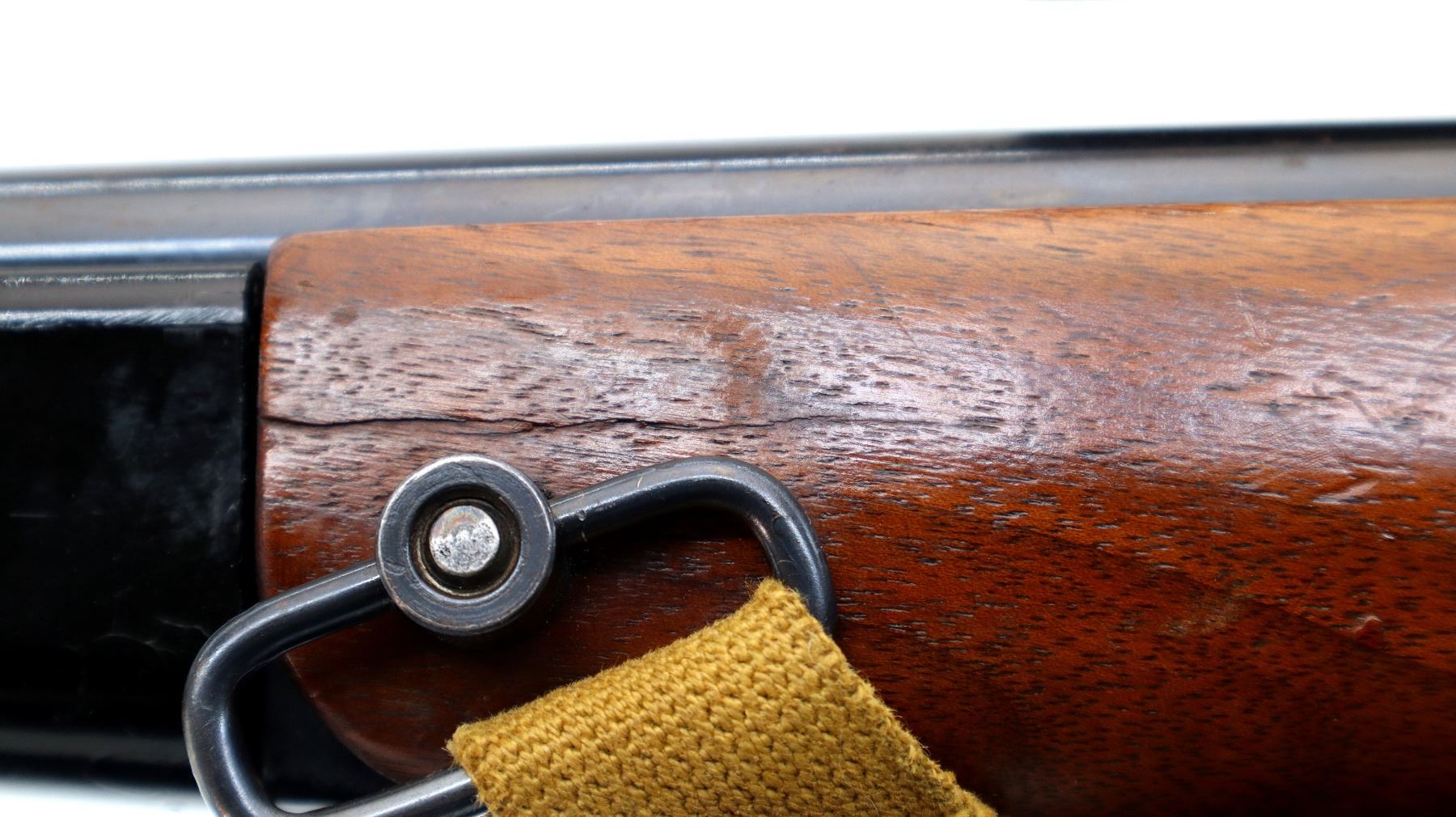 Main Description: Missing front sight threaded hole present, missing rear peep sight holes present, blued finish, grooved receiver with Weaver B6 scope installed, clear optics with fine crosshair. Folding black polymer front grip. One piece wood stock, pistol grip, grooved black polymer butt plate, sling swivels with tan canvas sling.