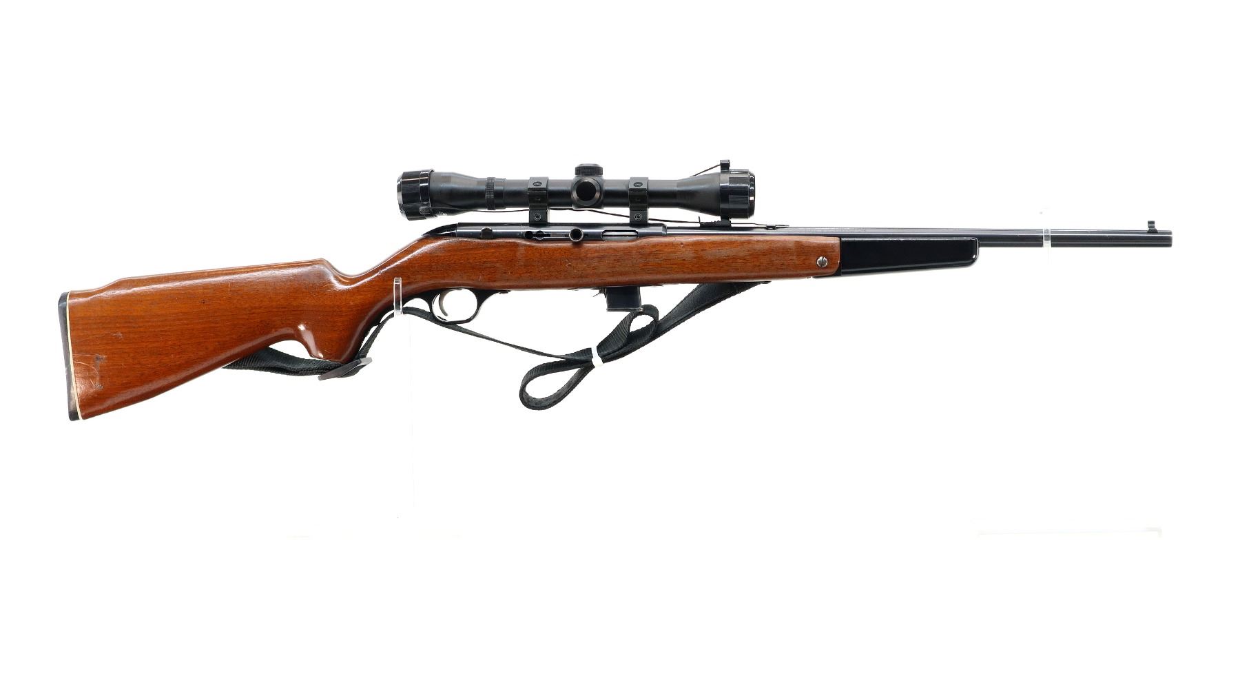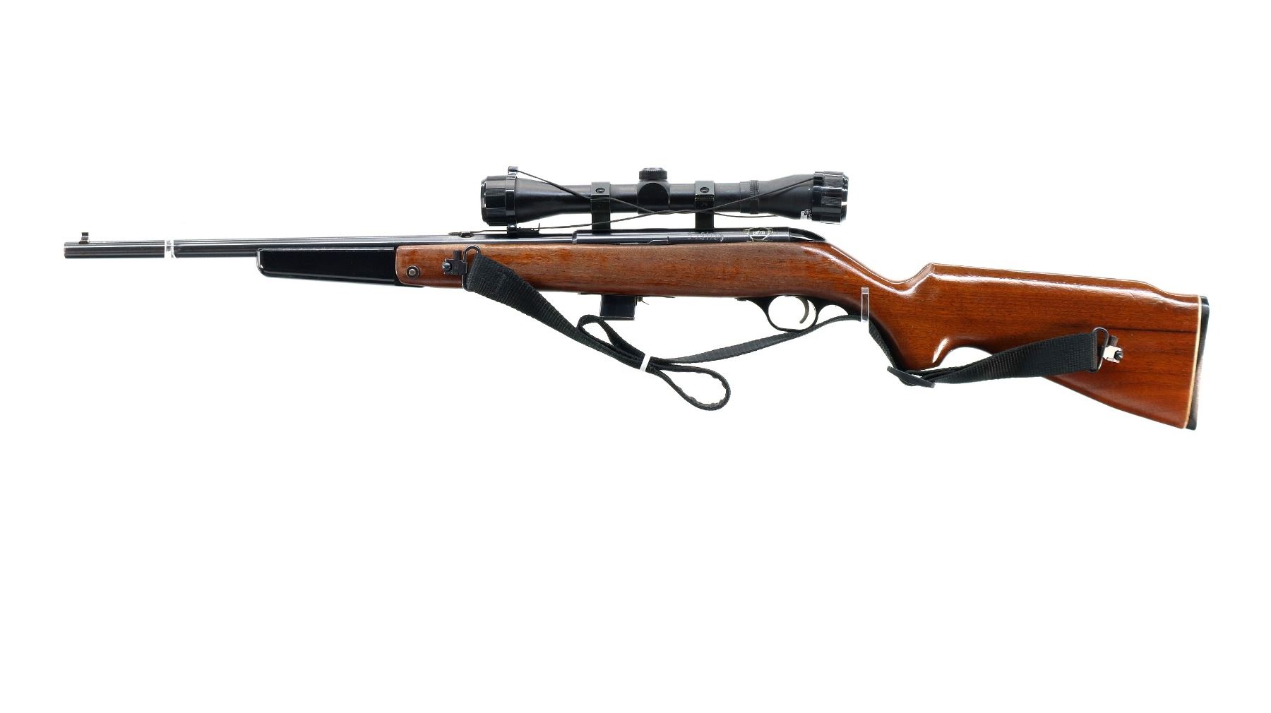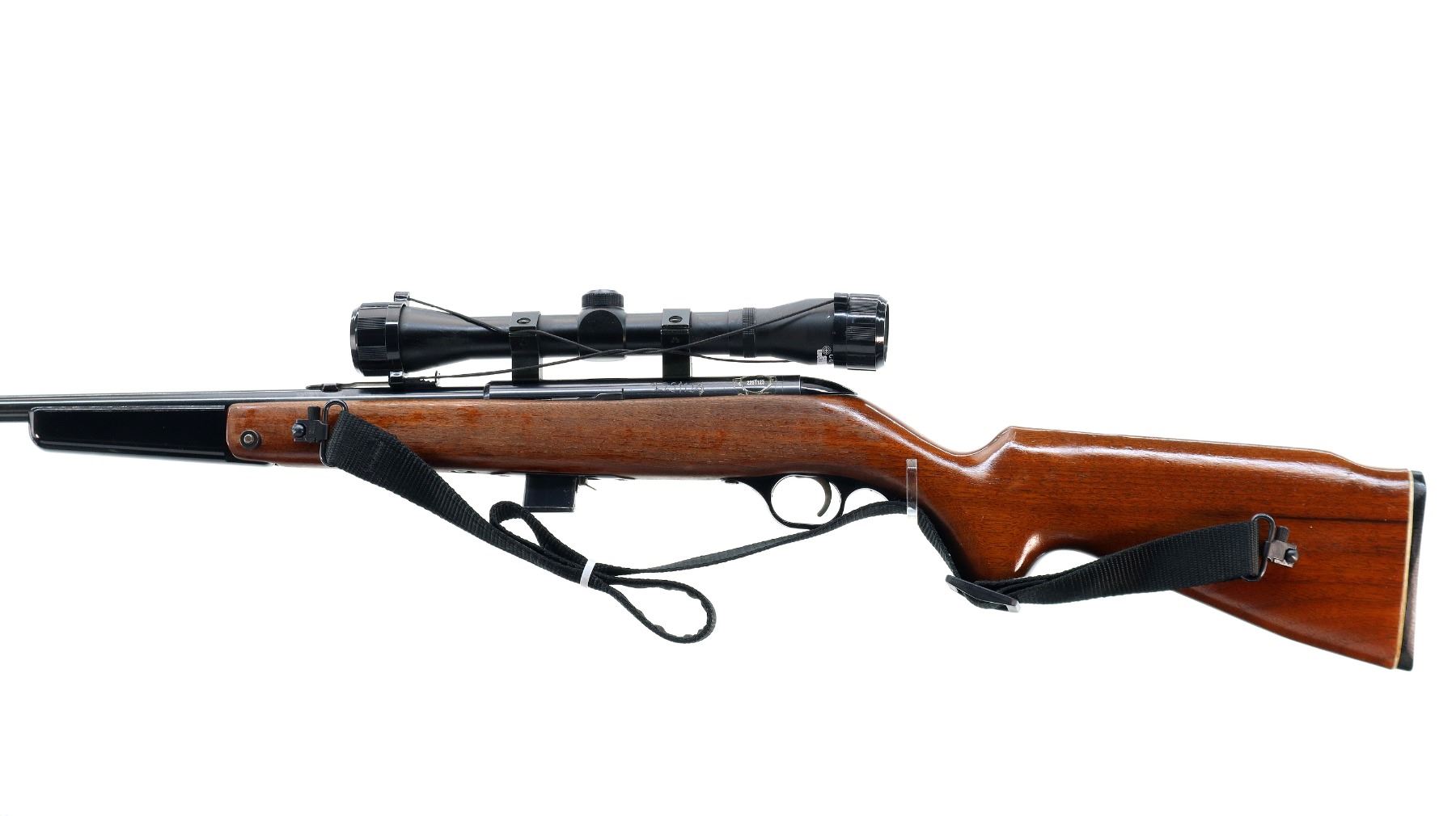 Main Description: Blade front sight, adjustable u notched rear sight, blued finish, grooved receiver with Crosman Airgun 4x32 scope installed, clear optics with duplex crosshair. Number etched on left side of receiver. One piece wood stock, folding black polymer front grip, pistol grip, checkered black polymer butt plate, replaced screws on trigger guard, sling swivels with black nylon sling.