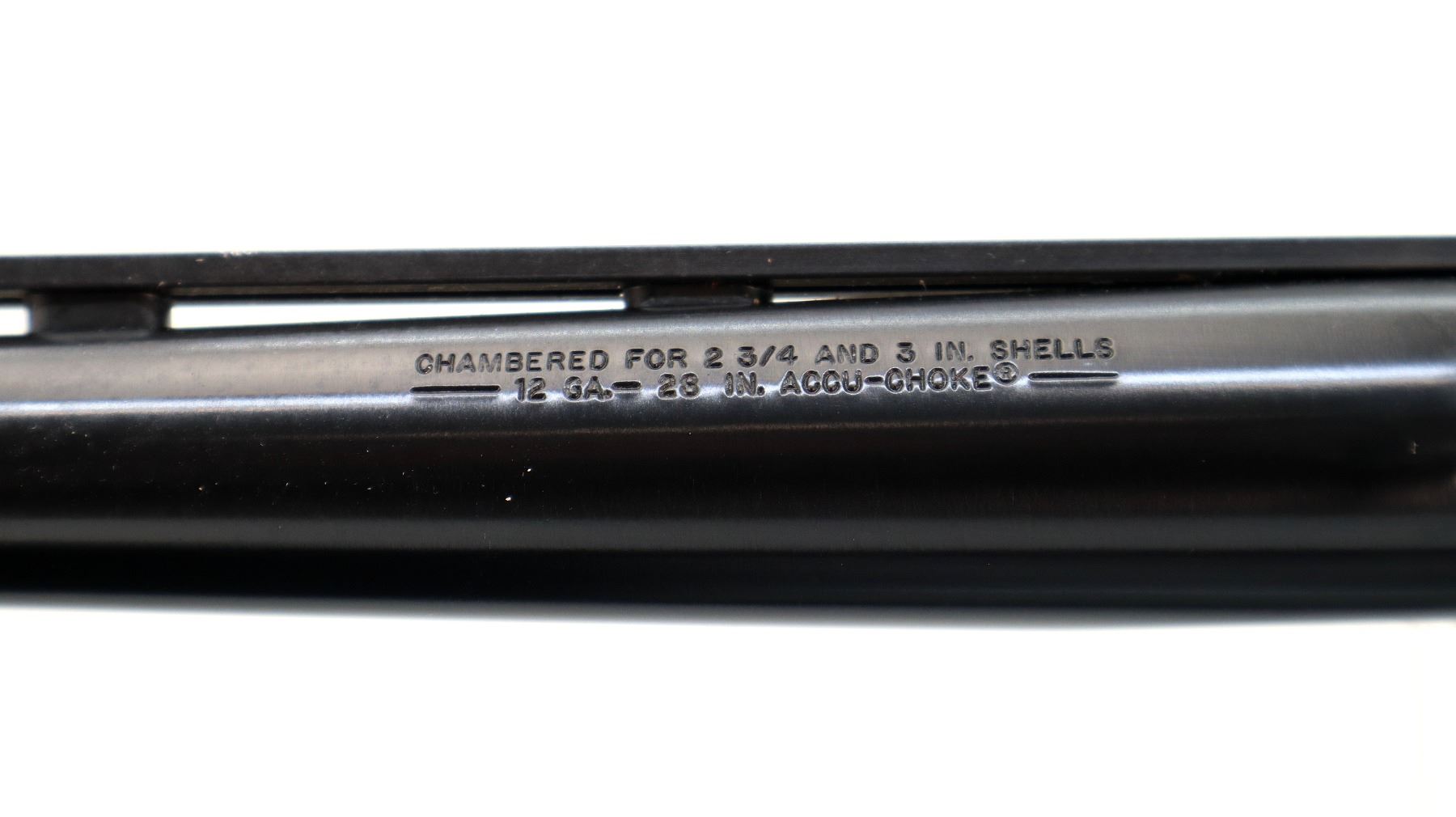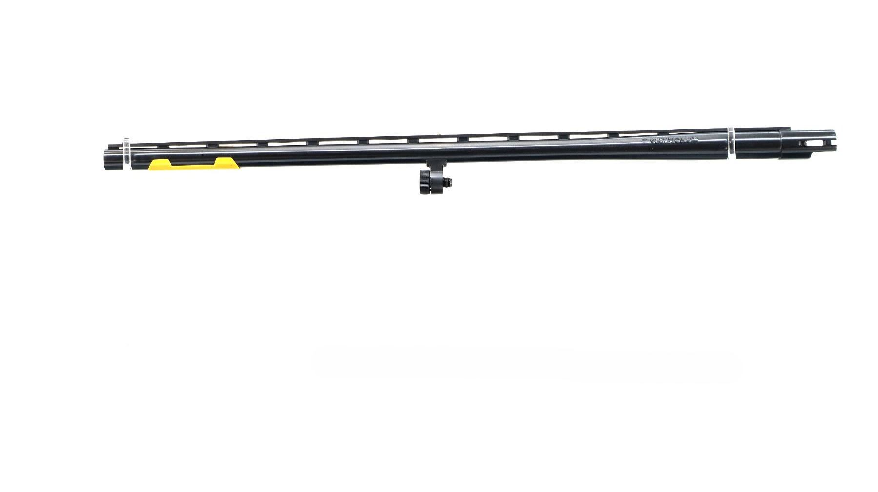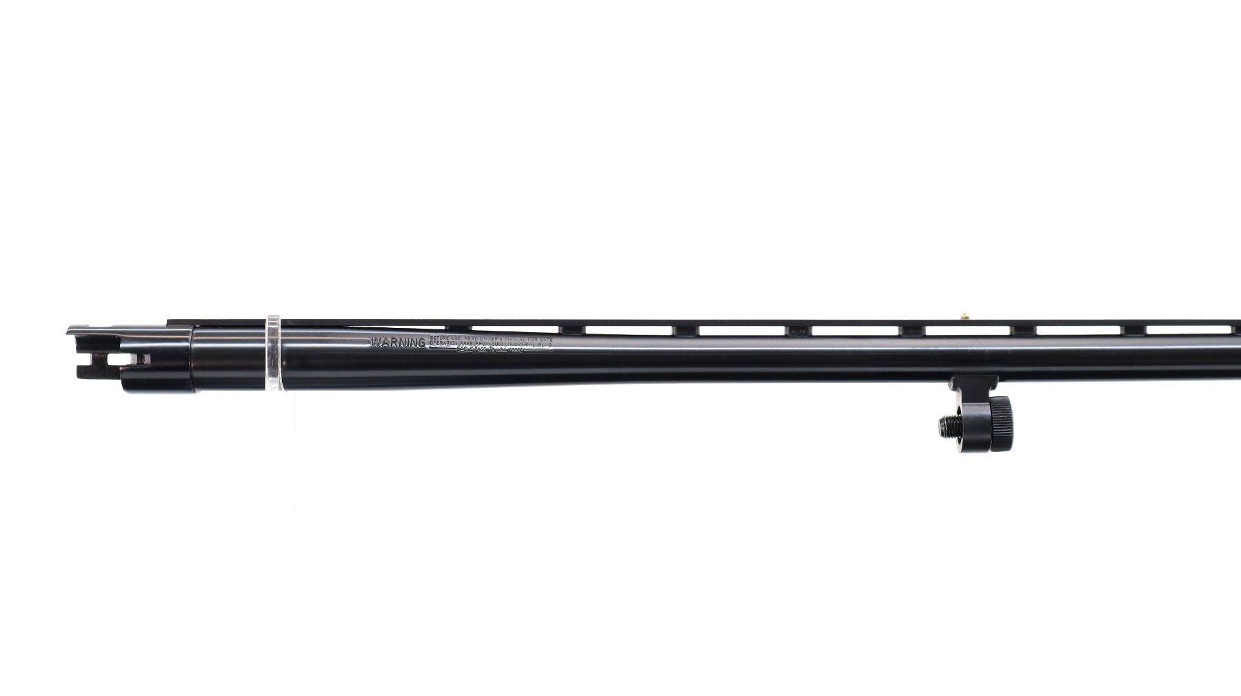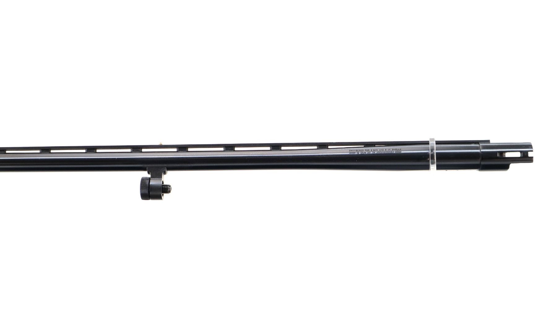 Main Description: Blade front sight with ramp, adjustable folding u notched rear sight, blued round barrel, black alloy receiver. Two piece black synthetic stocks, grooved forearm, checkered pistol grip, black vented rubber recoil pad, swivel studs, retains factory sticker on left side of stock. Spare Barrel: 12 G X 3", 28", Excellent Bore, Removable Mod Choke, White front and brass mid rib beads, blued finish, vent rib, retains factory tag.