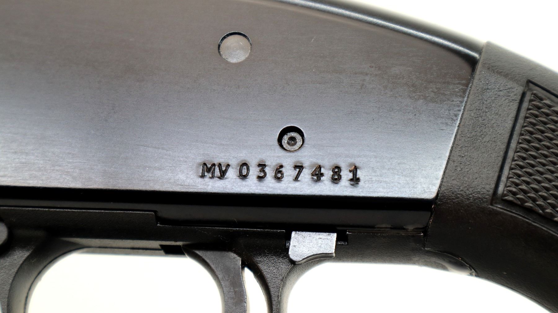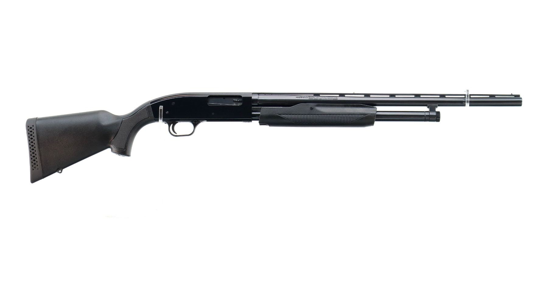 Main Description: Broken front bead, brass mid rib bead, blued vent rib barrel, black alloy receiver. Two piece black synthetic stocks, checkered forearm and pistol grip, black vented rubber recoil pad, 12" LOP, grip cap, rear swivel stud only. Retains factory sticker on left side of stock.