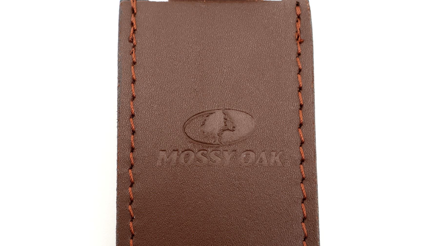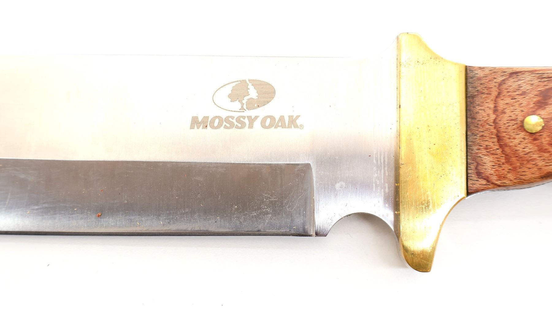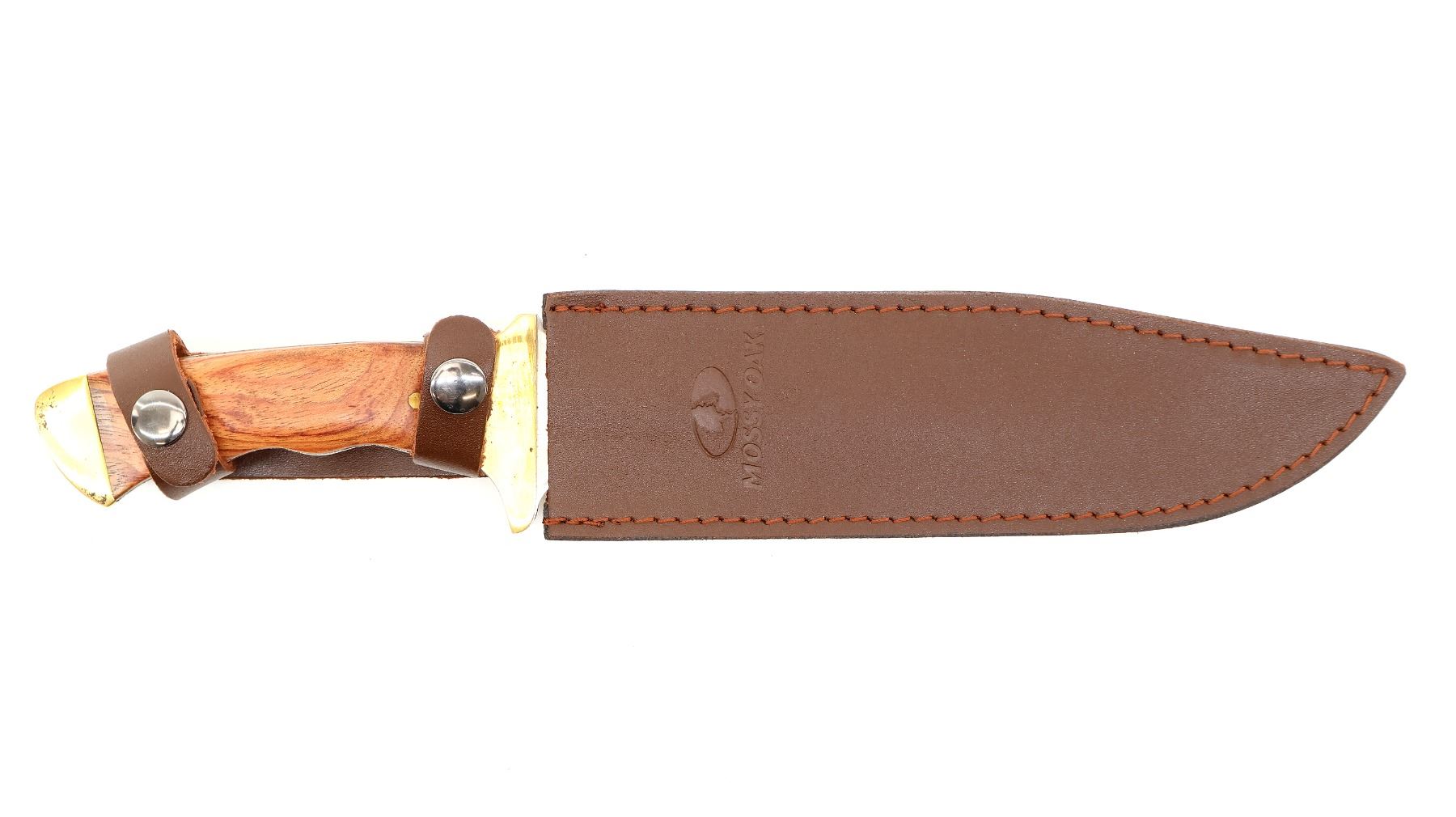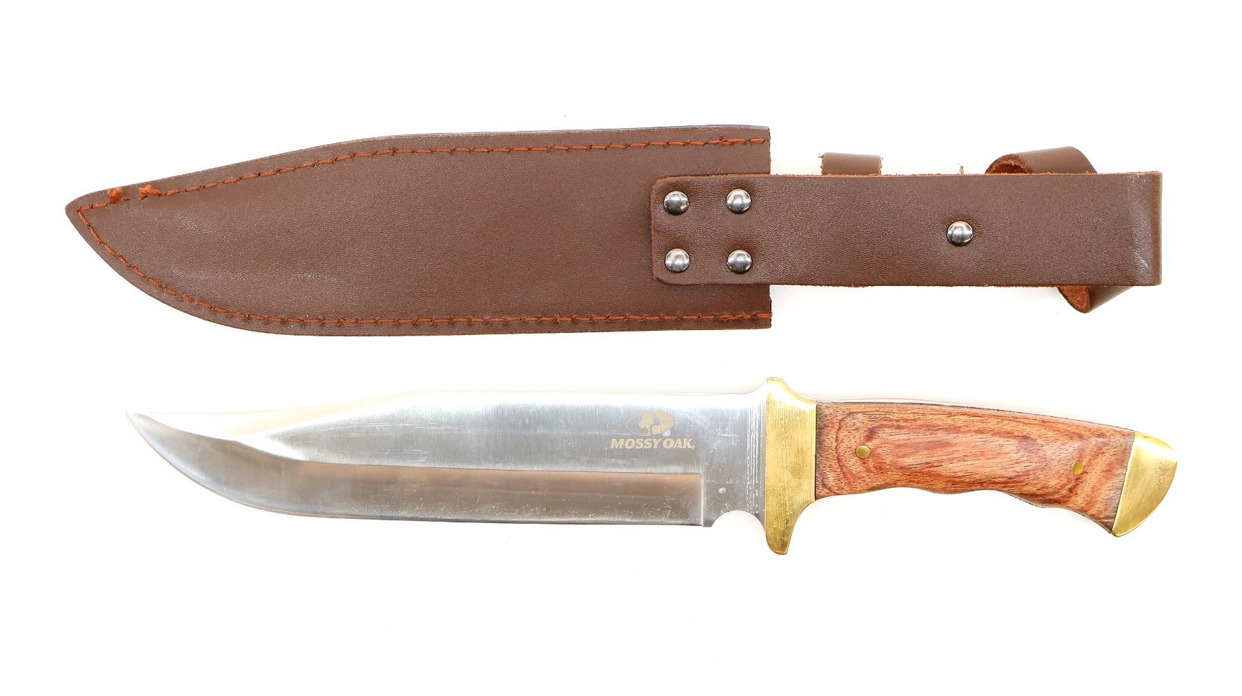 (1) STEEL BLADE, MARKED "MOSSY OAK", WOODEN & BRASS HANDLE, UNMARKED, SHOWS WEAR & TEAR / USE MARKS, BLADE OVERALL LENGTH APPROX. 8.5", OVERALL LENGTH APPROX. 13.75", WITH BROWN LEATHER SHEATH, MARKED "MOSSY OAK". SEE PHOTOS.