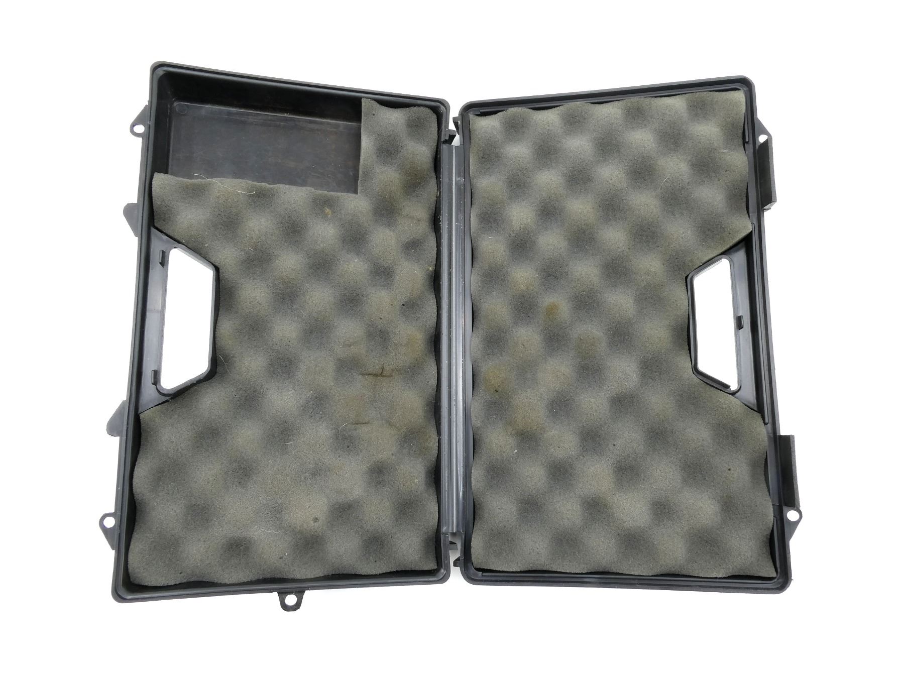 LOT INCLUDES; (1) BLACK HARD PADDED HAND GUN CASE, CARRY HANDLE, (2) LATCHES, APPROX. OVERALL LENGTH 14", SHOWS WEAR AND TEAR FROM USAGE, SEE PHOTOS.