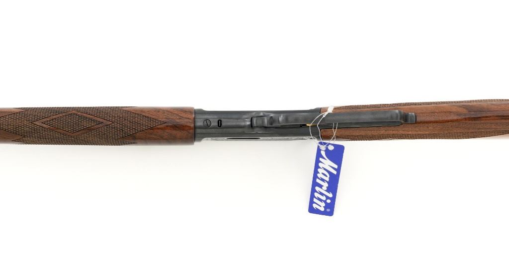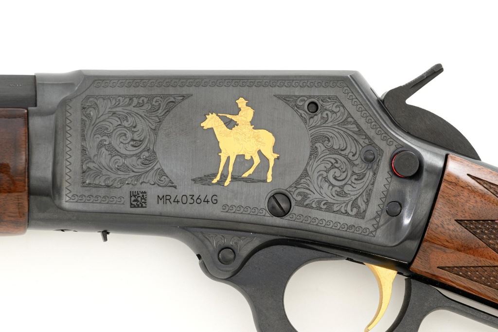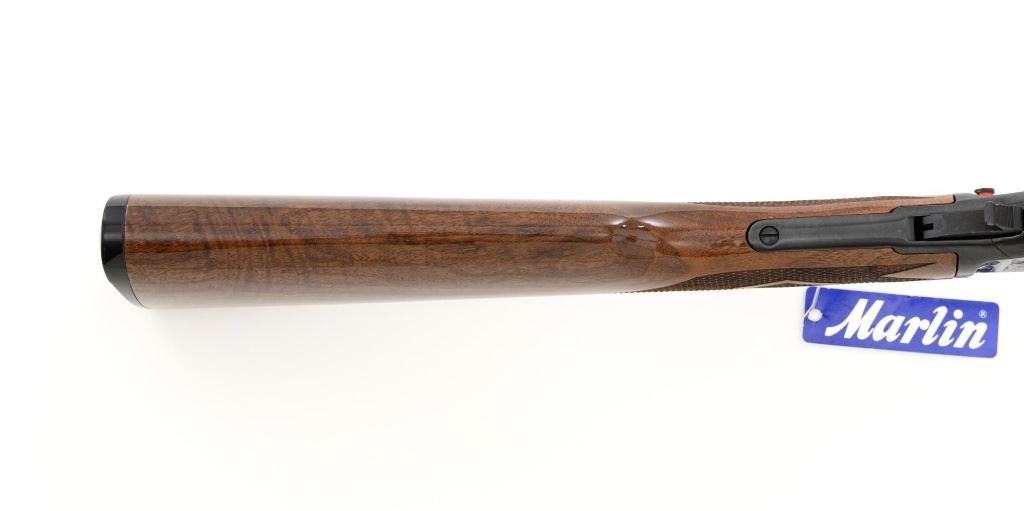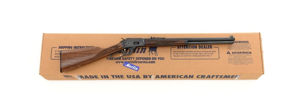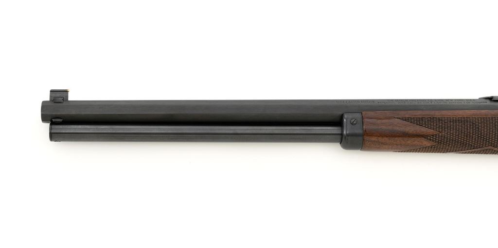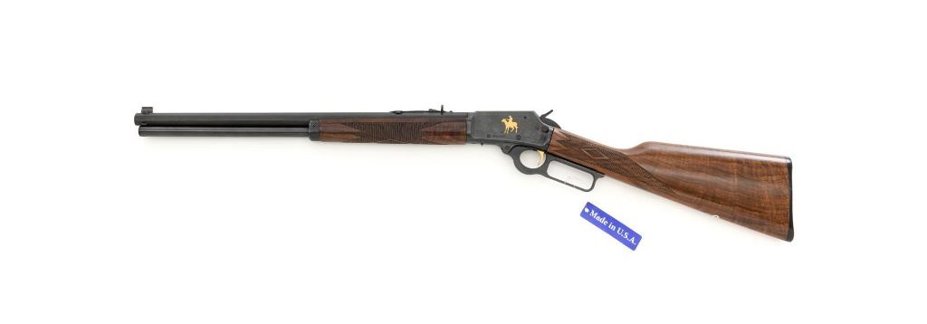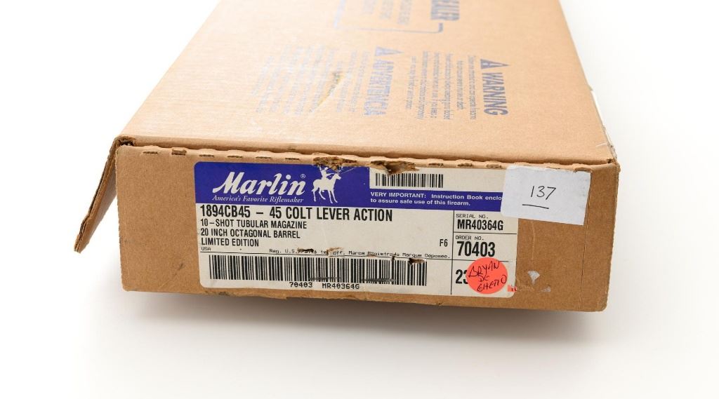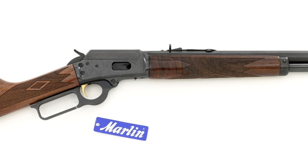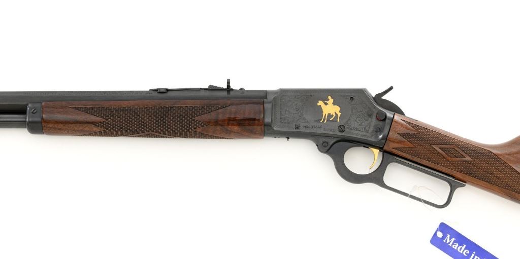 Marlin M1894 Cowboy Limited Lever Action Rifle, #MR40364G, .45 Colt cal., 20" octagon barrel, blue finish with intricately engraved receiver and gold inlaid "Cowboy". Gloss finished finely checkered deluxe walnut forend and straight grip buttstock, ending with a checkered plastic Marlin buttplate, providing a 13.5" LOP. Receiver is factory drilled and tapped, sights include a dovetailed brass tipped blade front and semi-buckhorn rear. Includes factory cardboard box with matching end label, instruction manual, safety lock, and associated packaging materials. Rifle is in excellent overall condition, appearing as new with the factory box and original hang tag. Stock has only a few light storage marks, displaying attractive figure in the buttstock. Action is crisp. Bore is mirror bright with excellent rifling. One of only 1,500 produced. Est.: $1,000-$1,500. (Modern)