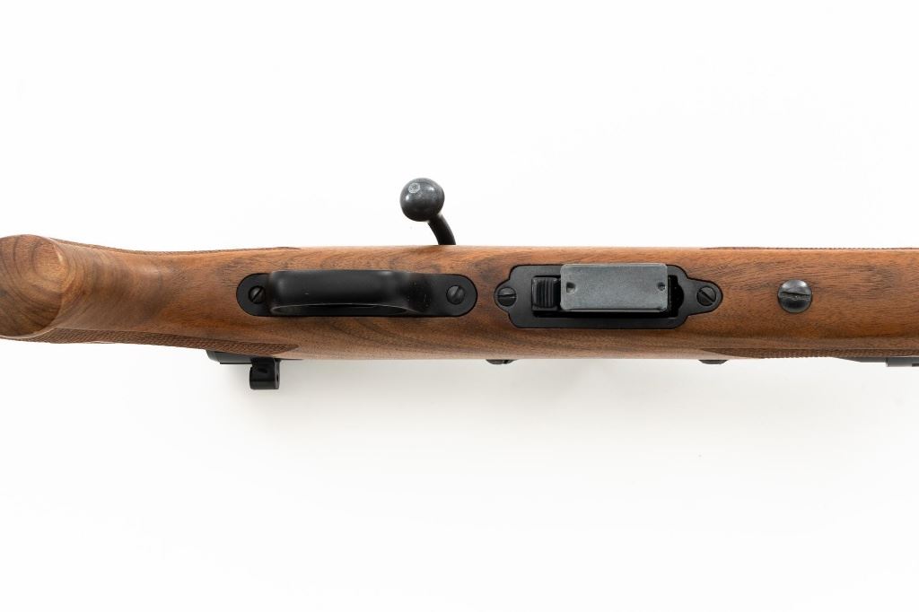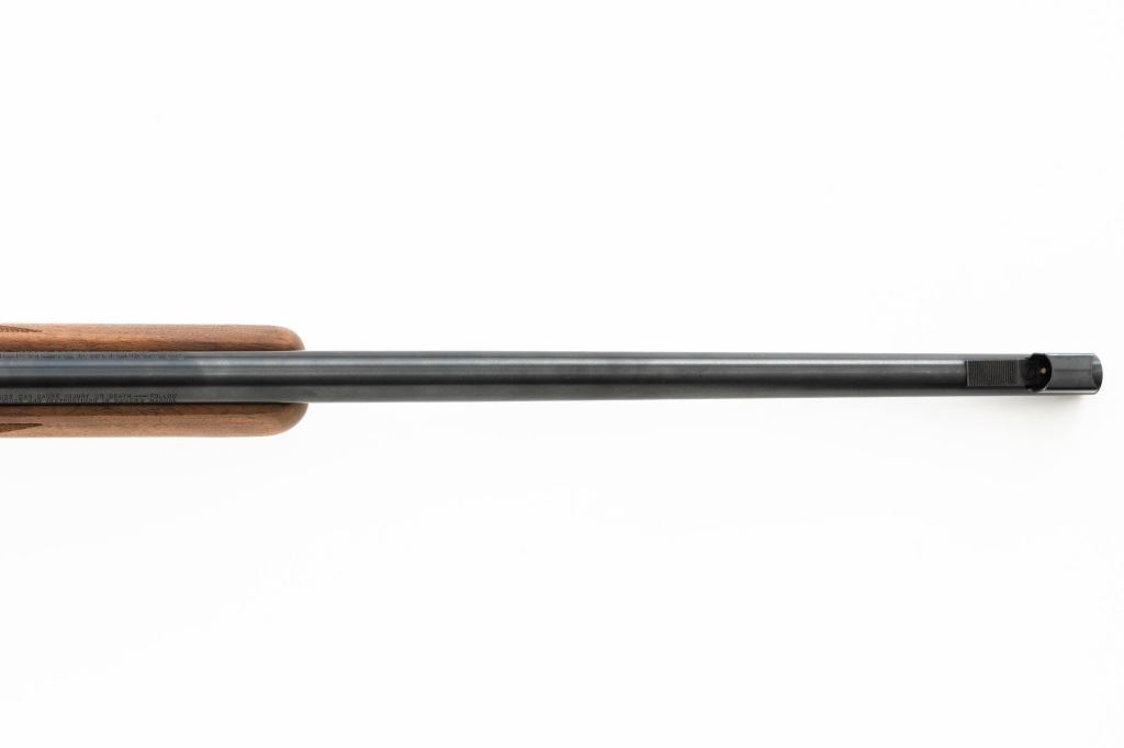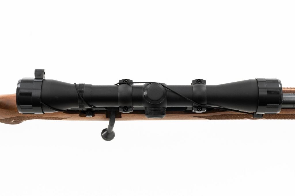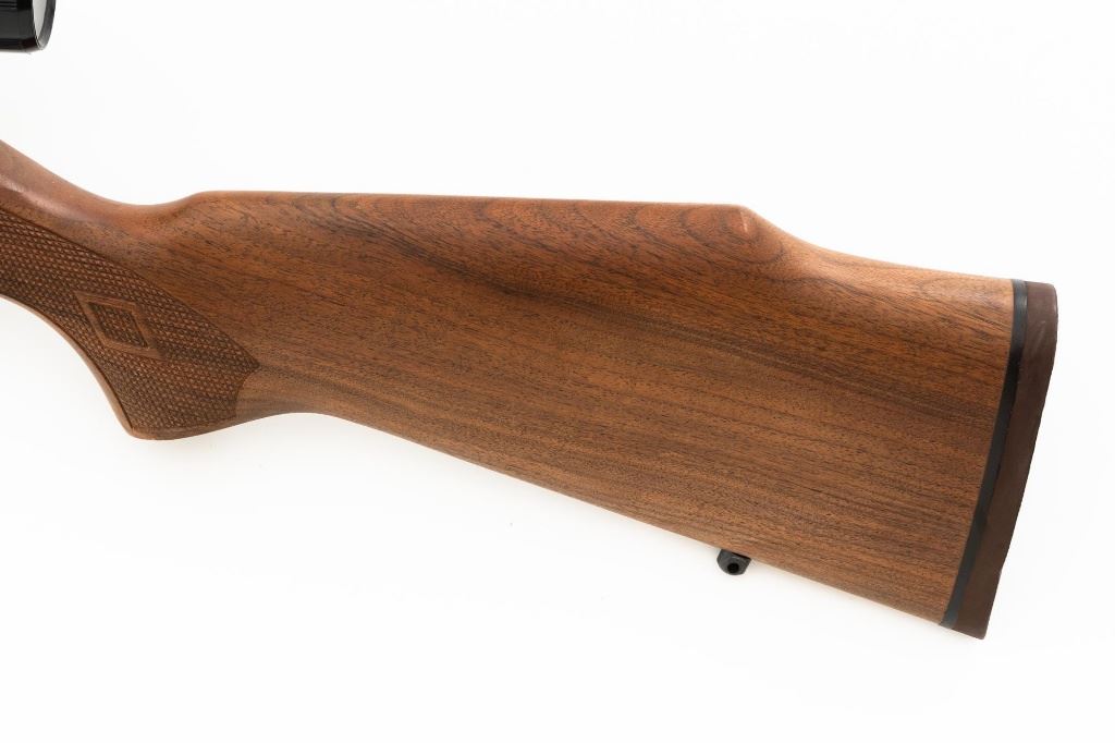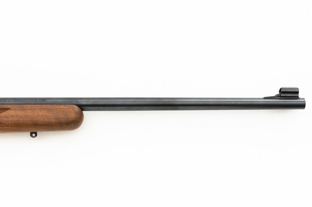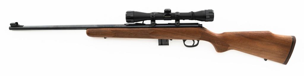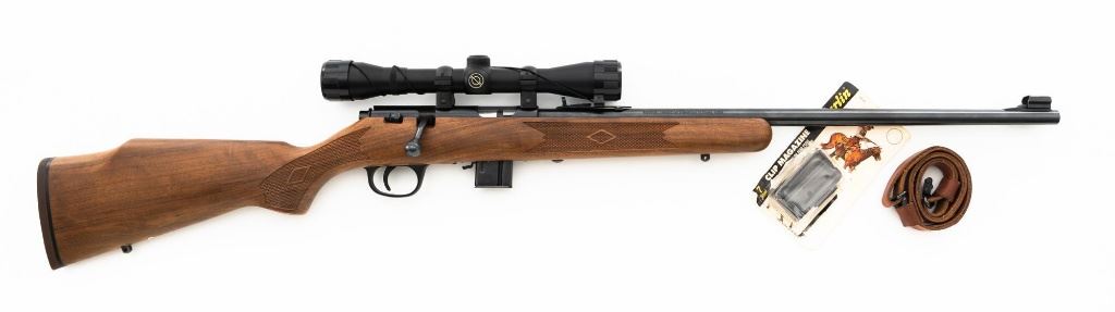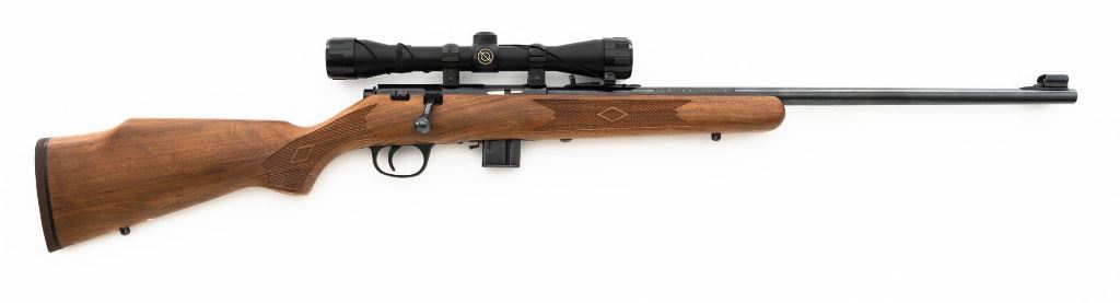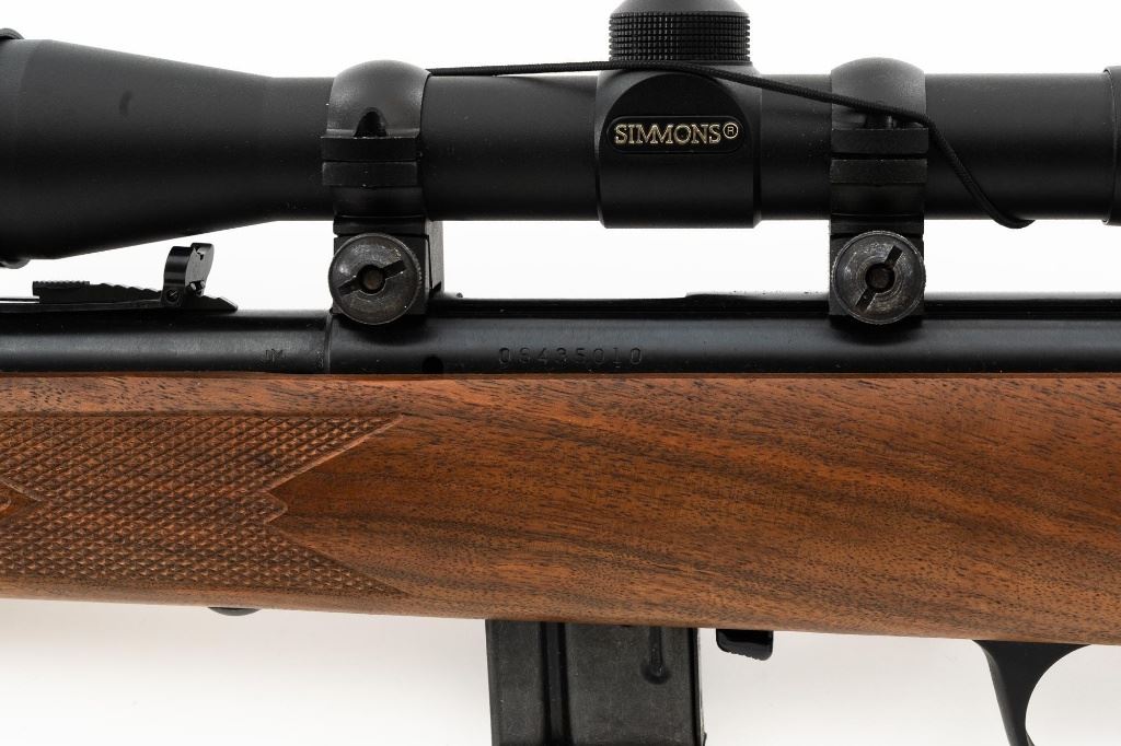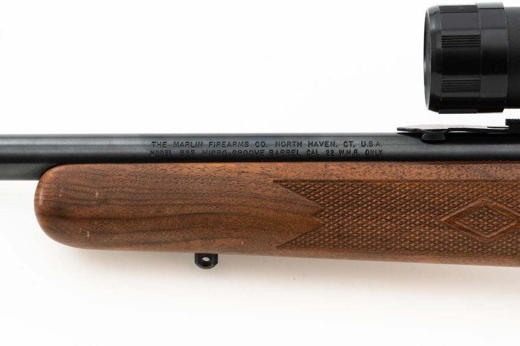 Marlin Model 882 Bolt Action Rifle, #06435010, .22 WMR cal., 22" barrel, blue finish, checkered walnut one-piece Monte Carlo style stock with sling swivels studs and Marlin "Bullseye" in the underside of the buttstock, which ends with a Marlin solid rubber recoil pad, providing a 14" LOP. Rifle also features a hooded brass tipped blade front sight, semi-buckhorn rear sight, factory grooved receiver, and includes two (2) detachable 7-round blue steel magazines, and period leather sling. Rifle is topped with rings and a Simmons .22 MAG 4x32 fixed power rifle scope, finished in matte black with a duplex reticle. Scope is in excellent condition with bright, clear optics, and includes a set of plastic lens caps. Rifle is in excellent overall condition, showing little evidence of use, retaining approx. 99% factory finish, with only minor marks. Stock is in excellent condition with sharp checkering detail. Action is crisp and operates smoothly. Bore is mirror bright with excellent rifling. The Models 882/883 were discontinued in 2003, it would be hard to improve on this example. Est.: $300-$500. (Modern)