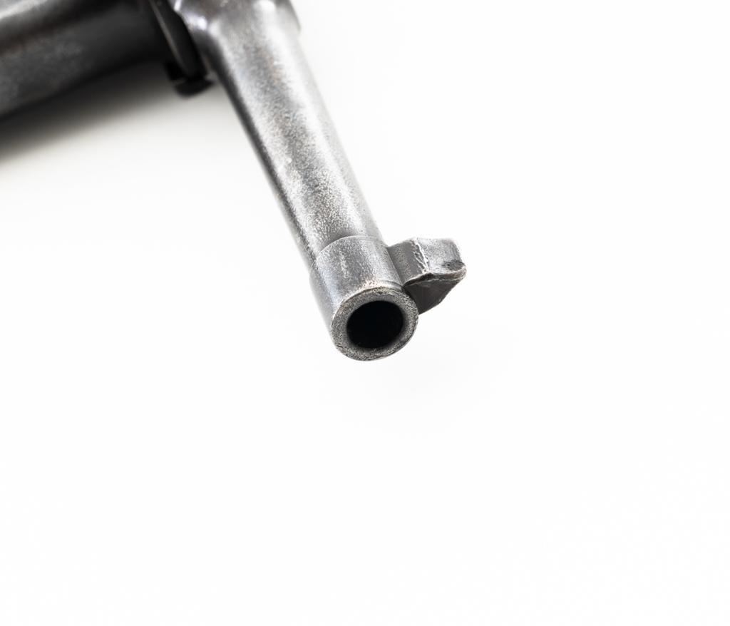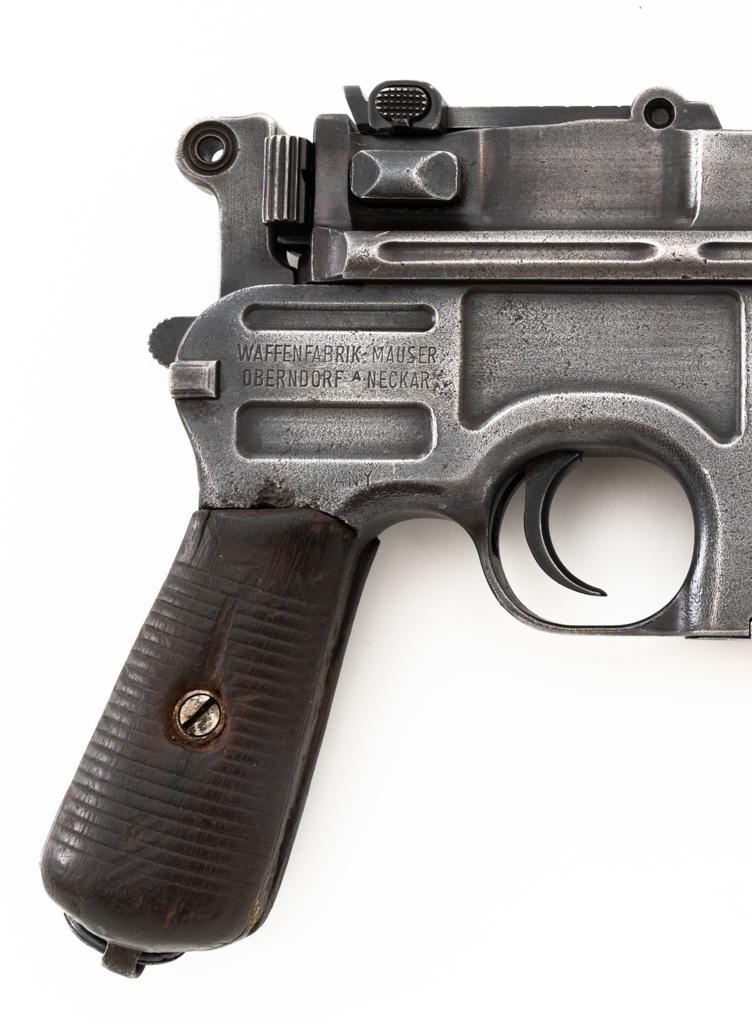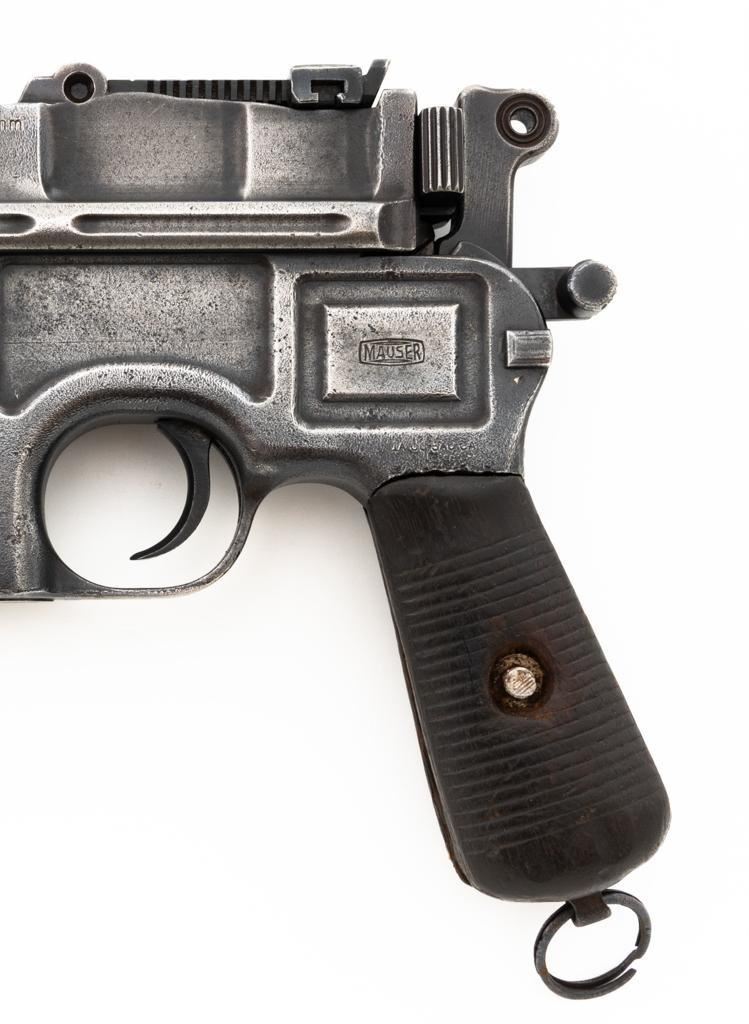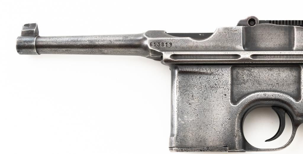 Mauser C96 Bolo Broomhandle Semi-Automatic Pistol, #613819,. 30 Mauser cal., 3.9"barrel, blued finish, grooved hardwood grips, inverted-"V" front sight, and adjustable tangent rear sight with "V"-notched groove, graduated to 1000 meters. Backstrap is slotted for a shoulder stock and a loose lanyard ring is mounted to the butt. Left side of the frame is marked with "MAUSER" logo. Top of the chamber and the right side of the frame are marked "WAFFENFABRIK MAUSER OBERNDORF A/N(A NECKAR". Matching numbered bolt. Import marked on the upper and lower left side of the frame. Condition overall is fair, retaining no finish. Metals shows signs of cleaning, general patina, and deep pitting around the grip. Grips with bruises, handling marks, and darkening. Grip screw is a non-standard replacement. Action operates smoothly. Bore rates poor, with pitting and worn rifling. Est.: $500-$700. (C&R/PPT)