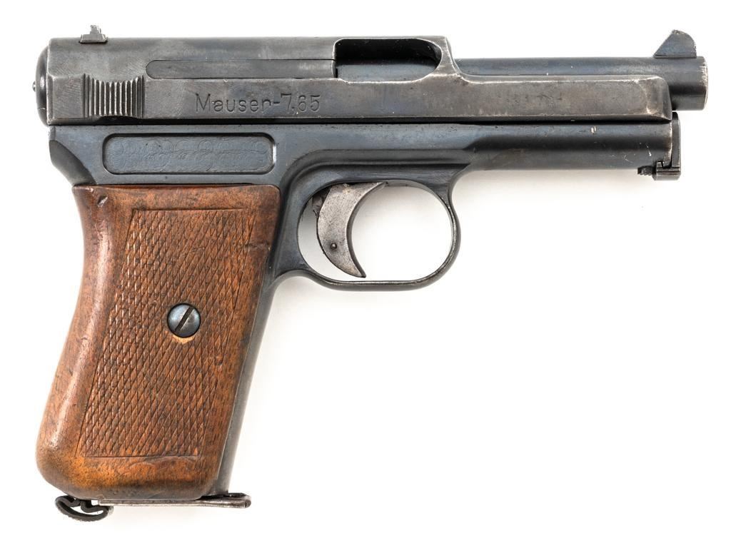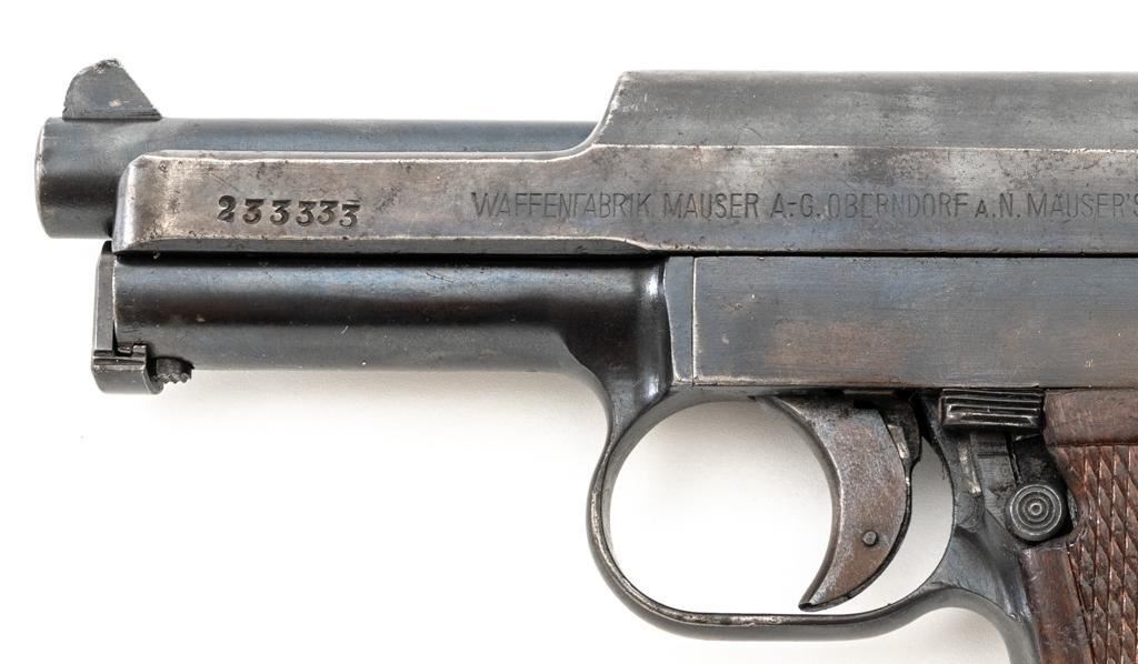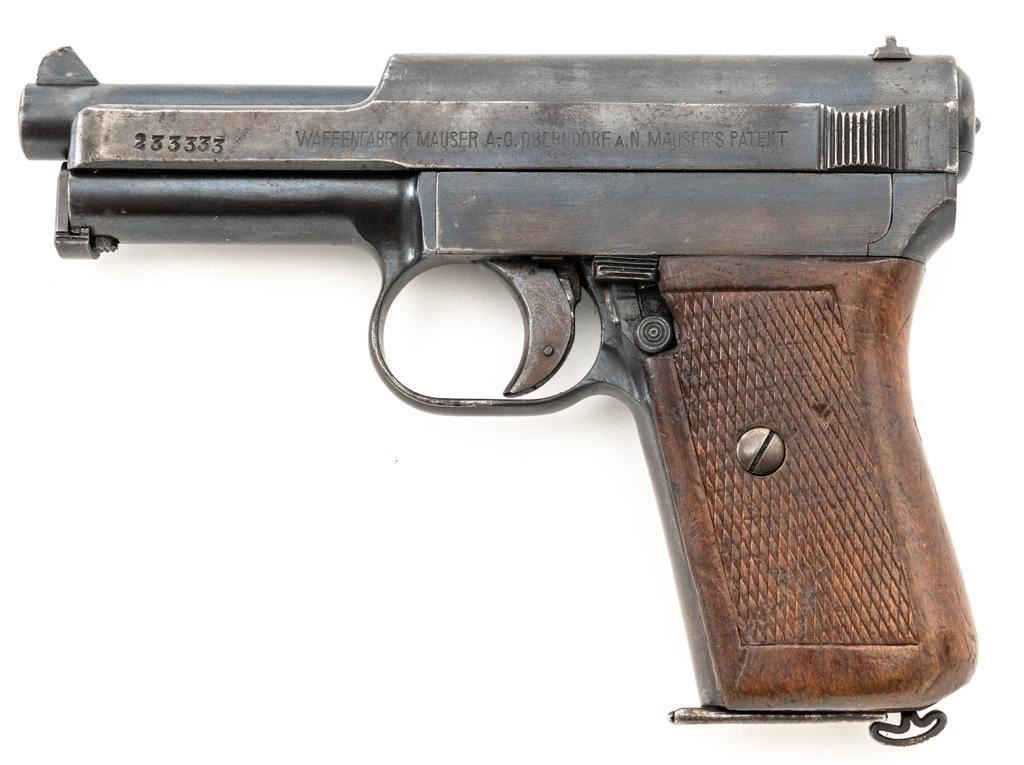 Mauser Model 1914 Semi Automatic Pistol, #233333, .32 ACP cal., 3.5" barrel, blued finish, checkered hardwood one-piece grip, inverted-"V" front sight, and fixed rear sight with "U"-notched groove. Includes one bright, unfinished magazine, marked "2039./2." on the floorplate. Pistol is marked "WAFFENFABRIK MAUSER A.G.OBERNDORF A.N.MAUSERS PATENT" on left side of the slide, and "MAUSER-7,65" on the right side. There is a "(crown)U" final acceptance stamp on the slide behind the rear sight, and a faint number on the front grip strap. Matching numbers on frame and slide. No visible import marks. Condition overall is very good, retaining approx. 70%-75% of an old refinish, showing spots of patina, edgewear, and handling marks. Grip with scattered impressions and handling marks. Action operates smoothly. Bore is bright with very good rifling. Magazine displays signs of age and wear, with darkening and patina. Est.: $200-$300. (C&R/PPT)