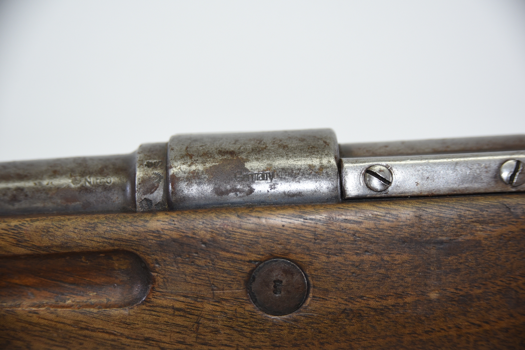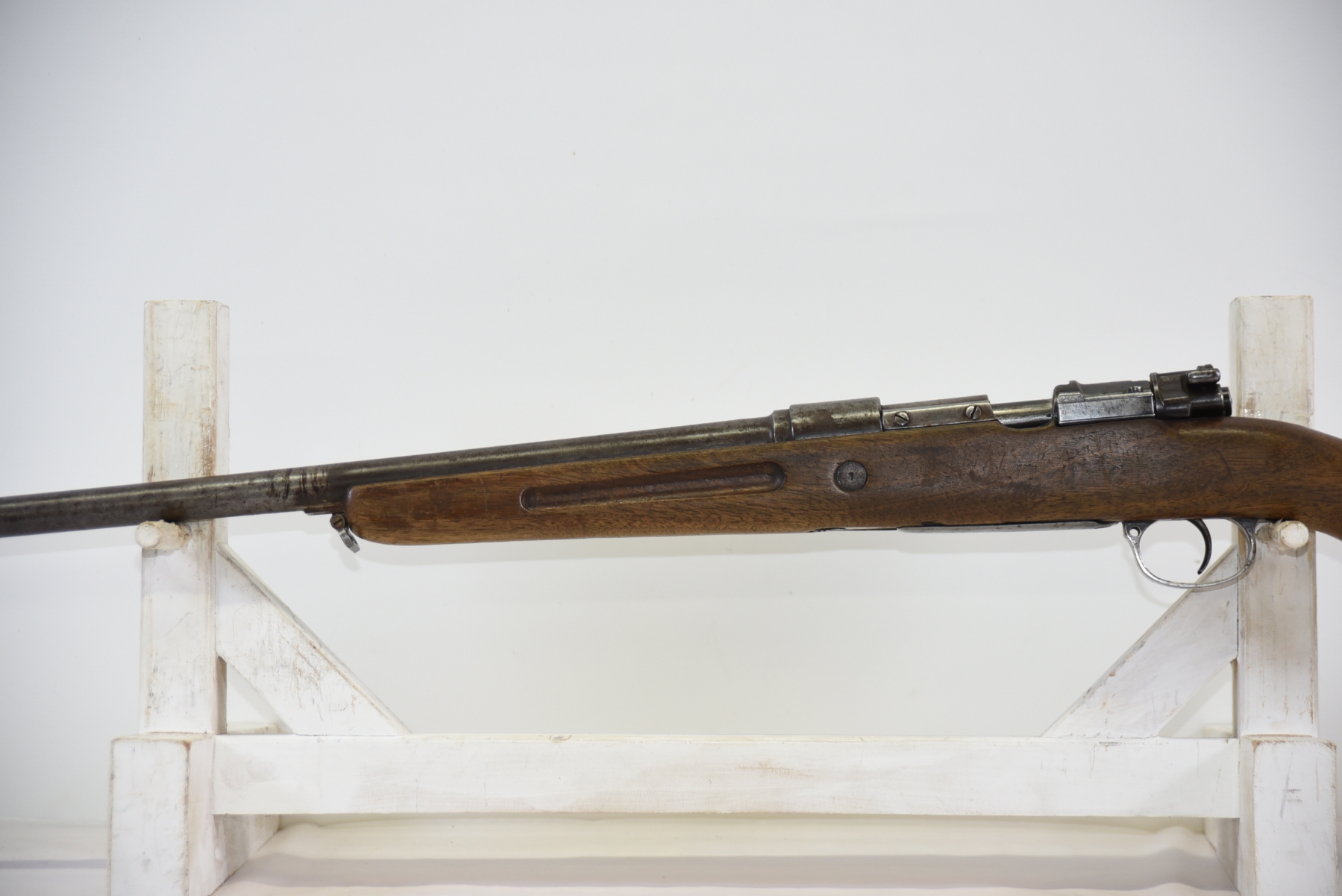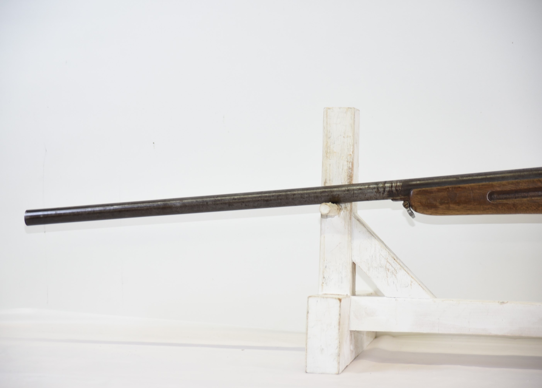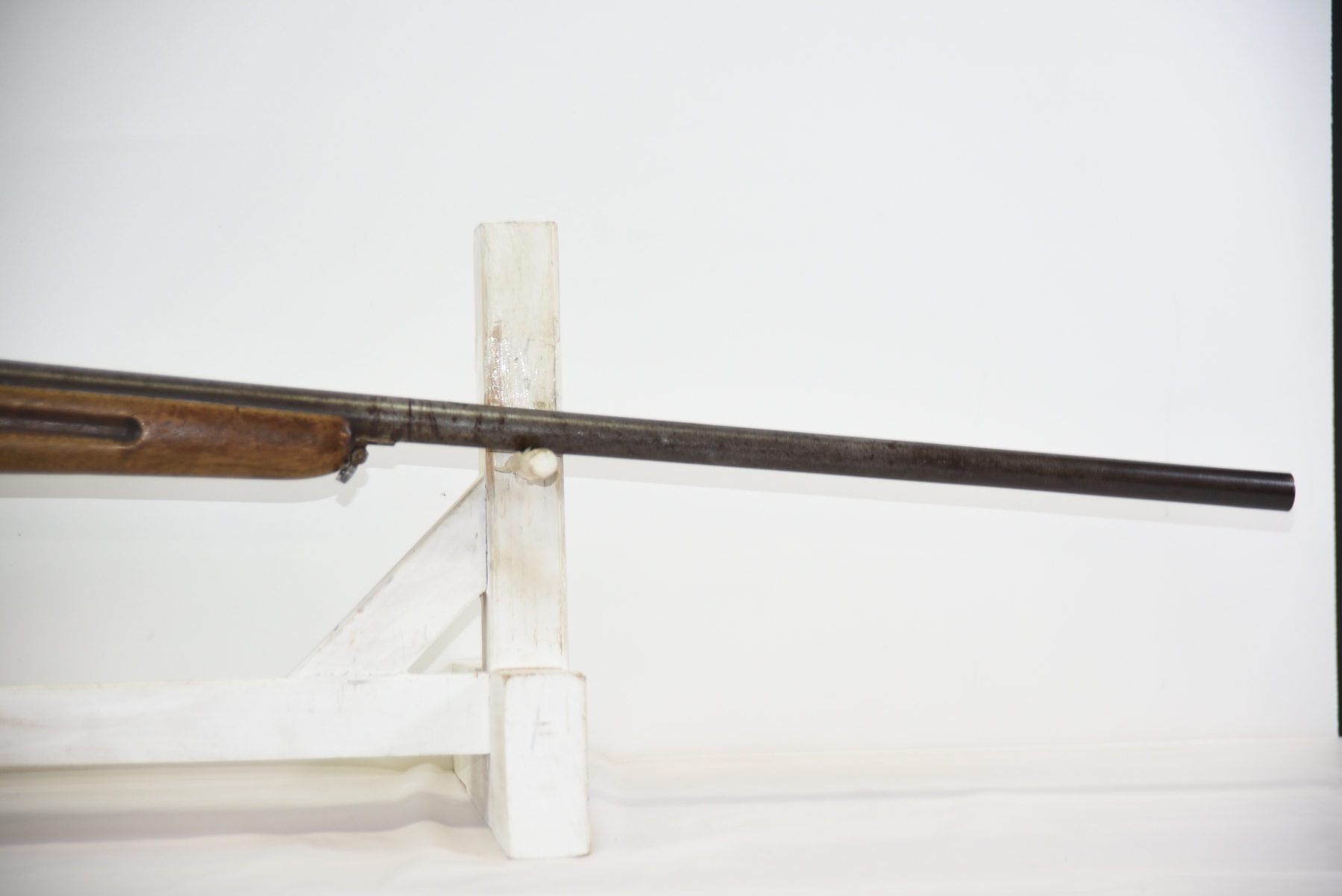 Metal finish shows scratches, scuffs, light rust throughout, front sight bead is missing; condition is less than fair.