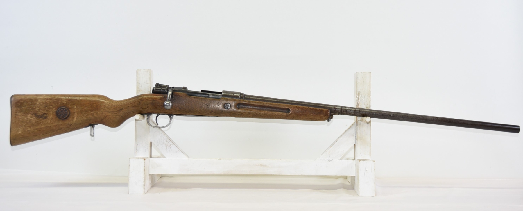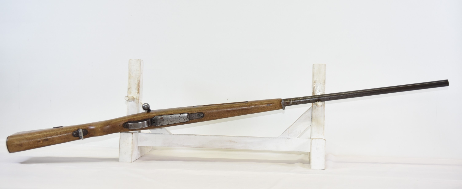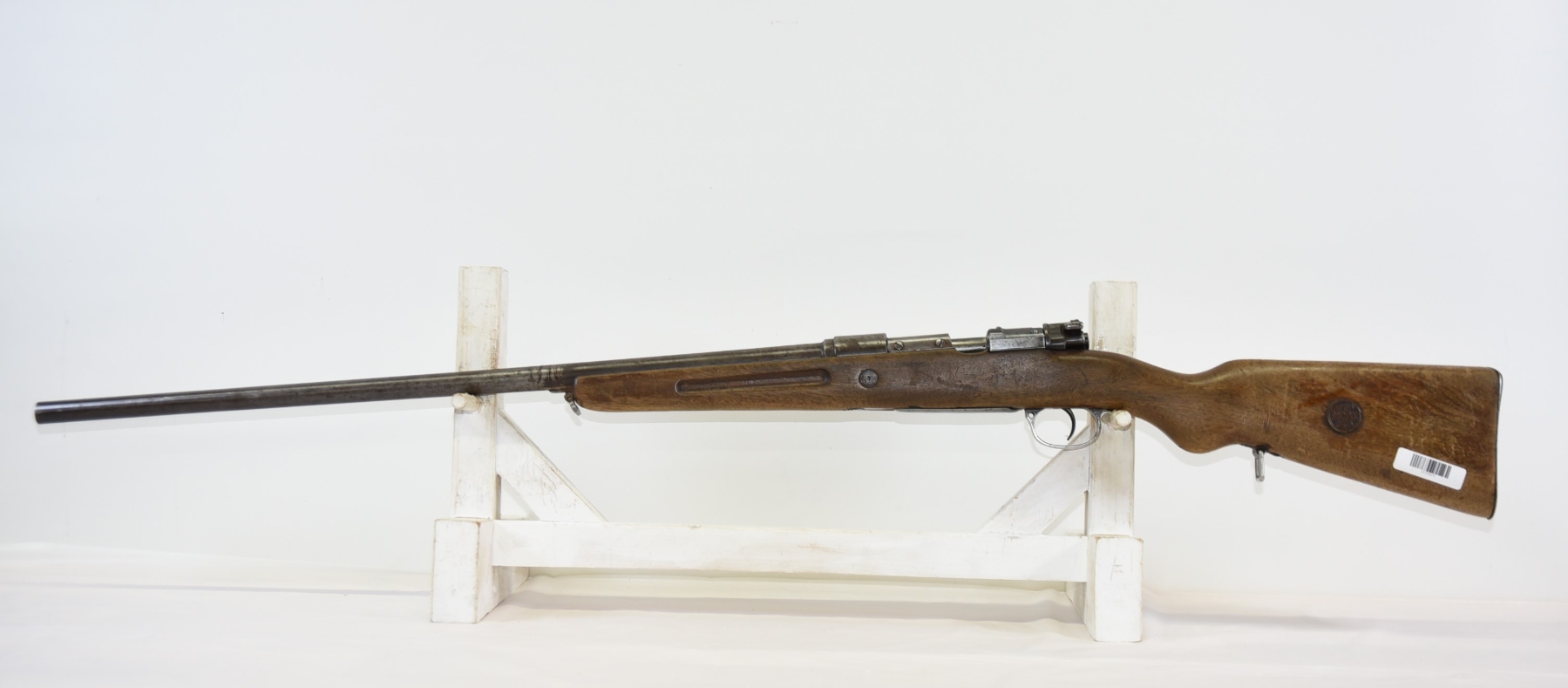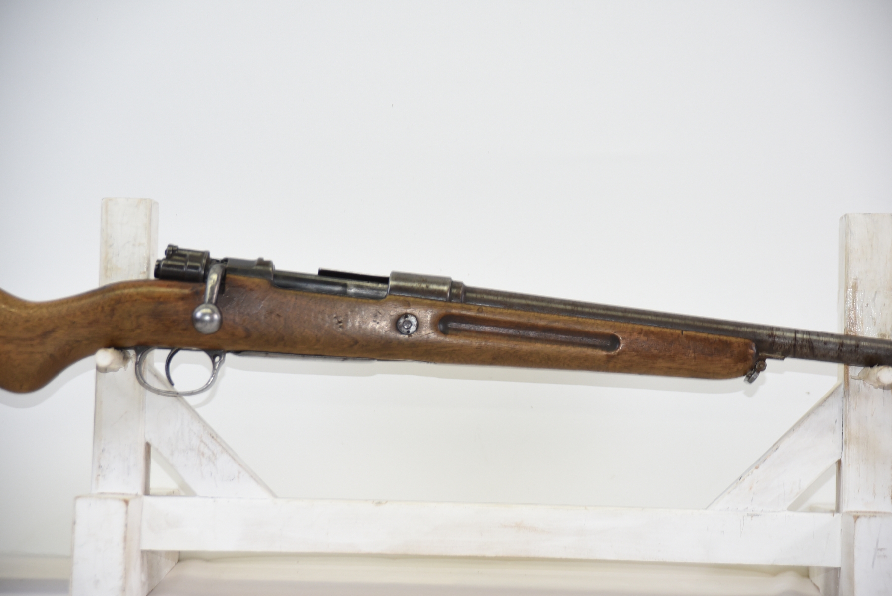 Metal finish shows scratches, scuffs, light rust throughout, front sight bead is missing; condition is less than fair.