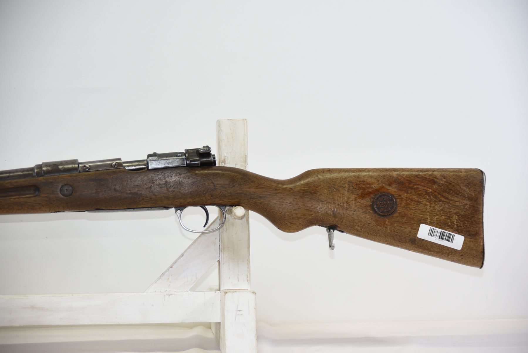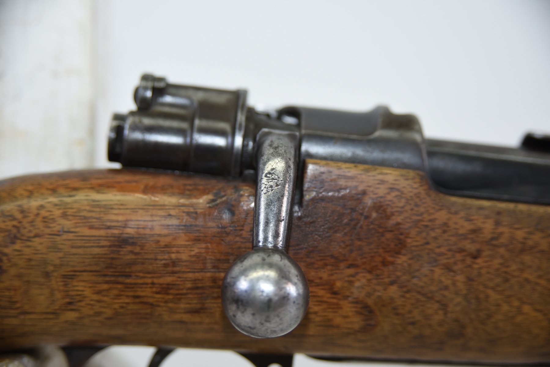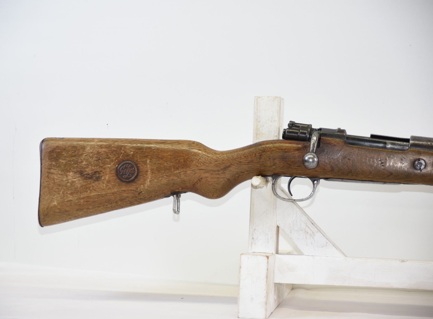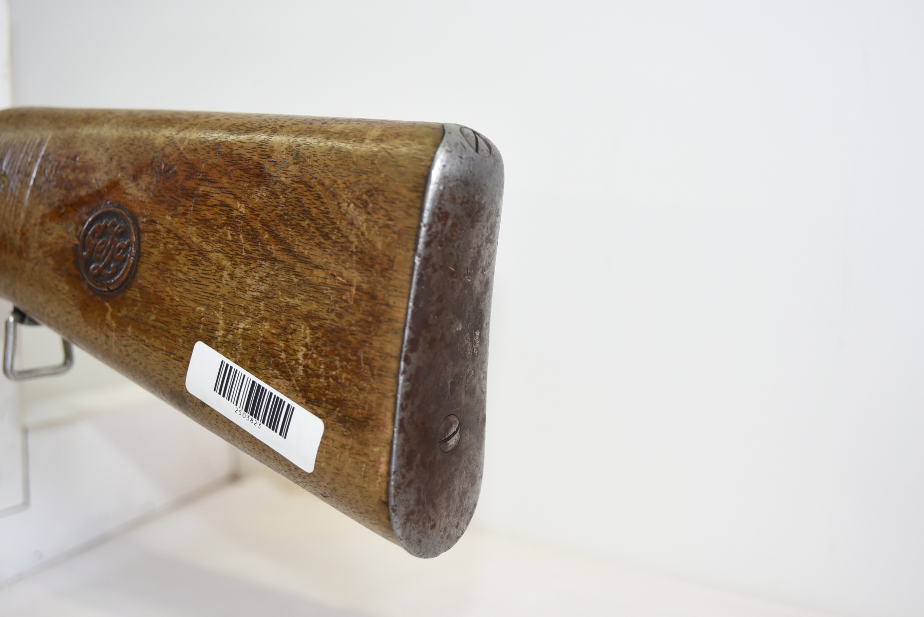 Wood stock shows worn finish, scratches, scuffs, light dents; condition is fair.
