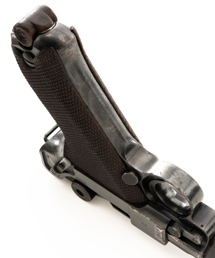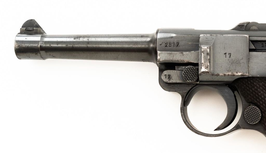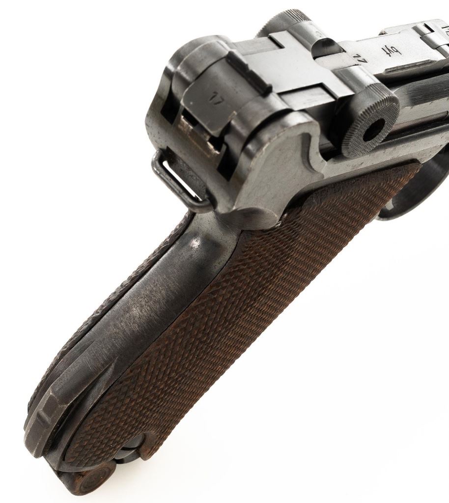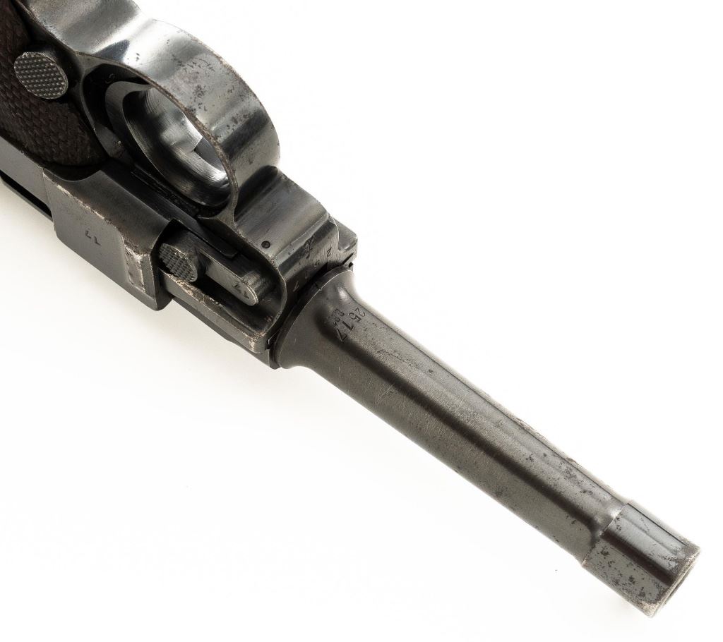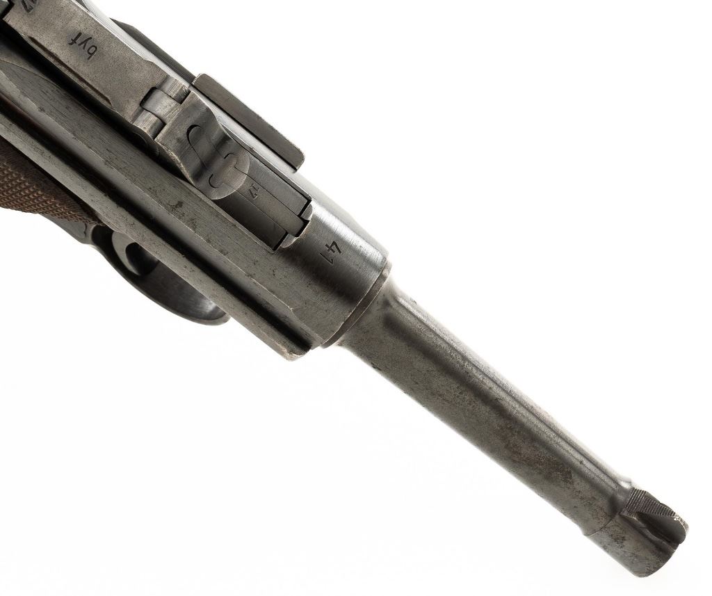 Mauser byf 41 Luger Semi-Automatic Pistol, #2517t, 9mm cal., 4" barrel, blued finish including small parts, checkered walnut grips, inverted-"V" front sight, fixed rear sight with small "V"-notched groove, and stock lug. Includes one mis-matched wood base magazine. Base is marked either "8932" or "3932", spine is numbered "795". Toggle is marked "byf" and "41" on top of chamber. Right side of receiver with Nazi eagle firing proof, and two "(eagle)655" acceptance marks. There is a small firing proof on right side and "(eagle)655" proof on left side of the barrel. Left side of frame is marked "P.08". All visible numbers matching except for the magazine, grips are not numbered. No import marks. Pistol is in very good condition, retaining approx. 92% blue, with mild frosting scattered throughout, salt and pepper blemishes along the front and backstrap, pitting along the lower edge of the sideplate. Finish wear is visible primarily at the muzzle, sideplate, front and back grip strap. Factory lettering and proof marks are legible. Grips are near excellent, showing typical light age and wear. Action and hold open function properly. Bore is bright throughout with very good rifling. Magazine with scattered frosted oxidation to the body. Est.: $1,400-$1,800. (C&R/PPT)