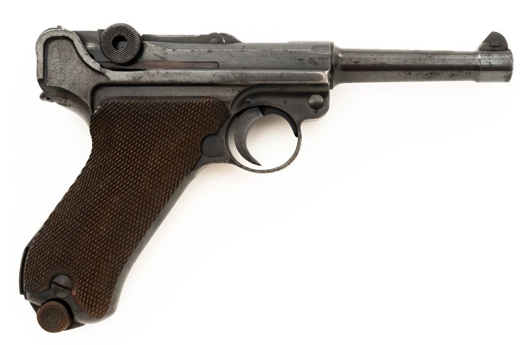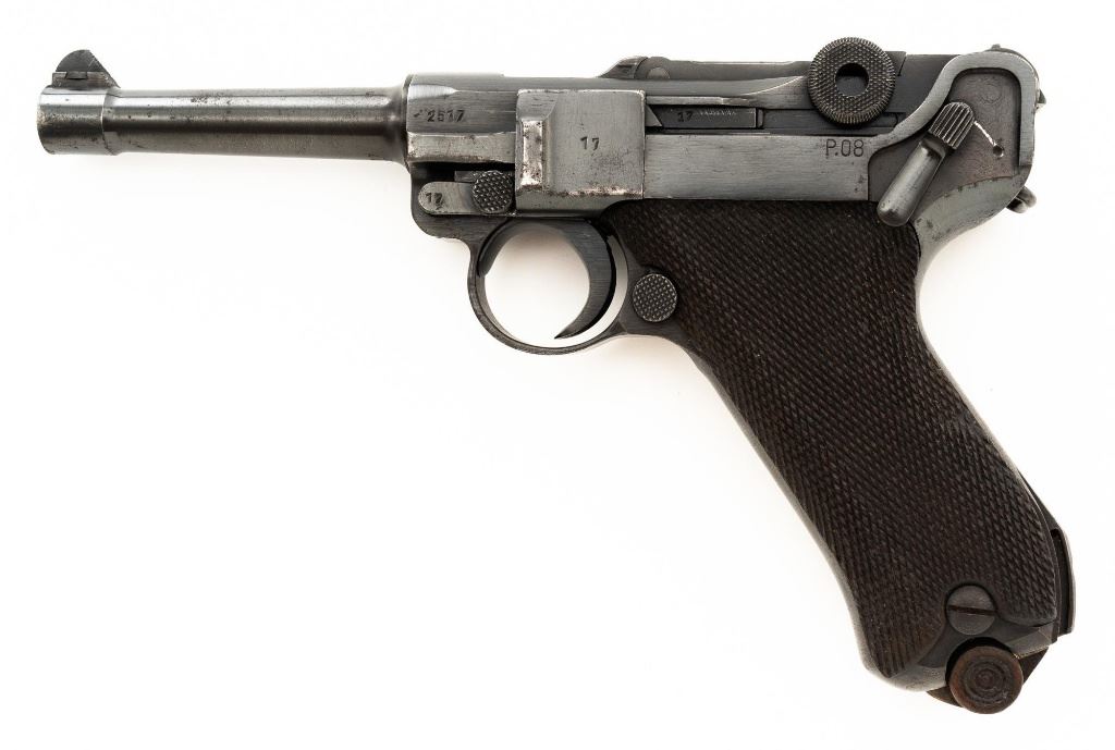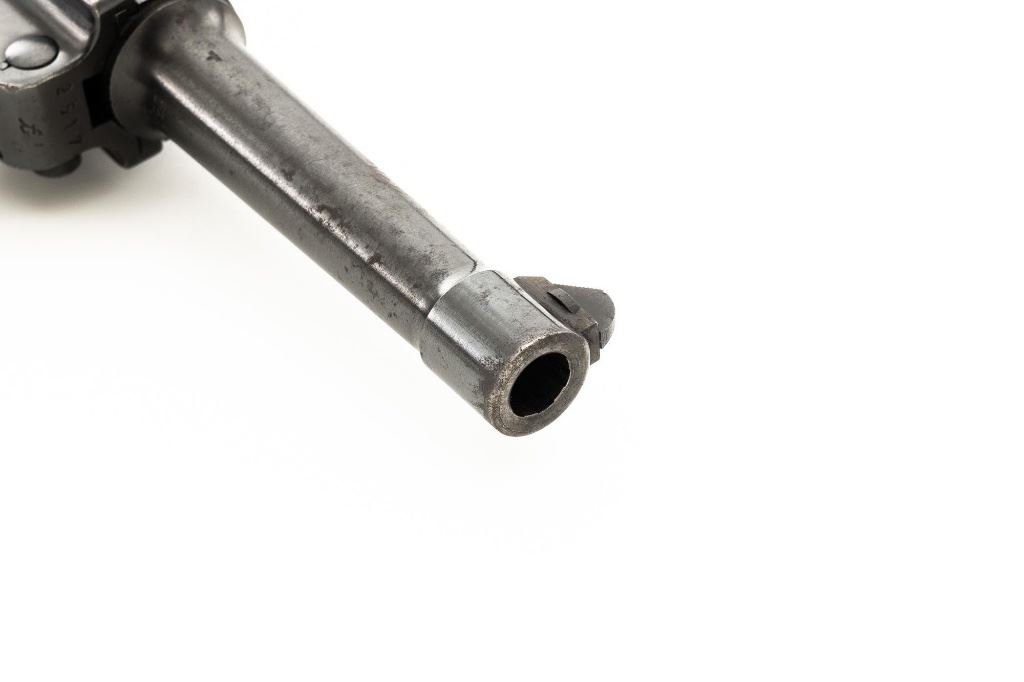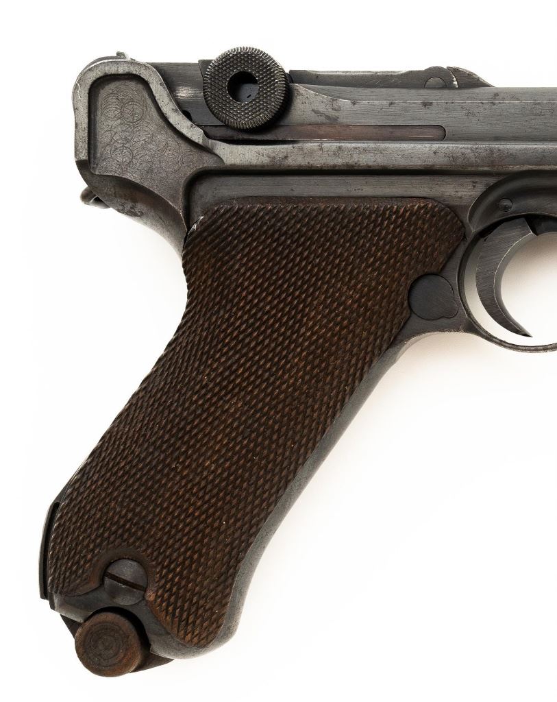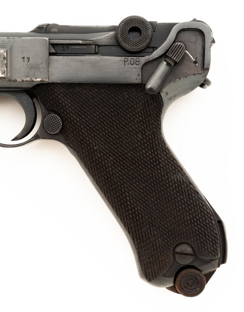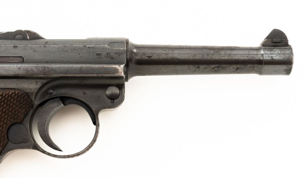Mauser byf 41 Luger Semi-Automatic Pistol, #2517t, 9mm cal., 4" barrel, blued finish including small parts, checkered walnut grips, inverted-"V" front sight, fixed rear sight with small "V"-notched groove, and stock lug. Includes one mis-matched wood base magazine. Base is marked either "8932" or "3932", spine is numbered "795". Toggle is marked "byf" and "41" on top of chamber. Right side of receiver with Nazi eagle firing proof, and two "(eagle)655" acceptance marks. There is a small firing proof on right side and "(eagle)655" proof on left side of the barrel. Left side of frame is marked "P.08". All visible numbers matching except for the magazine, grips are not numbered. No import marks. Pistol is in very good condition, retaining approx. 92% blue, with mild frosting scattered throughout, salt and pepper blemishes along the front and backstrap, pitting along the lower edge of the sideplate. Finish wear is visible primarily at the muzzle, sideplate, front and back grip strap. Factory lettering and proof marks are legible. Grips are near excellent, showing typical light age and wear. Action and hold open function properly. Bore is bright throughout with very good rifling. Magazine with scattered frosted oxidation to the body. Est.: $1,400-$1,800. (C&R/PPT)