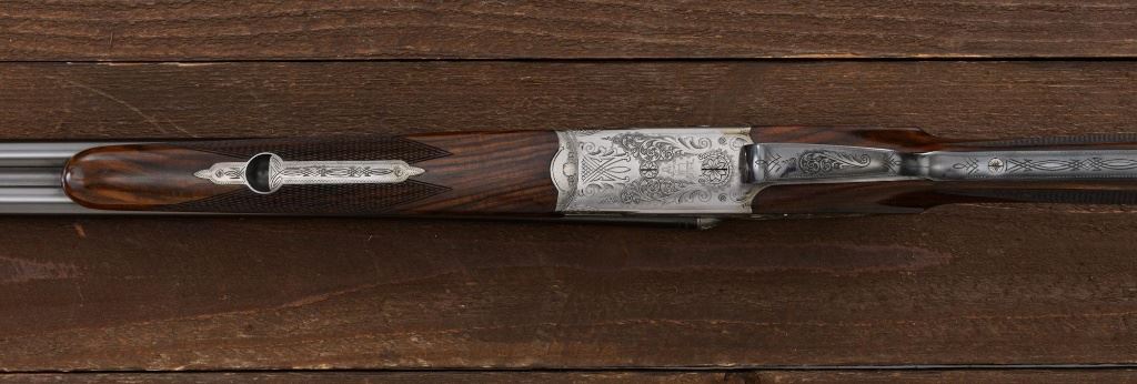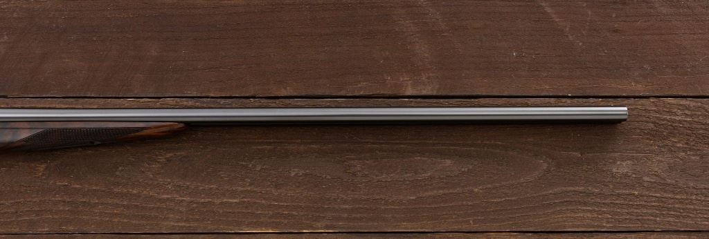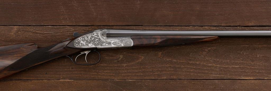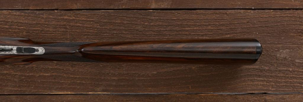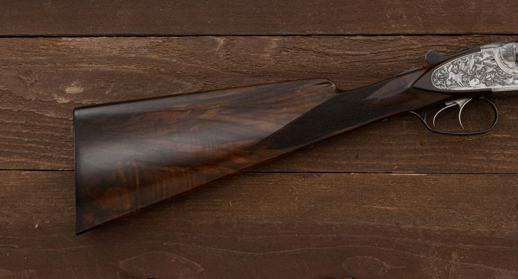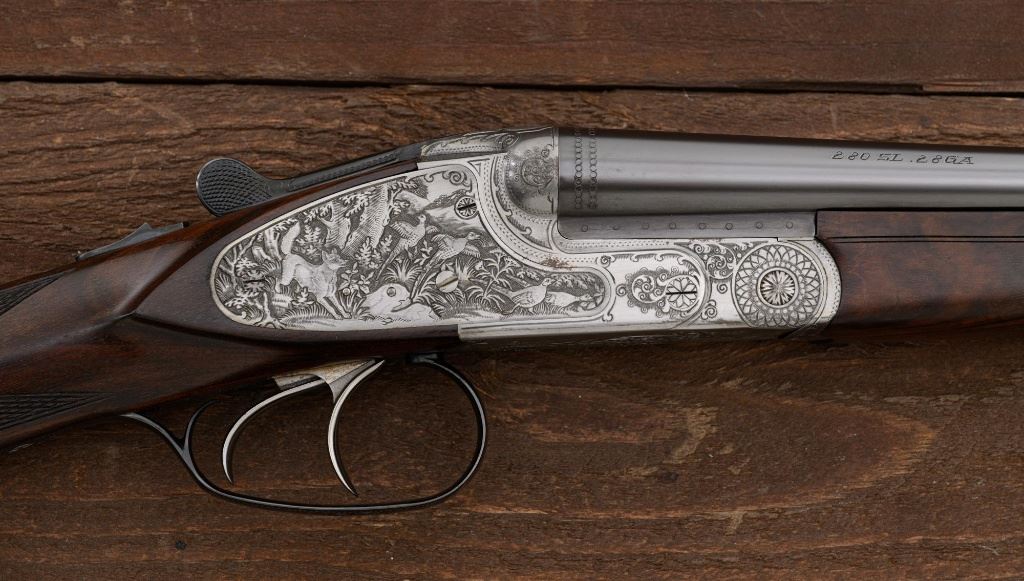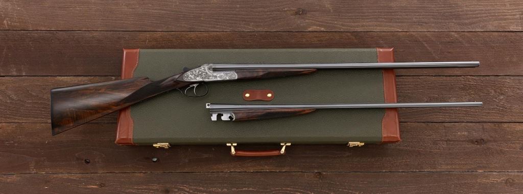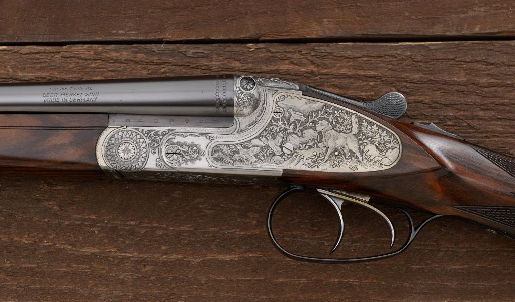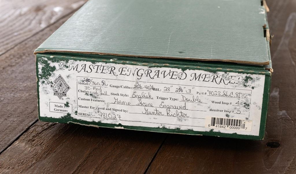 Merkel Model 280SL/360SL Two Barrel Side-by-Side Shotgun Set, #481027, and marked "No. 28 of 100". The 28 ga., 28" barrels are marked "481027-1", have a matted solid rib, 2-3/4" chambers and are choked Mod/Full. The .410 bore, 28" barrels are marked "481027-2", have 3" chambers, and are choked Full/Full. Coin-finished sidelock action features a double underlug lockup with Greener cross bolt, double triggers, automatic safety, and selective ejectors. Sidelocks are ornately engraved with game scenes, including a setter flushing grouse on the left hand side, a fox flushing same on the right hand side, ornate scroll patterns with "Suhl" logo on the bottom. Top tang and forend iron are likewise coin-finished; top lever, trigger guard, and lower tang are blue. Both splinter forends and the straight grip buttstock are "D" grade European walnut, satin finished and checkered at 20 LPI. Stock dimensions are 14-1/2" x 1-3/8" x 2-1/2". Two-barrel set was completed in approx. 2000 and is contained in a Merkel fitted luggage hard case. Original Merkel shipping box is also included. Condition is as new, with virtually no marks to the wood, and some opening and closing wear to the breech face. Action closes tight however, and functions correctly; bores are all mirror bright. Est.: $10,000 - $12,000. (Modern)