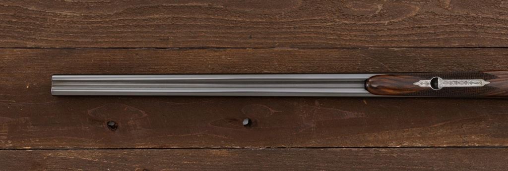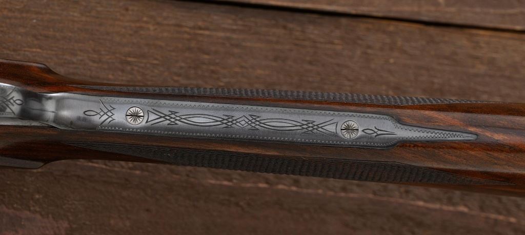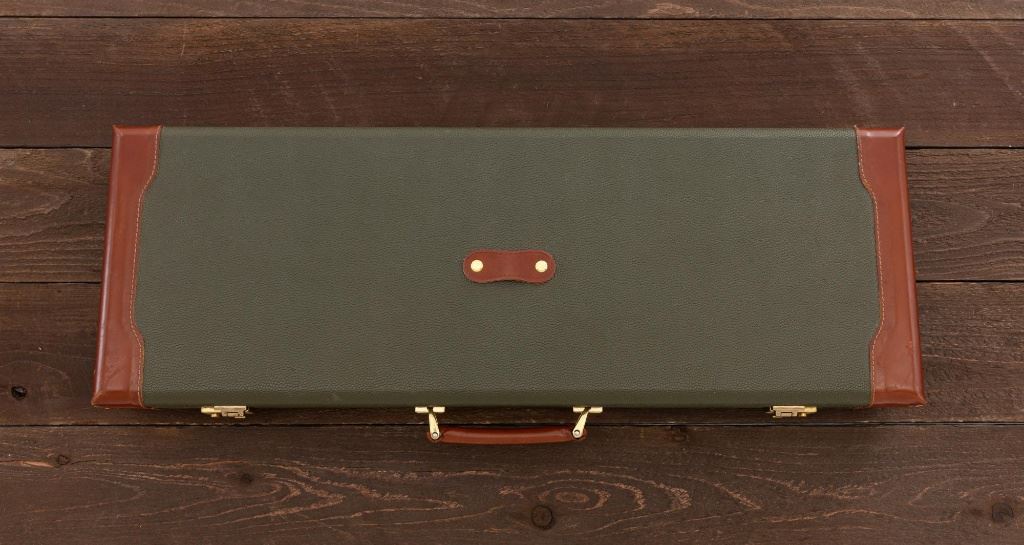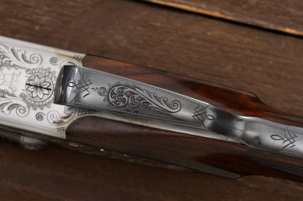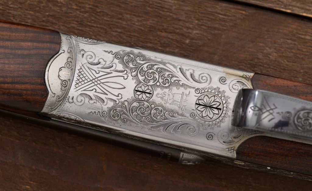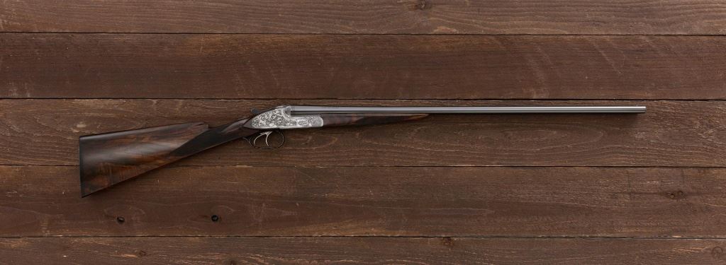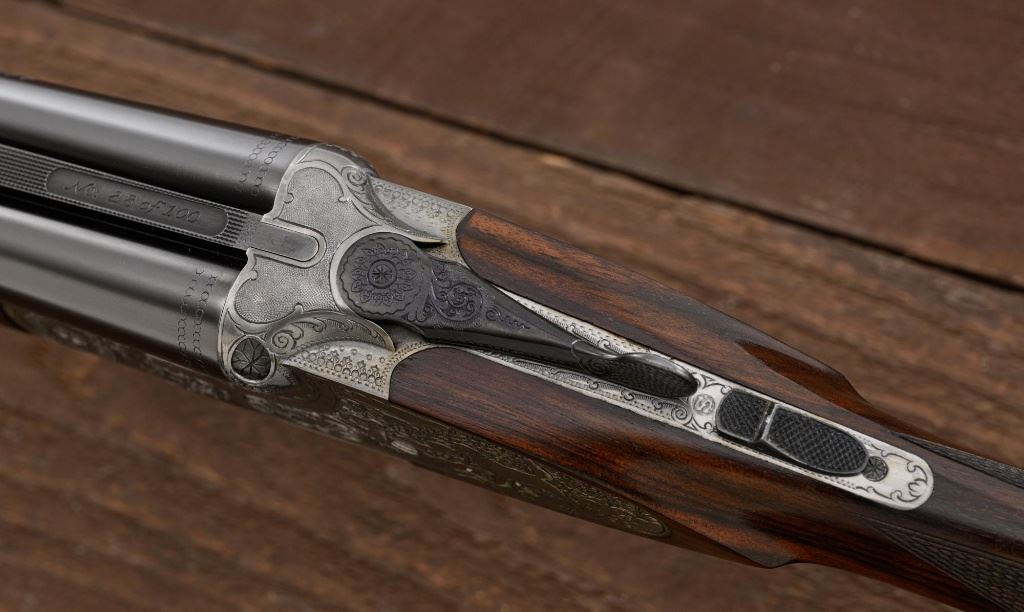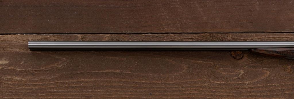 Merkel Model 280SL/360SL Two Barrel Side-by-Side Shotgun Set, #481027, and marked "No. 28 of 100". The 28 ga., 28" barrels are marked "481027-1", have a matted solid rib, 2-3/4" chambers and are choked Mod/Full. The .410 bore, 28" barrels are marked "481027-2", have 3" chambers, and are choked Full/Full. Coin-finished sidelock action features a double underlug lockup with Greener cross bolt, double triggers, automatic safety, and selective ejectors. Sidelocks are ornately engraved with game scenes, including a setter flushing grouse on the left hand side, a fox flushing same on the right hand side, ornate scroll patterns with "Suhl" logo on the bottom. Top tang and forend iron are likewise coin-finished; top lever, trigger guard, and lower tang are blue. Both splinter forends and the straight grip buttstock are "D" grade European walnut, satin finished and checkered at 20 LPI. Stock dimensions are 14-1/2" x 1-3/8" x 2-1/2". Two-barrel set was completed in approx. 2000 and is contained in a Merkel fitted luggage hard case. Original Merkel shipping box is also included. Condition is as new, with virtually no marks to the wood, and some opening and closing wear to the breech face. Action closes tight however, and functions correctly; bores are all mirror bright. Est.: $10,000 - $12,000. (Modern)
