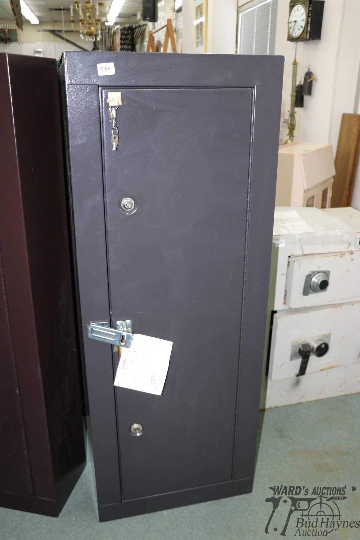 Metal gun locker with space for 12 long guns and three shelves for ammo, double locks and added combination lock, measures 55" H X 21" W X 16" D. Has keys
