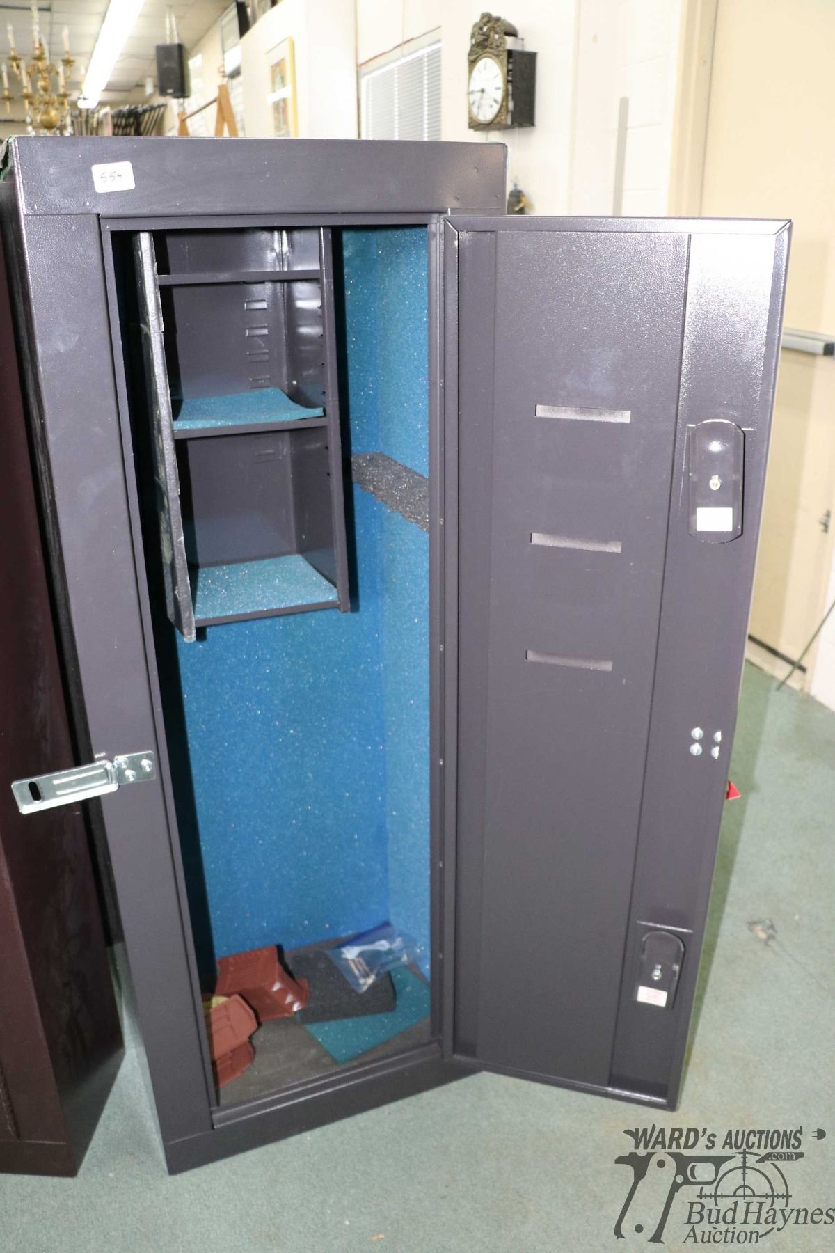 Metal gun locker with space for 12 long guns and three shelves for ammo, double locks and added comb