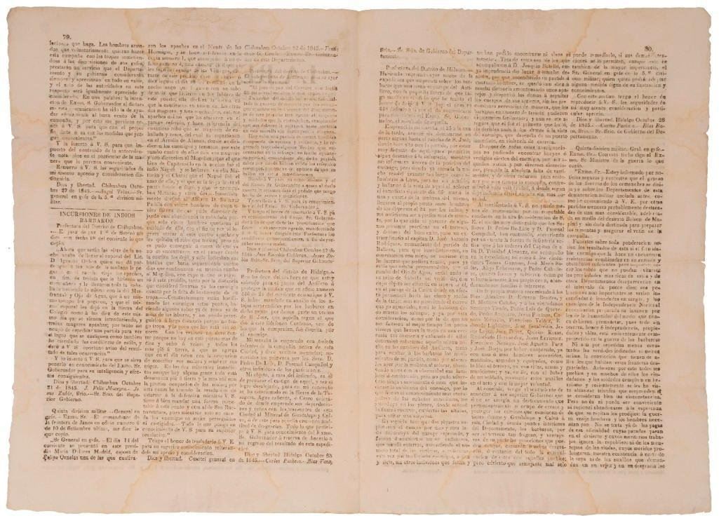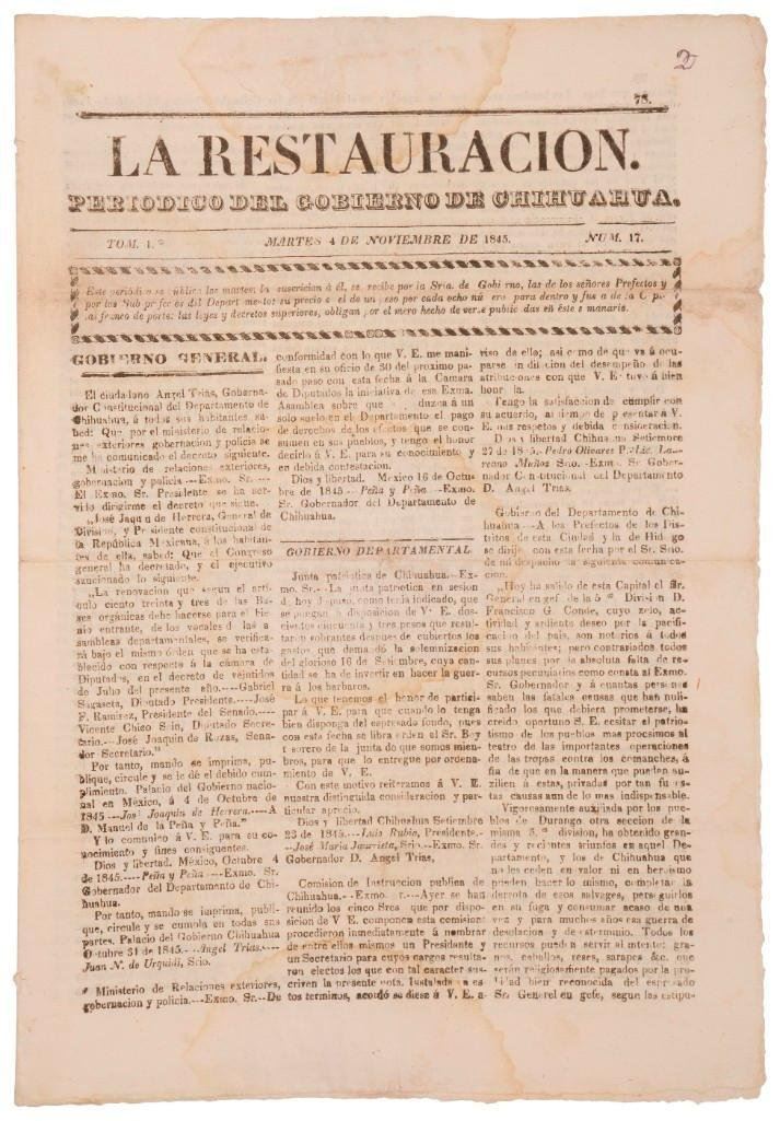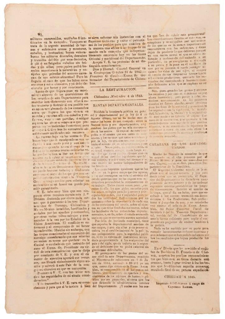 8.75" x 12.5". Mexican "La Restauracion" publication by the Government of the State of Chihuahua. Discusses the deployment of military troops against Comanche and Apache raiders, as well as encouraging volunteers to join the campaign. Includes English translation. **Good condition overall. Some minor water stains with some wear to corners and edges of document.** $100-$300