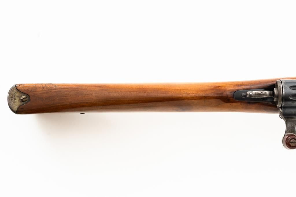 Modified Swiss 96/11 Schmidt-Rubin Straight Pull Rifle with Scope, #288443, 7.5x55mm cal., 20" barrel, blued finish, hardwood stock, with one detachable magazine. Issue sights have been removed. Topped with a Burris mount and 2-3/4x Burris scope. In near excellent condition, with light handling marks to the tube, optics are bright and clear. Rifle has been modified by shortening the barrel and stock forend, and removing the military hardware. Matching numbers on the barrel and magazine. Bolt does not match. No visible import marks. Condition overall is very good as modified, retaining approx. 80% blue, with some spots of light rust patina on the barrel, thinning and toning to the receiver and trigger guard. Wood is very good, with scattered scratches and handling marks. Action operates smoothly. Bore is bright with very good rifling. Est.: $250-$400. (Modern)
