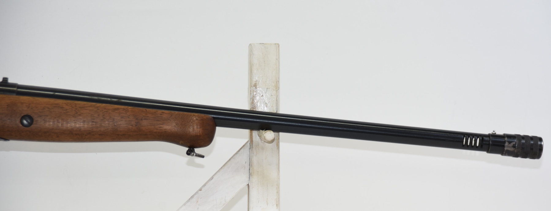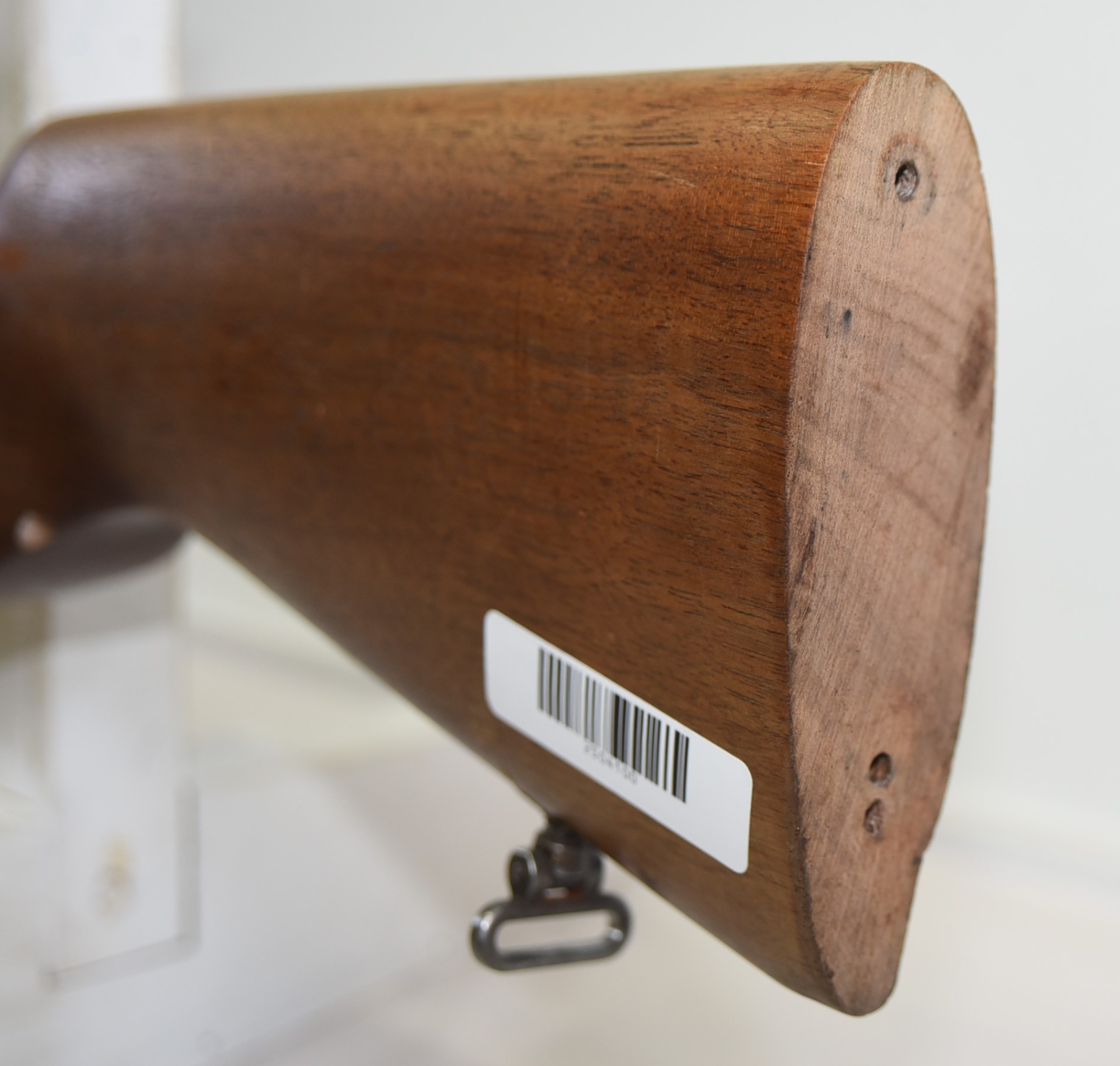 Wood stock shows missing butt plate due to shortening of the stock, there are scratches and scuffs, dents, a chip in the rear; condition is fair.