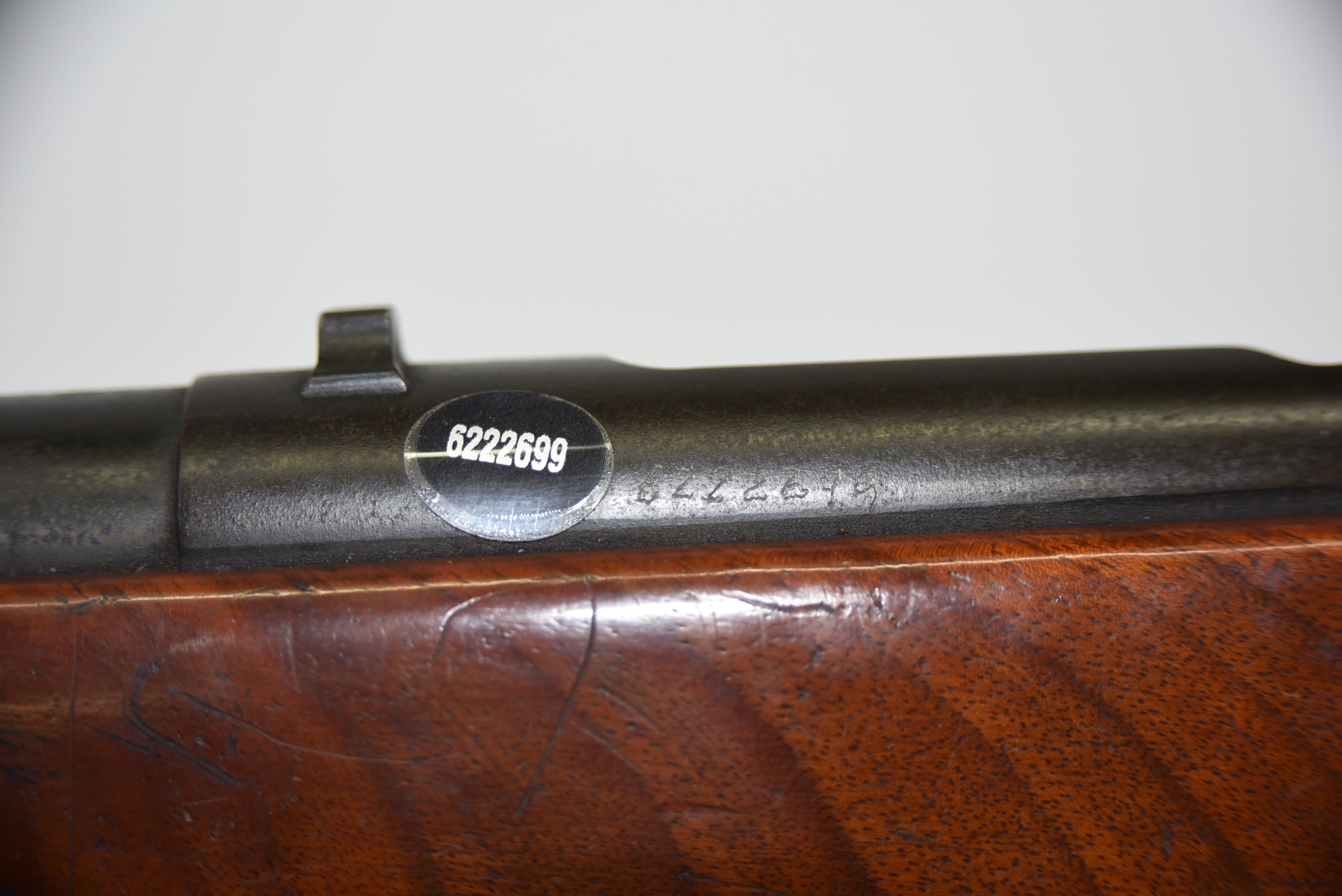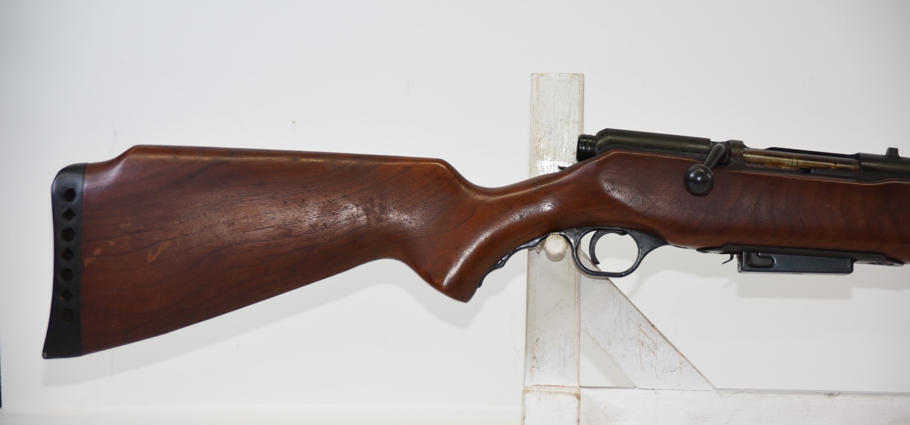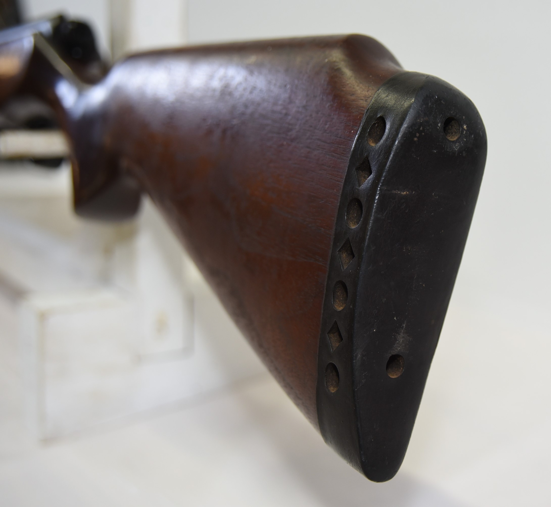 Wood stock shows scratches & scuffs, there are some light dents, rear recoil pad has hardened; condition is good.