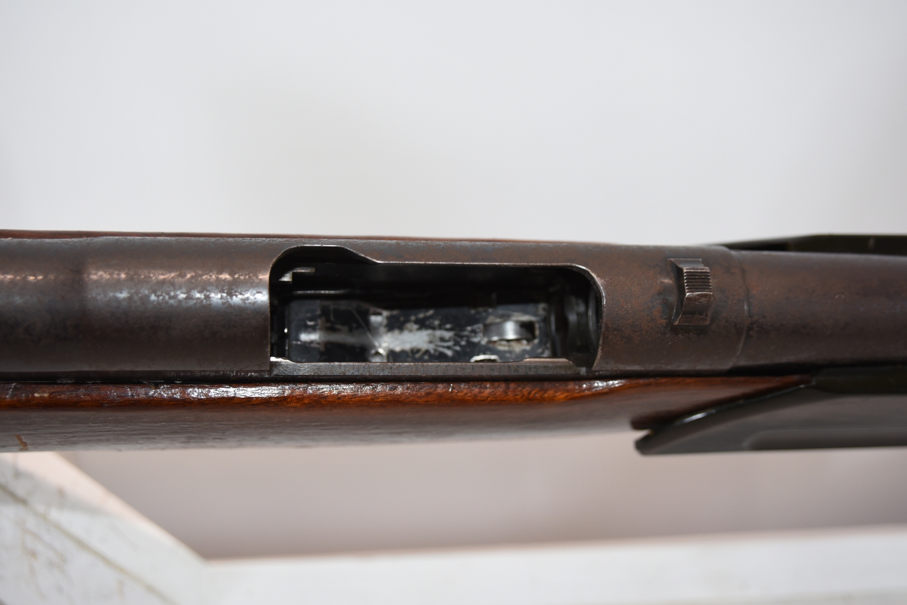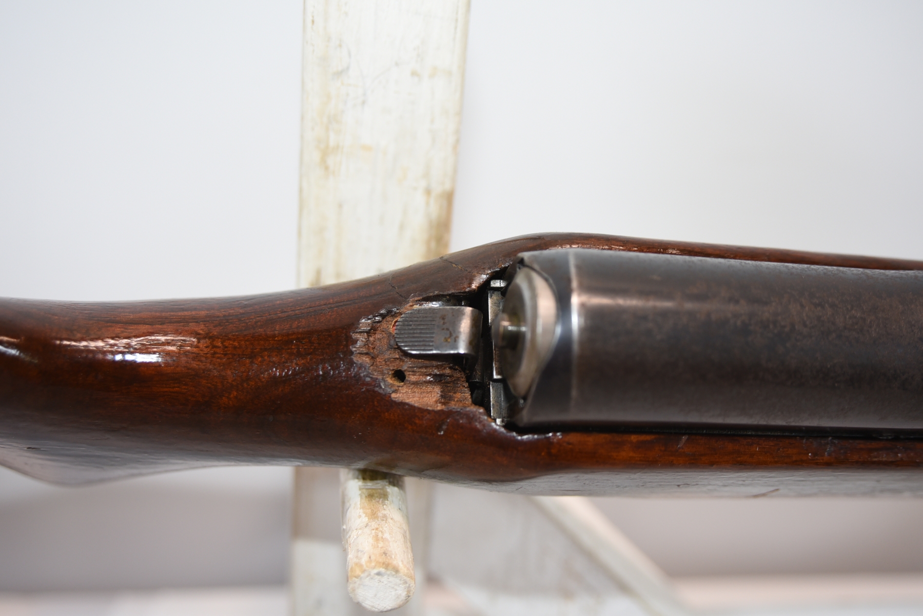 Wood stock shows long fine cracks on either side of the stock. Stock has been revarnished. Top area behind the receiver is missing a piece of the stock. Condition is poor.