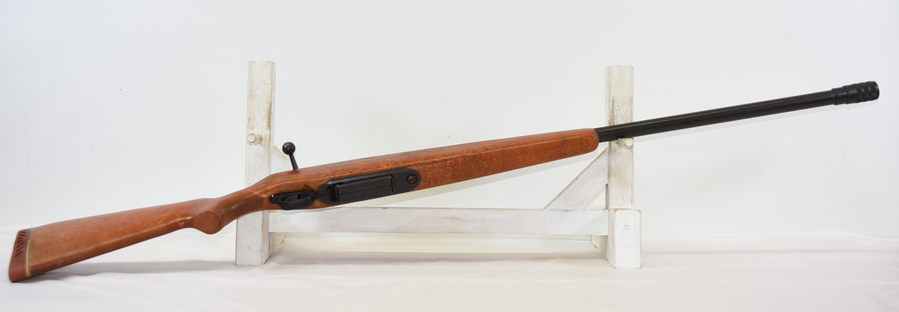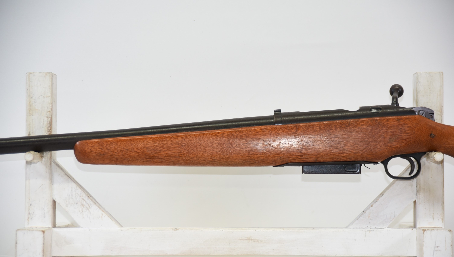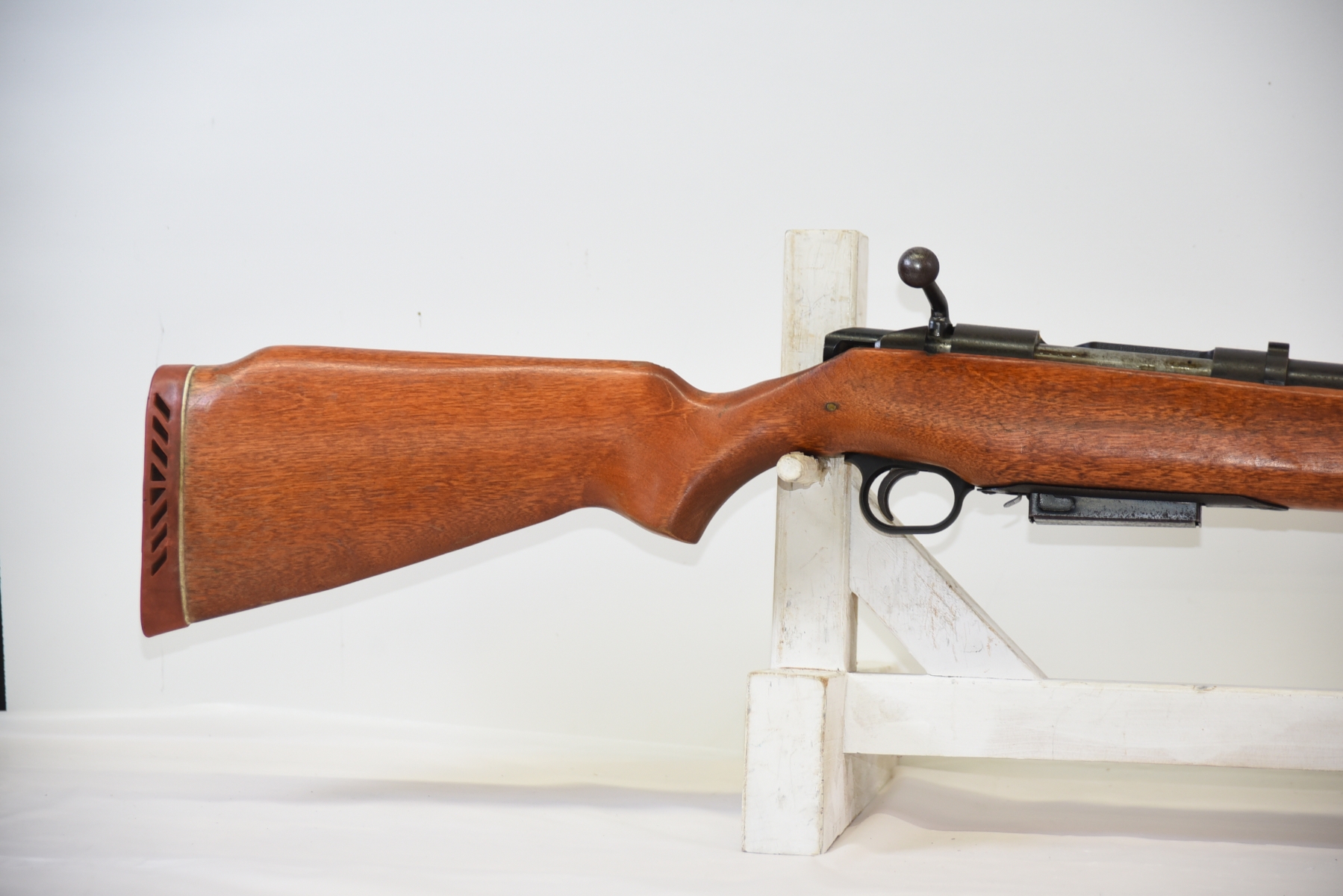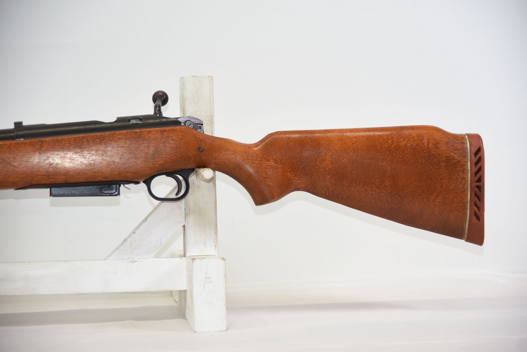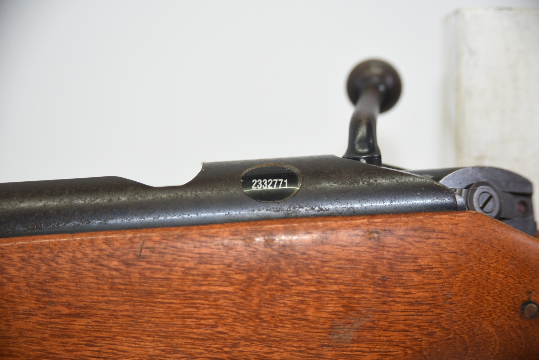 Wood stock shows some scratches, scuffs, there is a 3" long fine crack behind the bolt area; condition is fair.