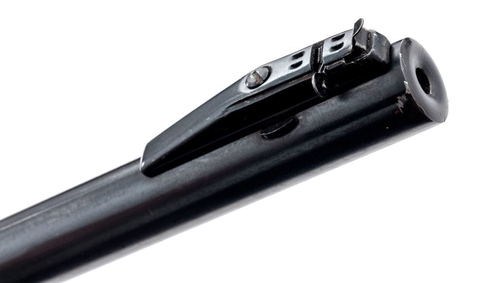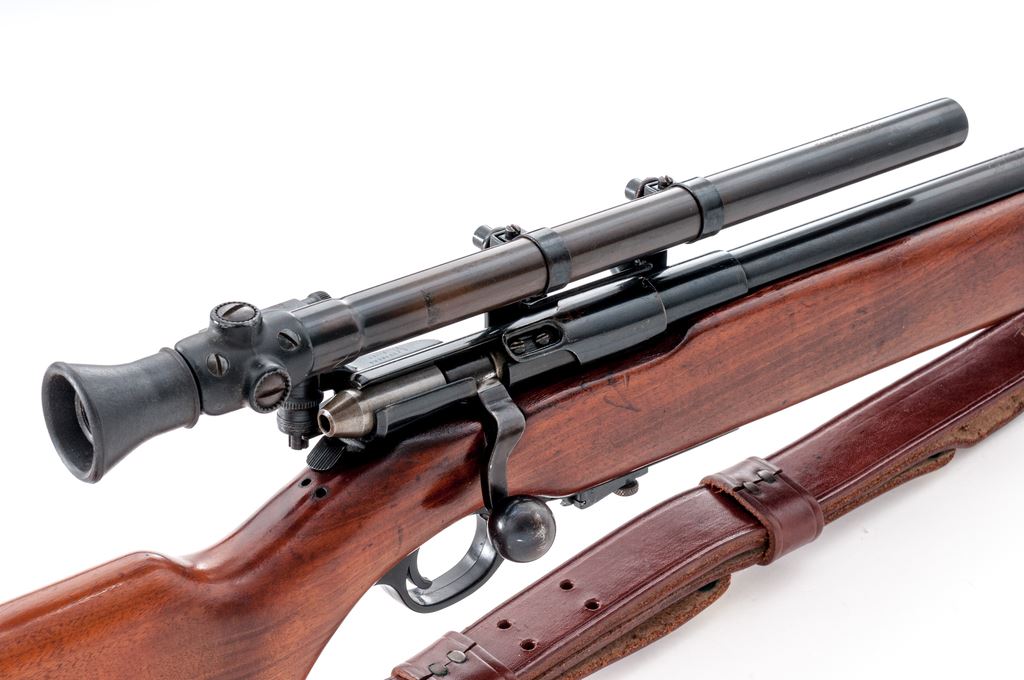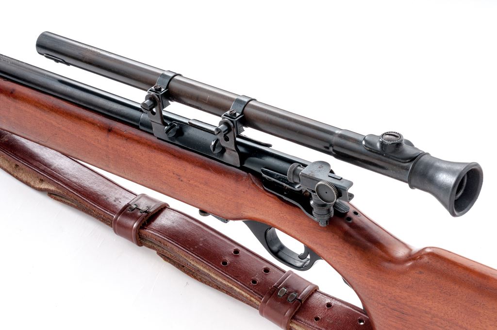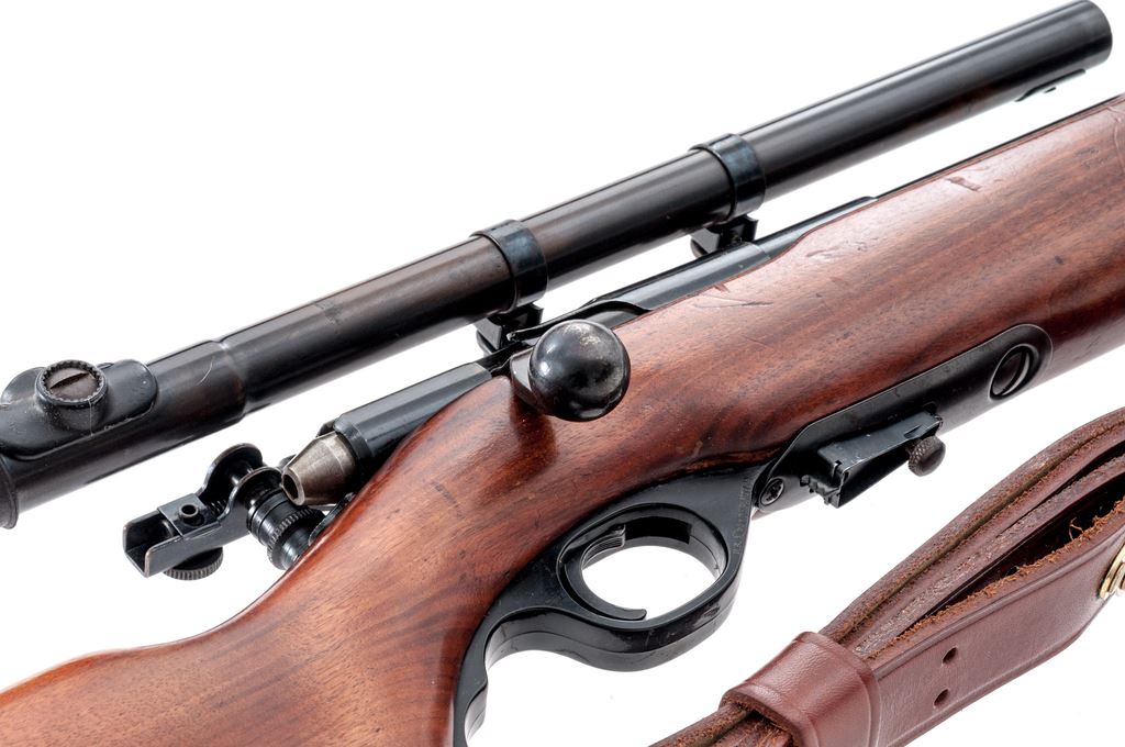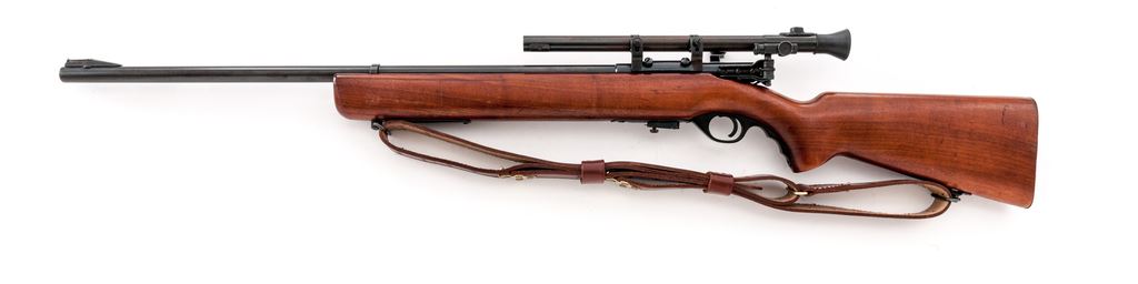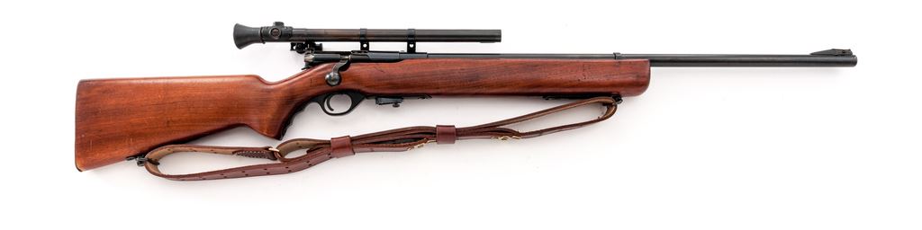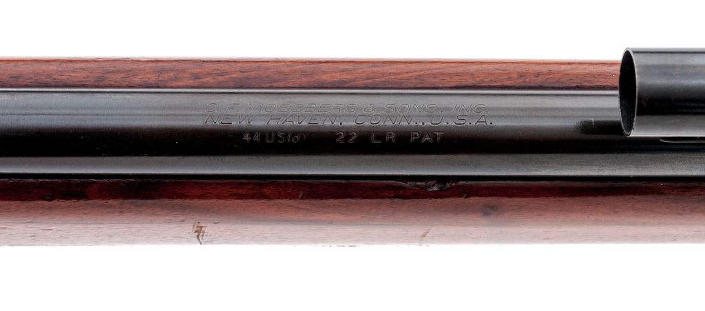 Mossberg Model 44US (D) Bolt Action Rifle, NVSN, .22 LR cal., 26'' barrel, blue finish, pistol-grip walnut stock, with Mossberg target sights, one factory magazine and reproduction M1907 sling. Topped with Mossberg scope and scope mounts. Condition is excellent retaining approx. 96% lightly toning blue; 4-power scope body has toned a little more. Stock with very light scratches and mild impressions from handling and range use. Good action, bright bore, clear scope optics. Sling is excellent. Est.: $250-$400. (C&R)