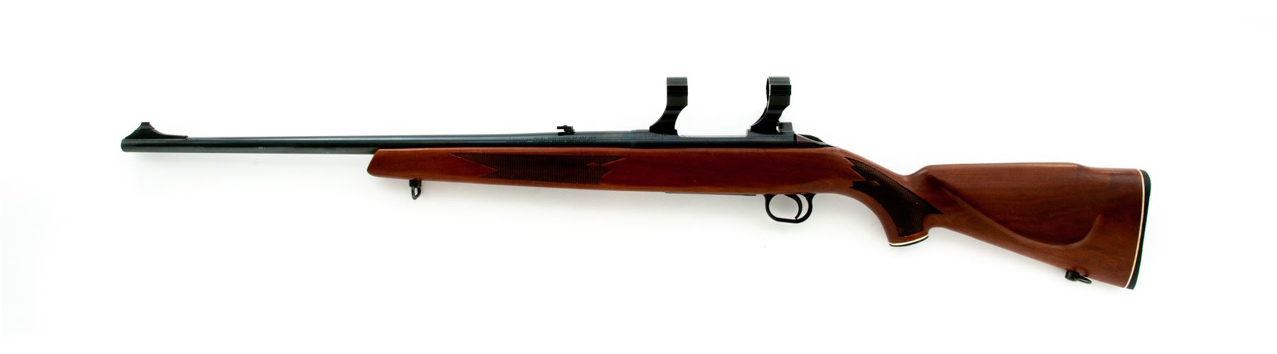Mossberg Model 800C Bolt Action Rifle, #1049105, .22-250 cal., 22'' barrel, blue finish, dovetailed front sight with brass bead and folding rear sight; satin finished one-piece walnut stock with cheekpiece is checkered at both the wrist and pistol grip, black plastic buttplate and grip cap both with a white spacer, and sling swivel studs. Rifle is also fitted with two-piece scope rings and features a bolt mounted safety. Overall condition is excellent with approx. 98%+ factory finishes. Wood and metal with normal intermittent light handling marks; factory lettering is clear. Stock checkering shows no mentionable wear. Edge of pistol grip with a few small impressions. Excellent action and bright bore. Est.: $250-$400. (Modern)