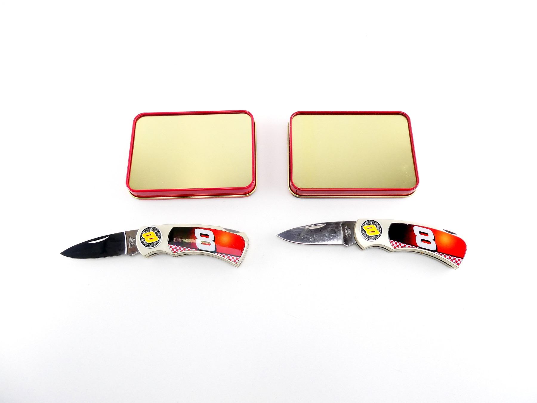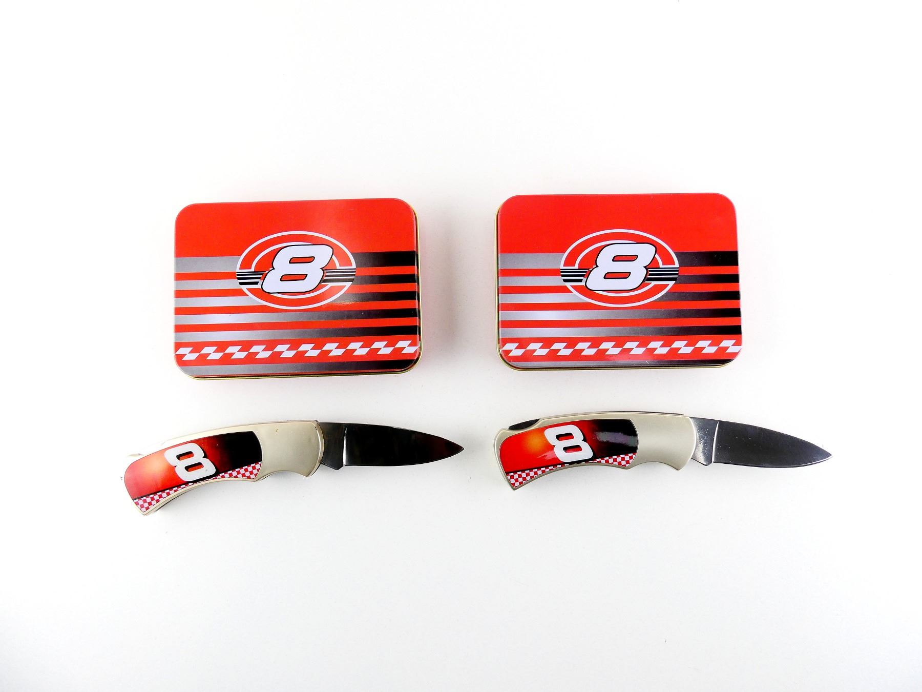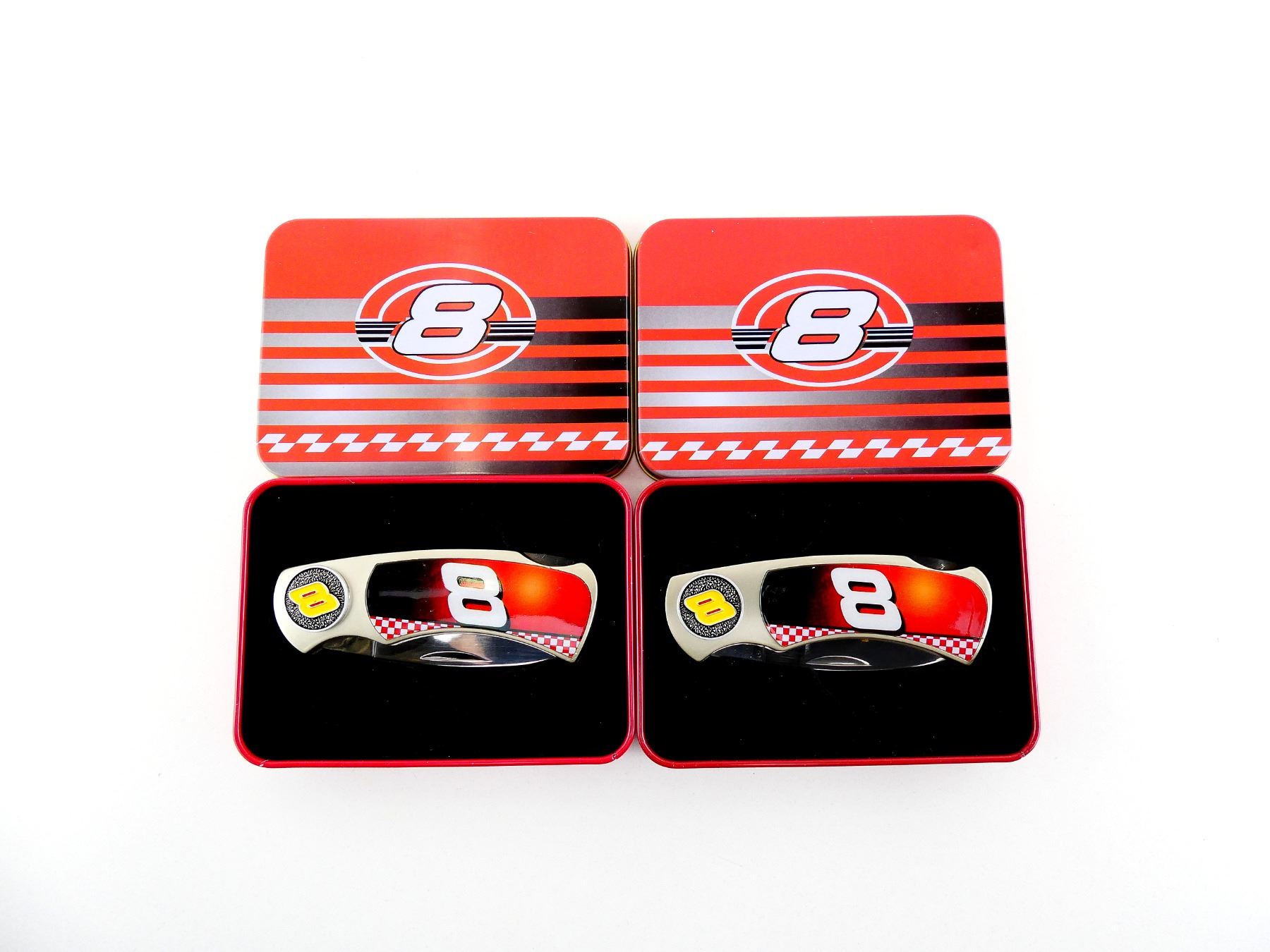 LOT INCLUDES; (2) DALE EARNHARDT JR. FOLDING KNIVES, STAINLESS STEEL BLADE, MARKED: "CHINA", WITH POLYMER HANDLES, HANDLES MARKED: "8", WITH COLLECTABLE DISPLAY TIN, BLADE OVERALL LENGTH APPROX. 3", TIN APPROX 5" X 3.5" X 1". SEE PHOTOS.