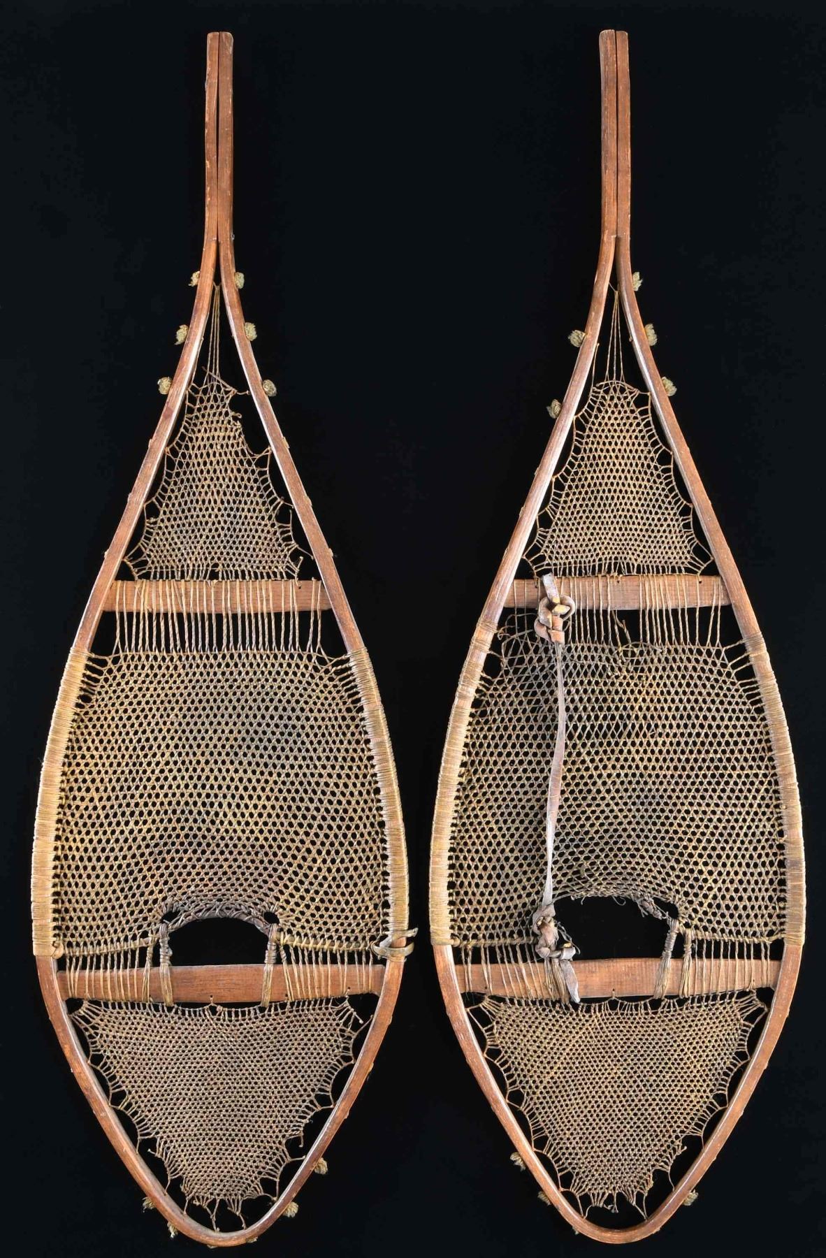 This pair of Native American snowshoes likely originated with the Ojibwe tribe of the Quebec and Great Lakes area. The shoes measure approx. 44" long x 14" wide. They have finely and intricately woven rawhide centers with wooden frames and supports. There are tufts of wool at the top and bottom sides of the snowshoes. CONDITION: as expected, a few of the rawhide strands are broken or detached. Some of the wool tufts on the sides are worn away. Structurally, the snowshoes are excellent. PROVENANCE: from the renowned collection of quality sporting arms from Lewis Drake together with inventory of Lewis Drake Associates. (02-23616/BF). $400-600.