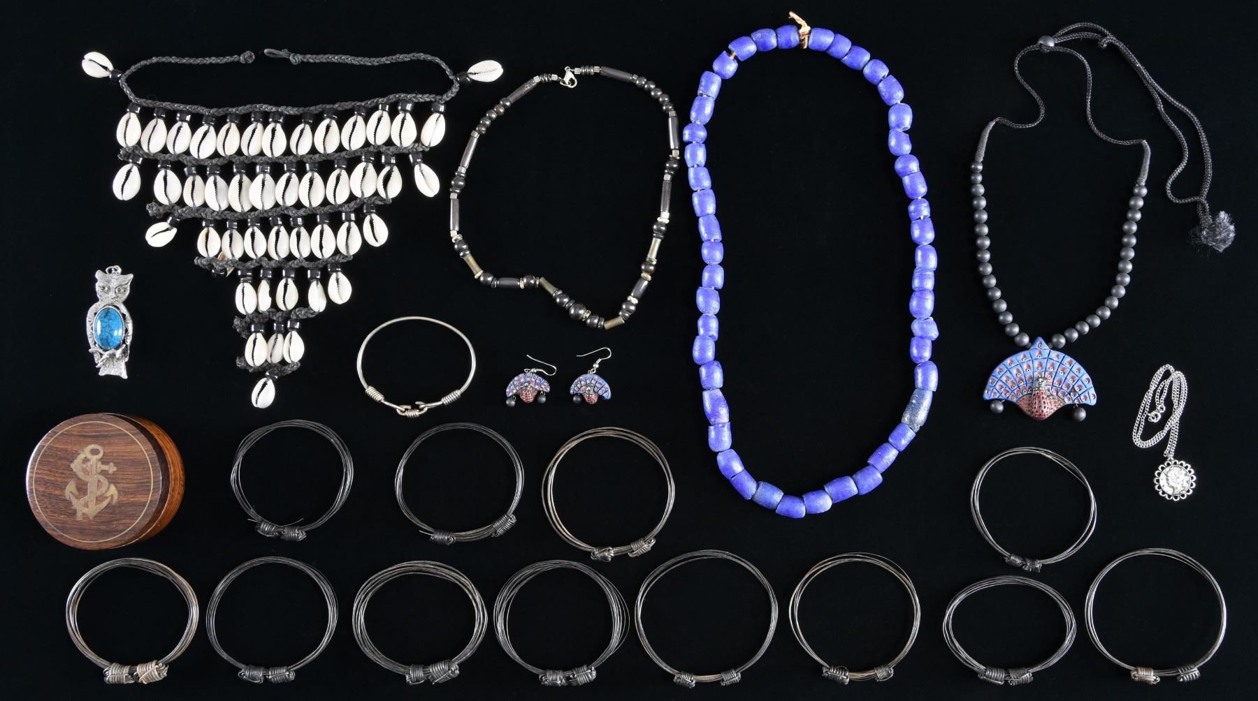 This lot consists of 1 strand of blue glass barrel-shaped beads measuring 25" in total length. / 1 woven 6-level 16" necklace made of black beads and cut cowrie shells. / 1 tubular and round bead necklace measuring 18" overall, possibly made of black coral. / 1 silver looped bracelet. / 1 silver or plate mercury dime necklace. / 1 handmade round wooden box measuring 3" in diameter with an anchor inset in the top. / 1 owl pendant of unknown construction. / 1 peacock motif necklace and earrings made of terracotta. / 70 woven black, likely African, bracelets. CONDITION: all items are complete and show light wear. PROVENANCE: from the renowned collection of quality sporting arms from Lewis Drake together with inventory of Lewis Drake Associates. (02-23573-4/BF). $200-400.